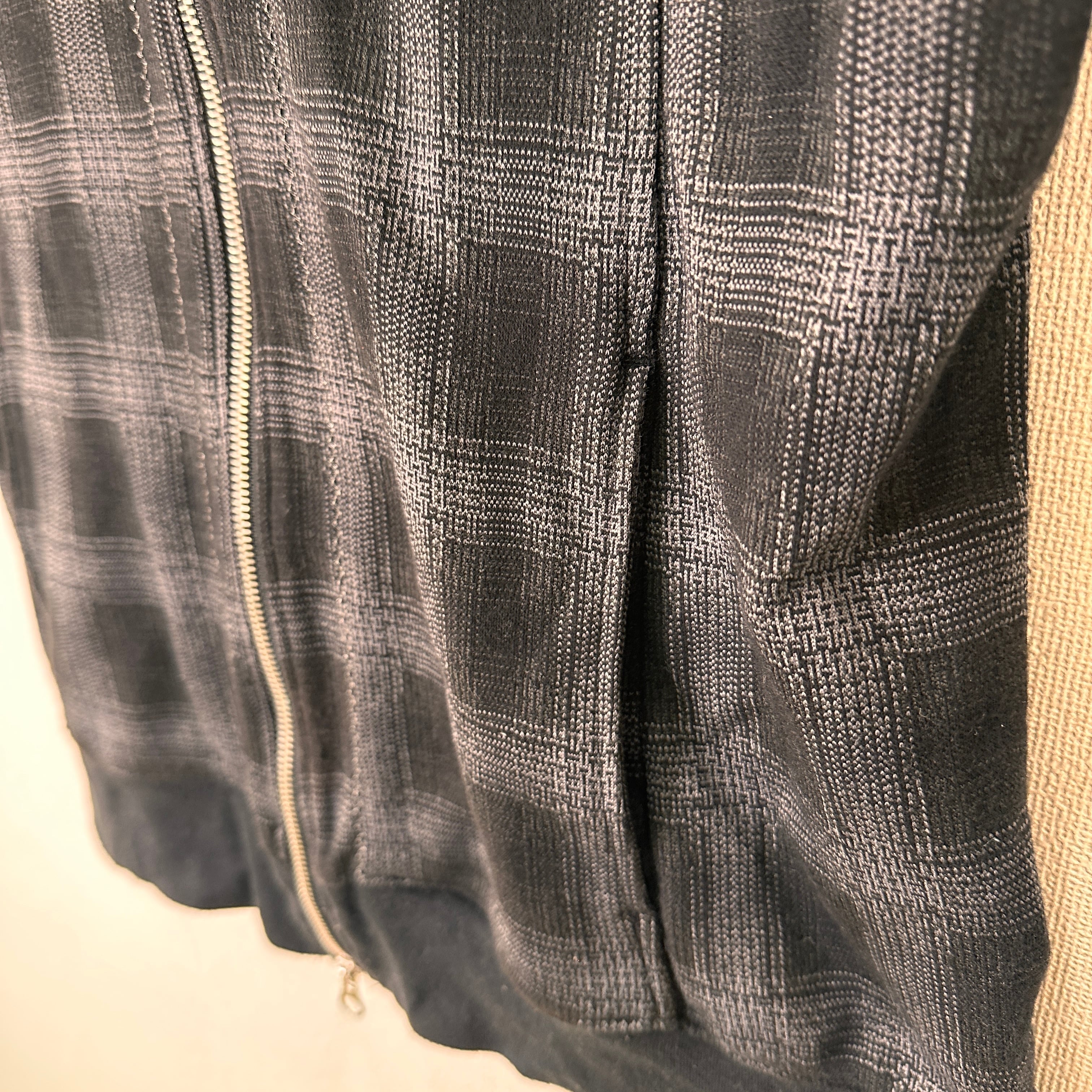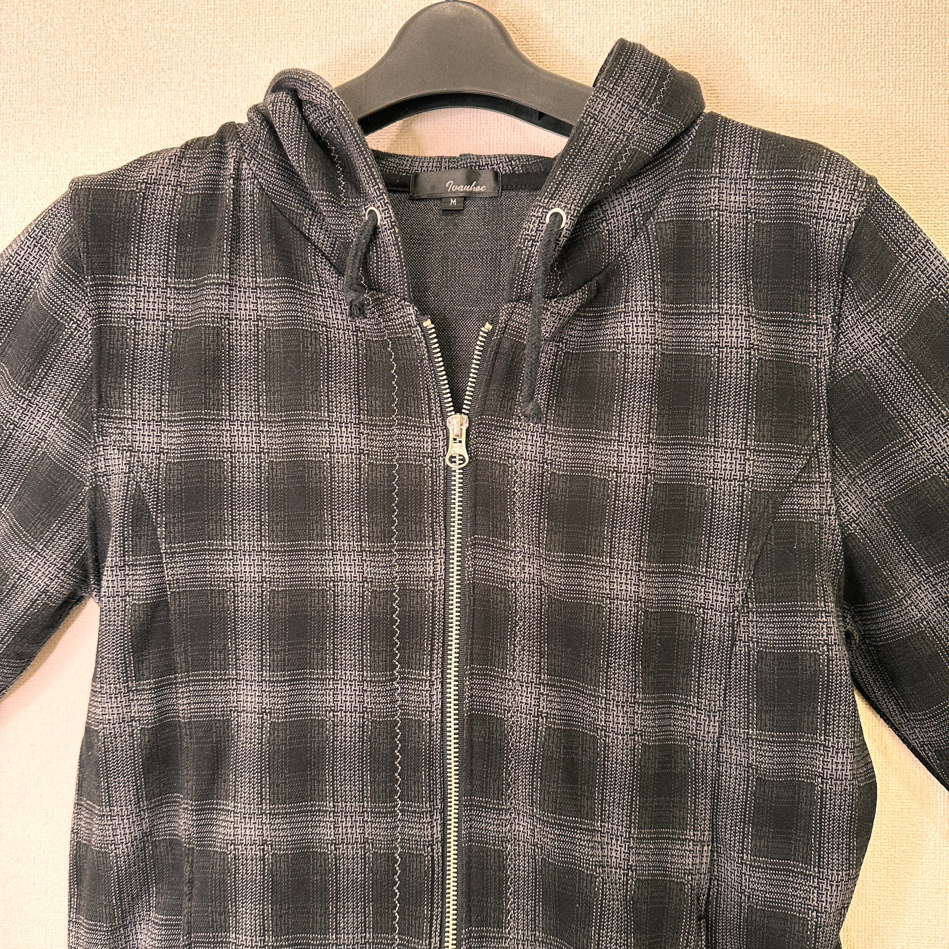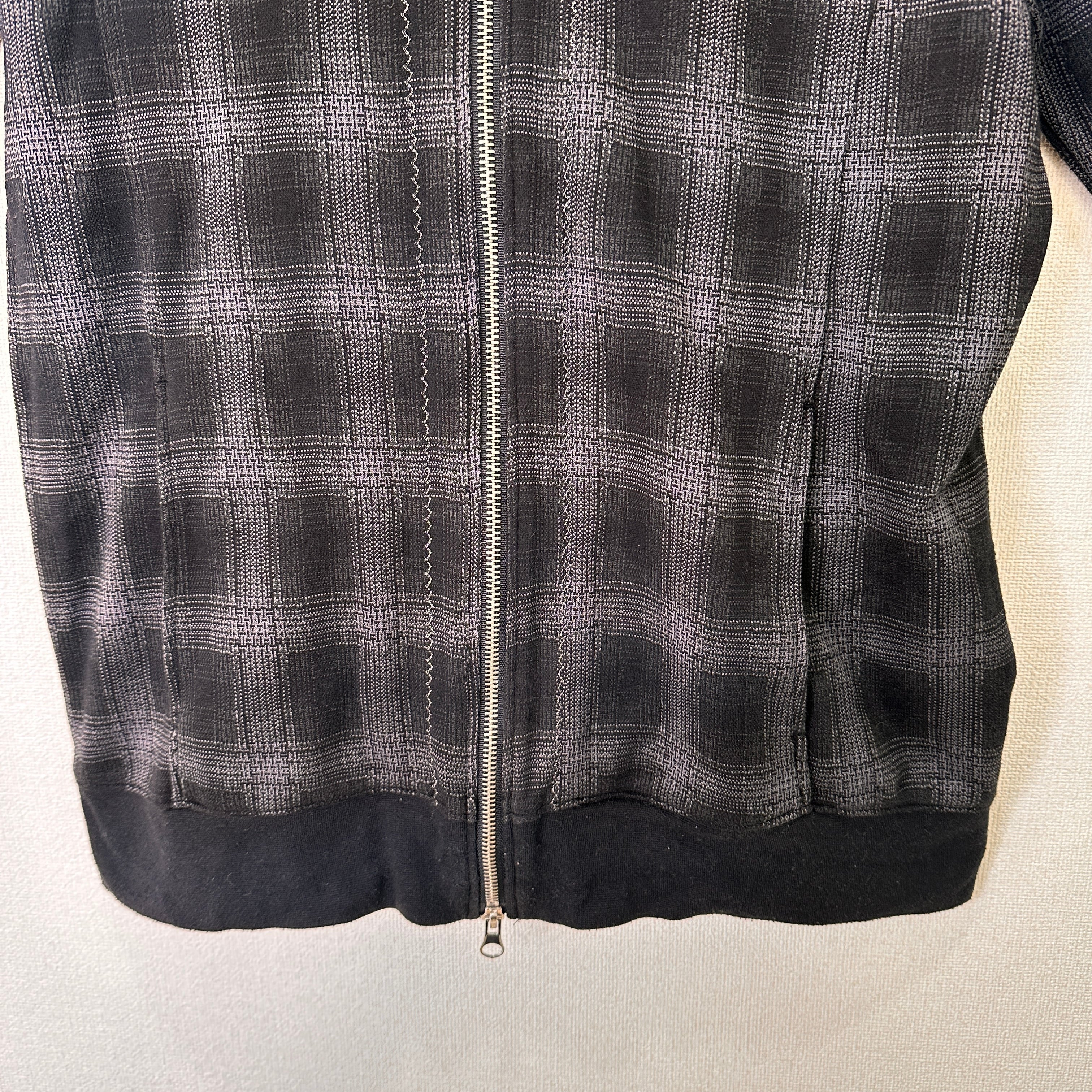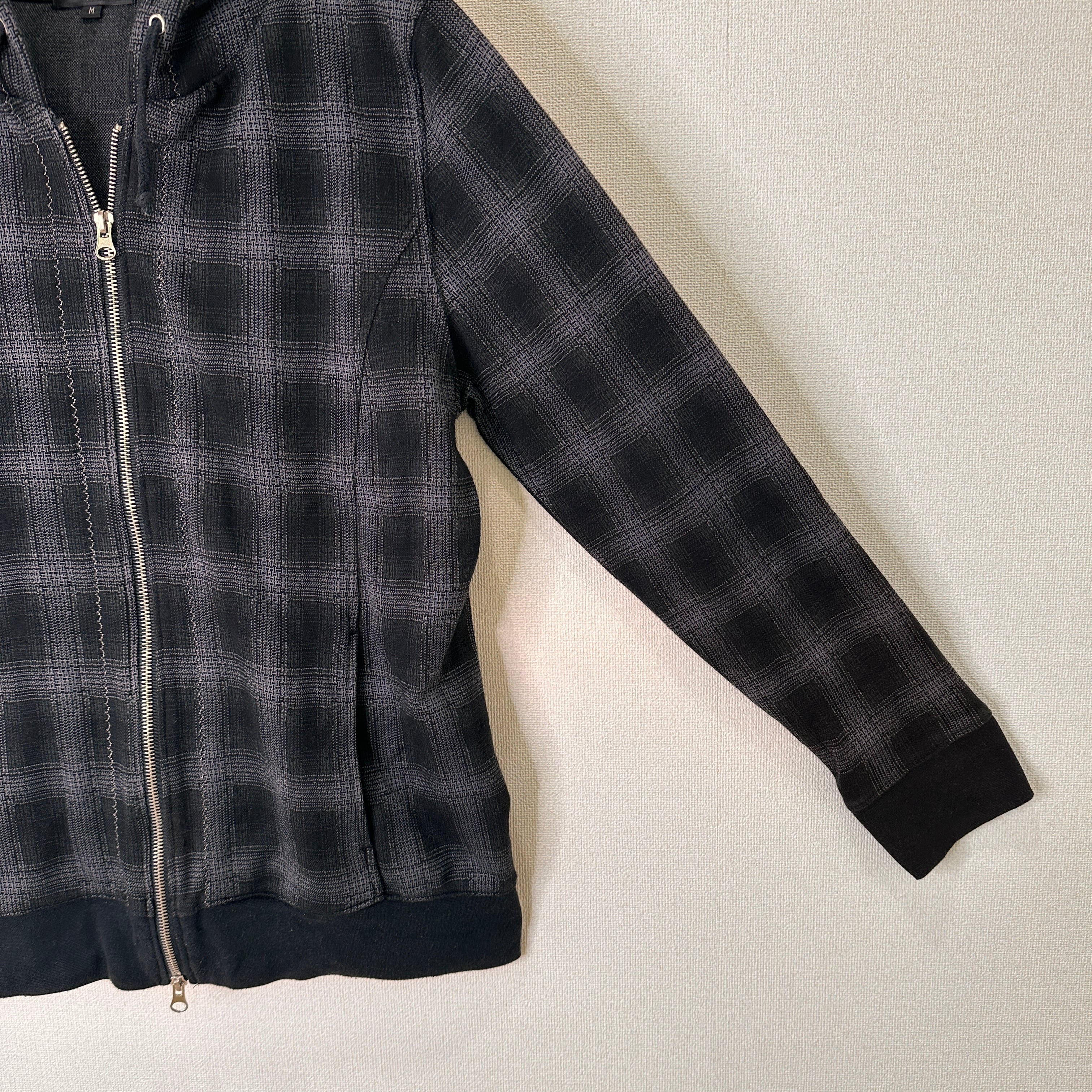 色はグレー系で、細かい千鳥格子のような模様(ジャガード織り、またはプリント)が入ったデザインです。