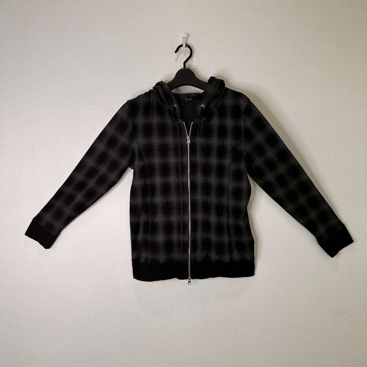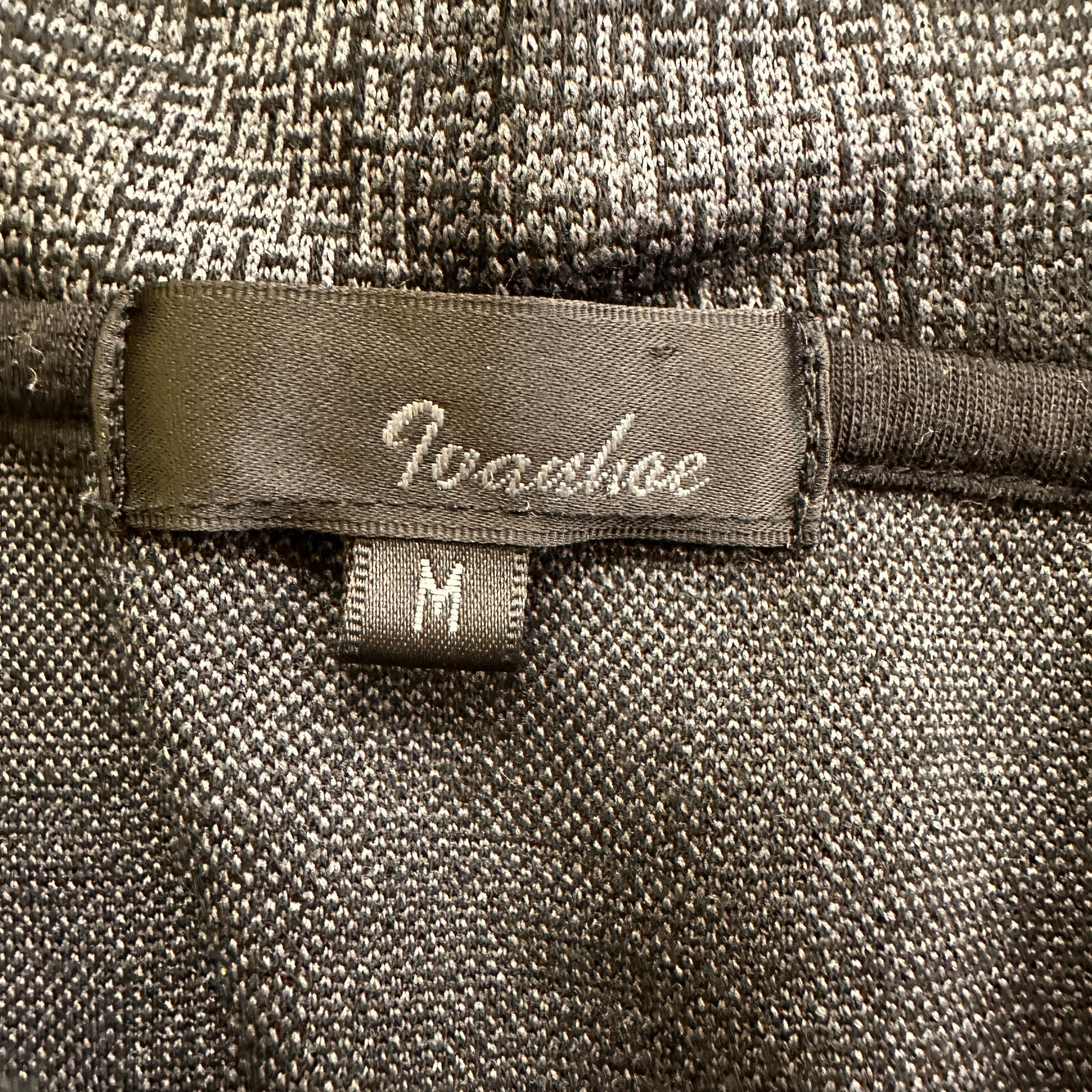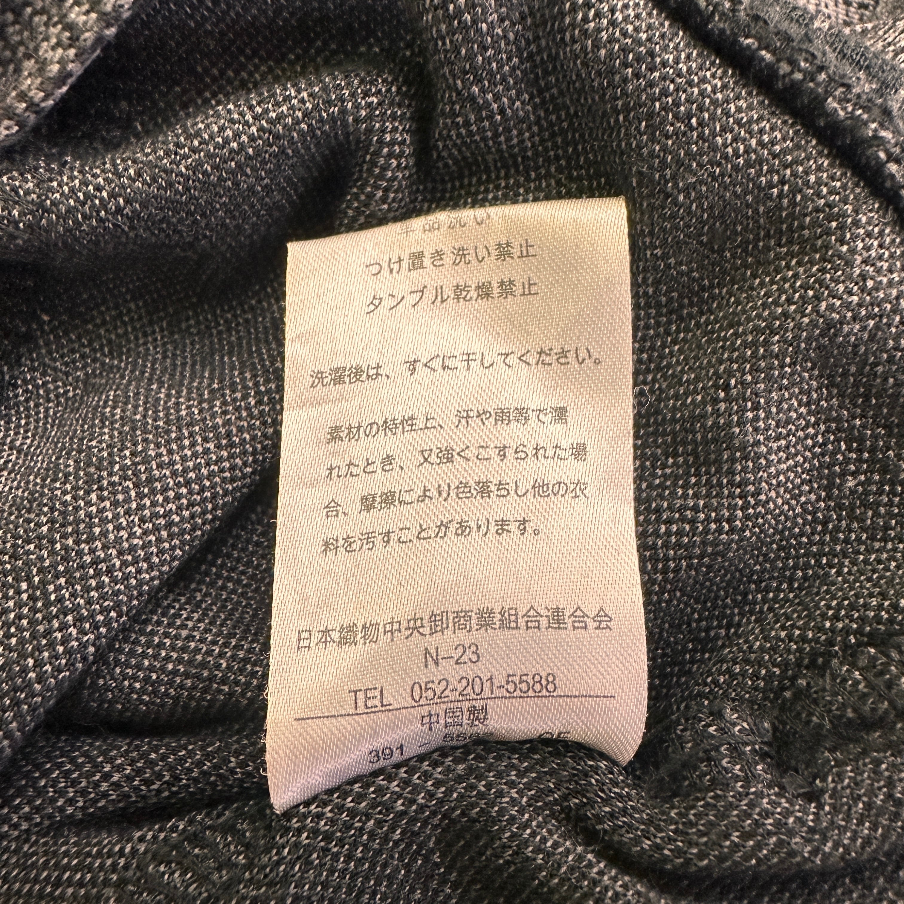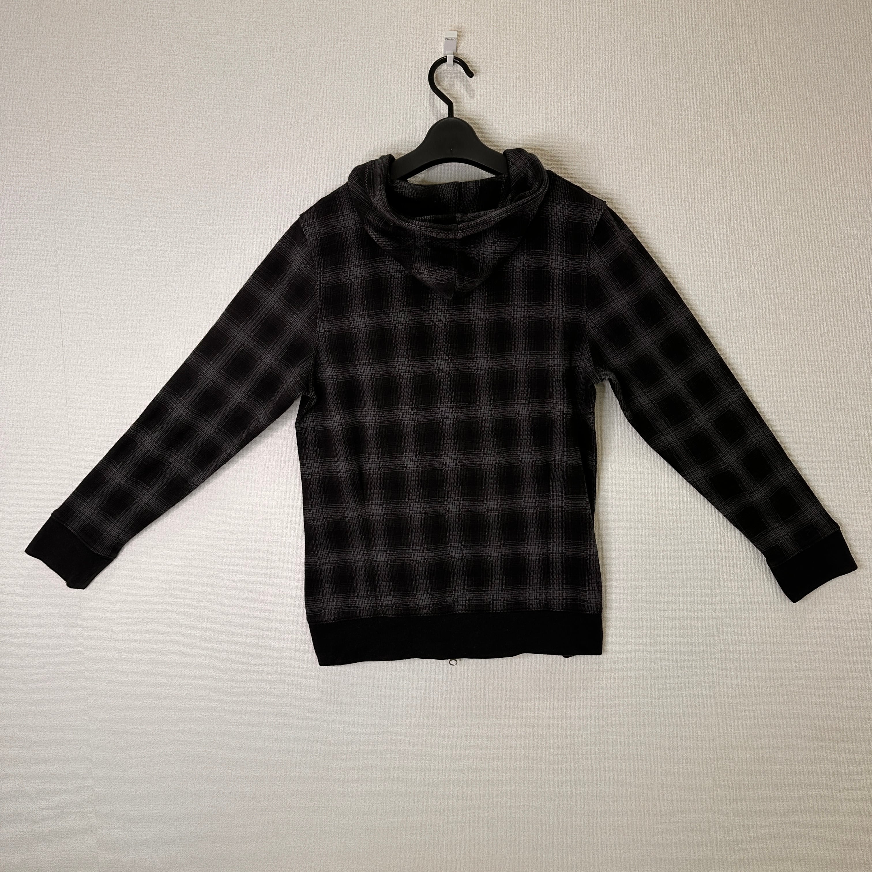 色はグレー系で、細かい千鳥格子のような模様(ジャガード織り、またはプリント)が入ったデザインです。