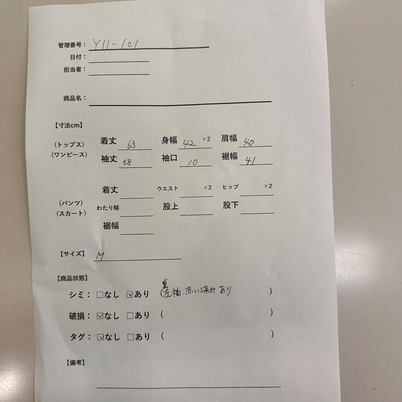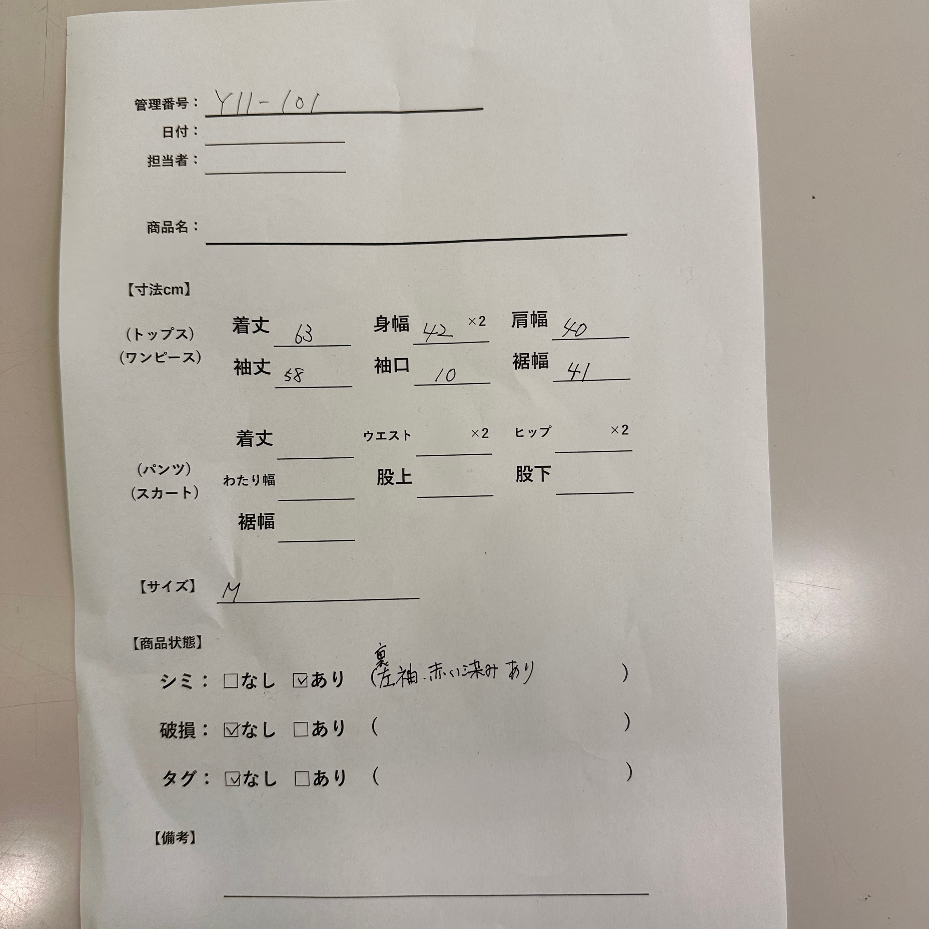 シミ/汚れ: あり (裏側の左袖赤い染みあり)