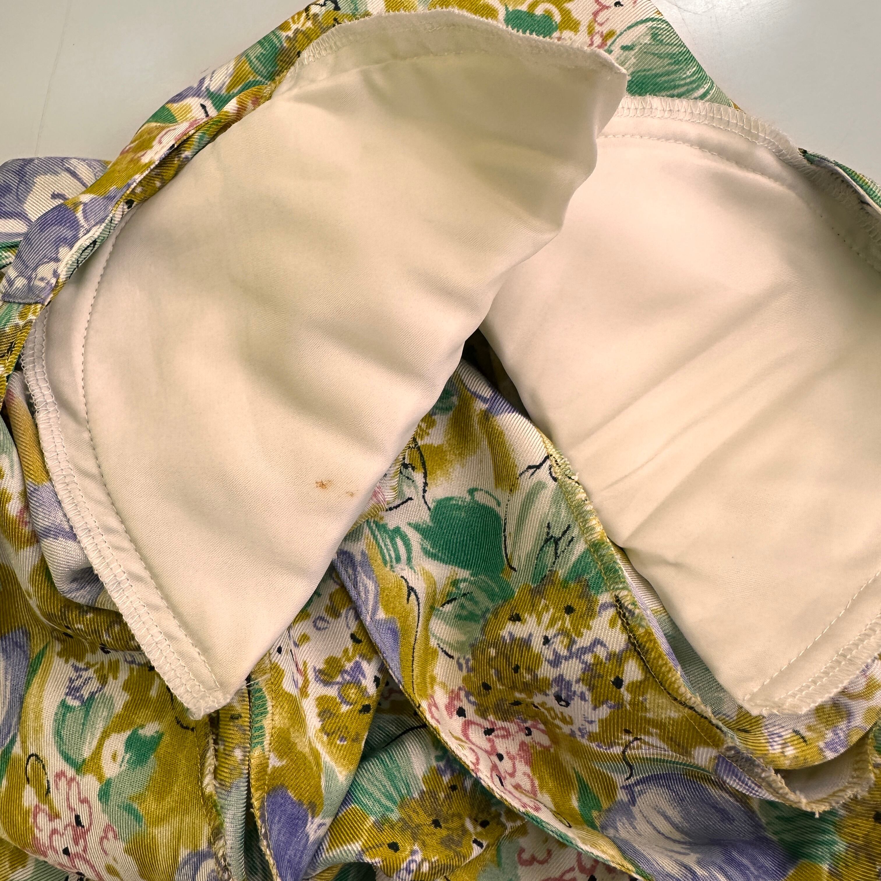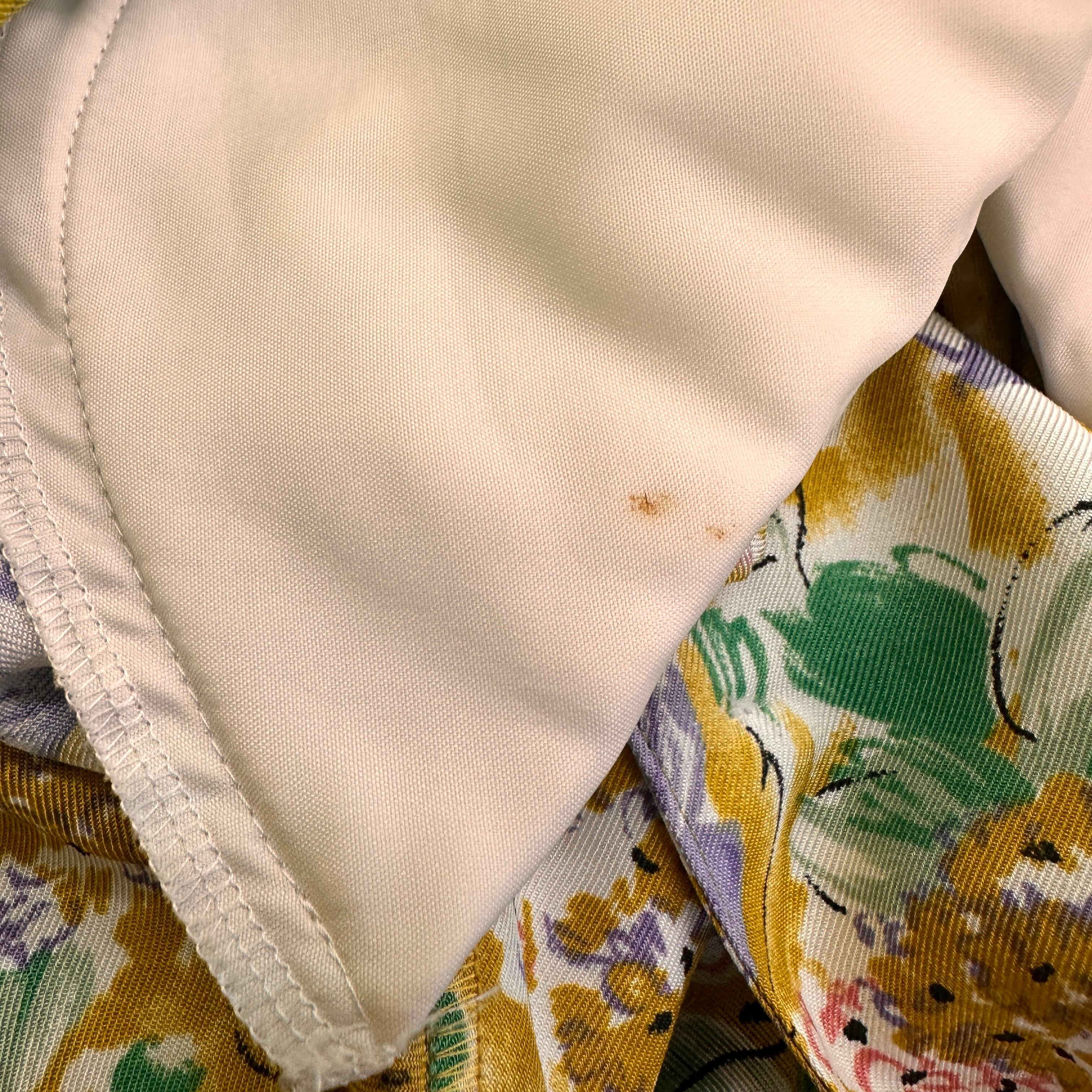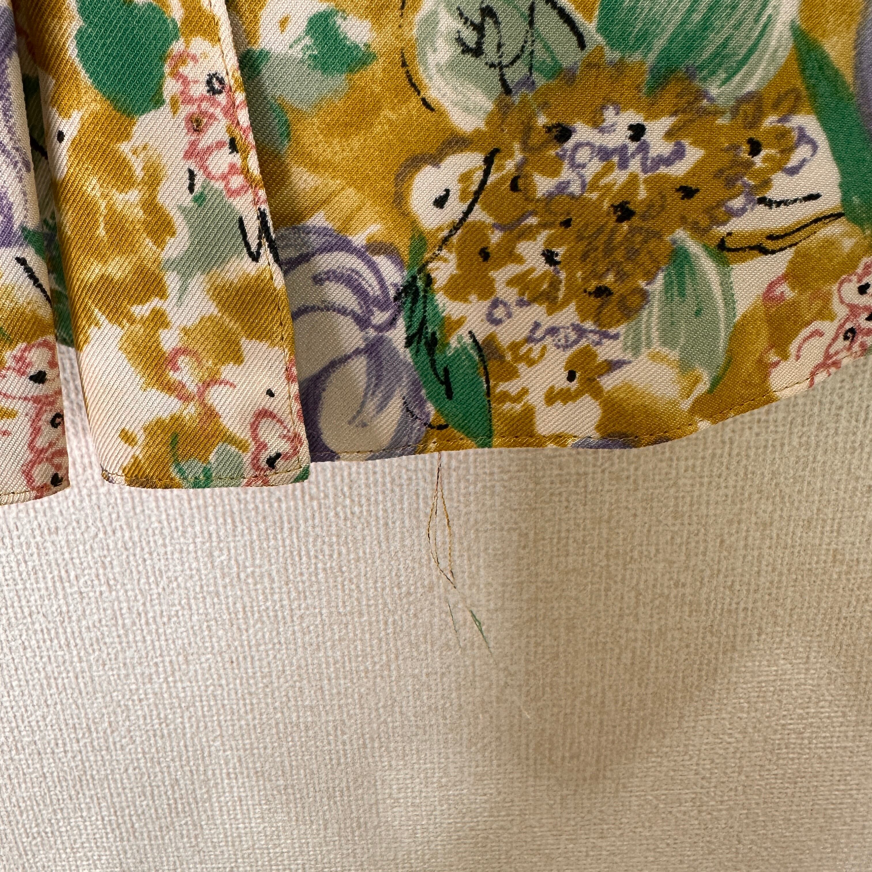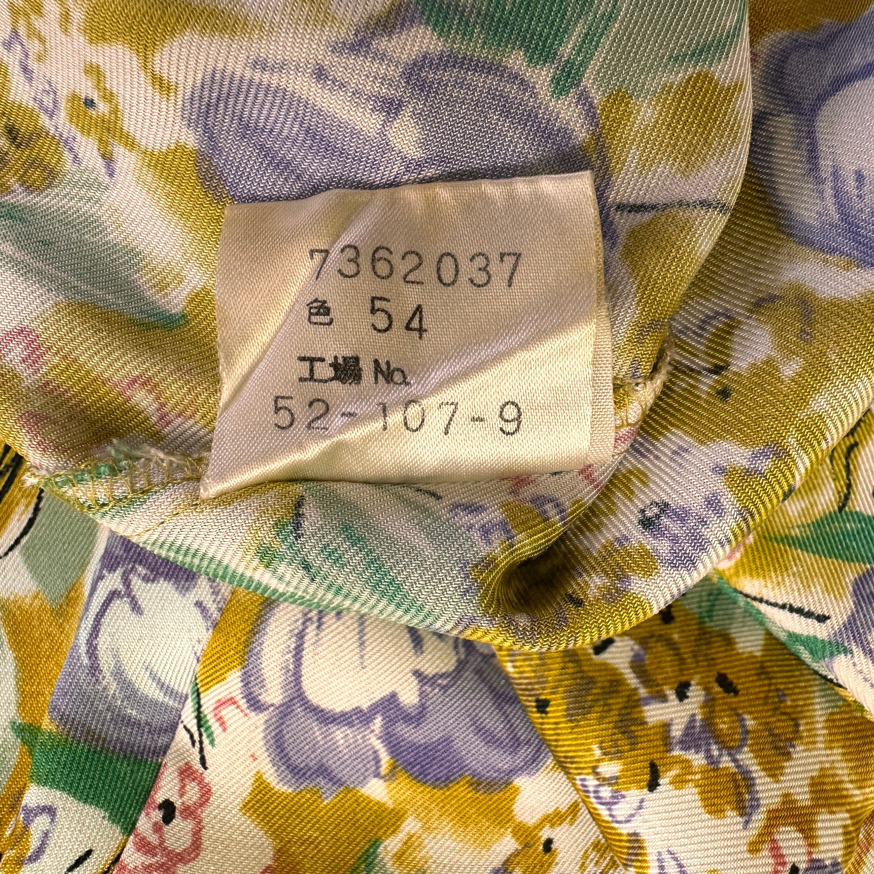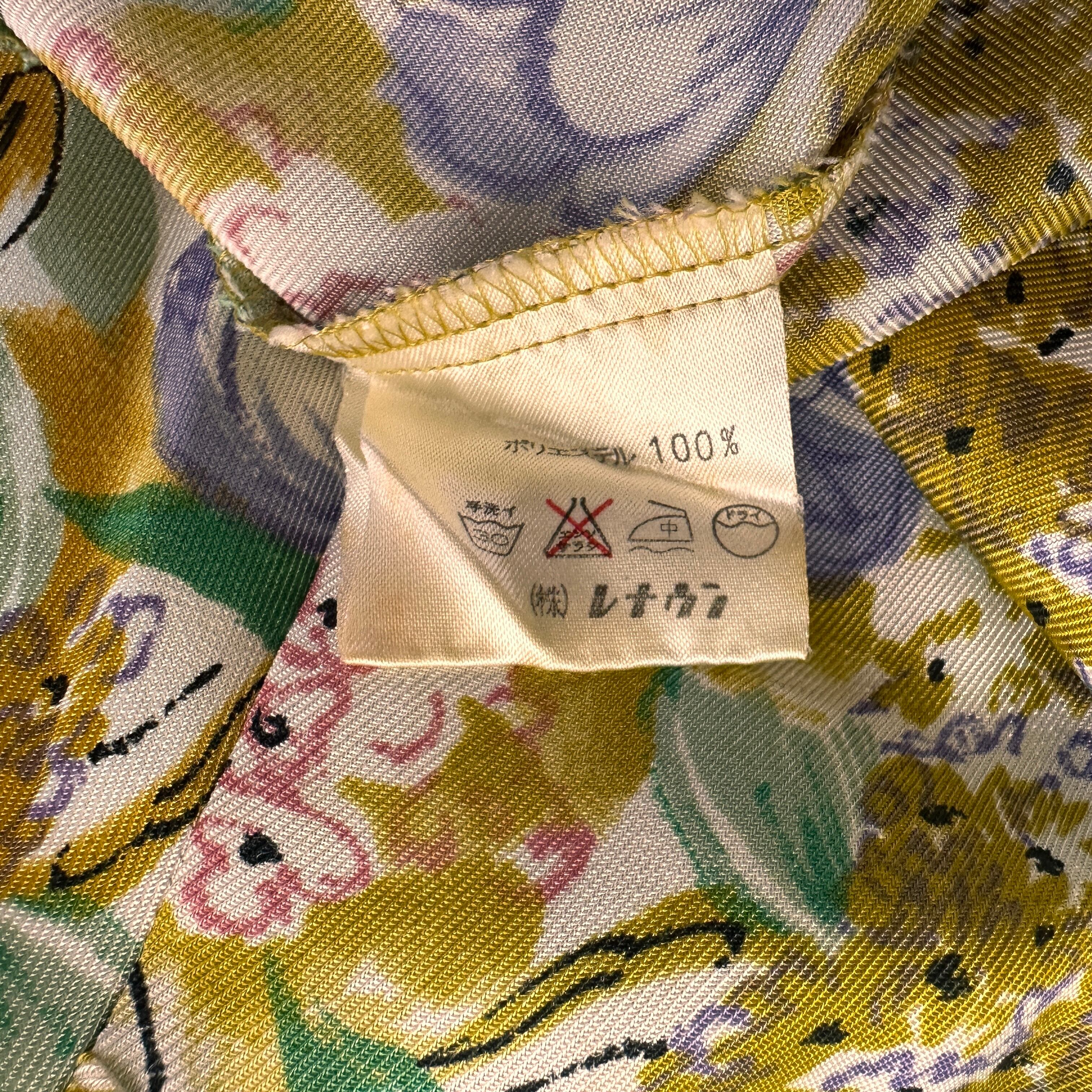 イエローパープルグリーンなどが散りばめられた多色使いのプリントで、一枚で主役になるアイテムです。