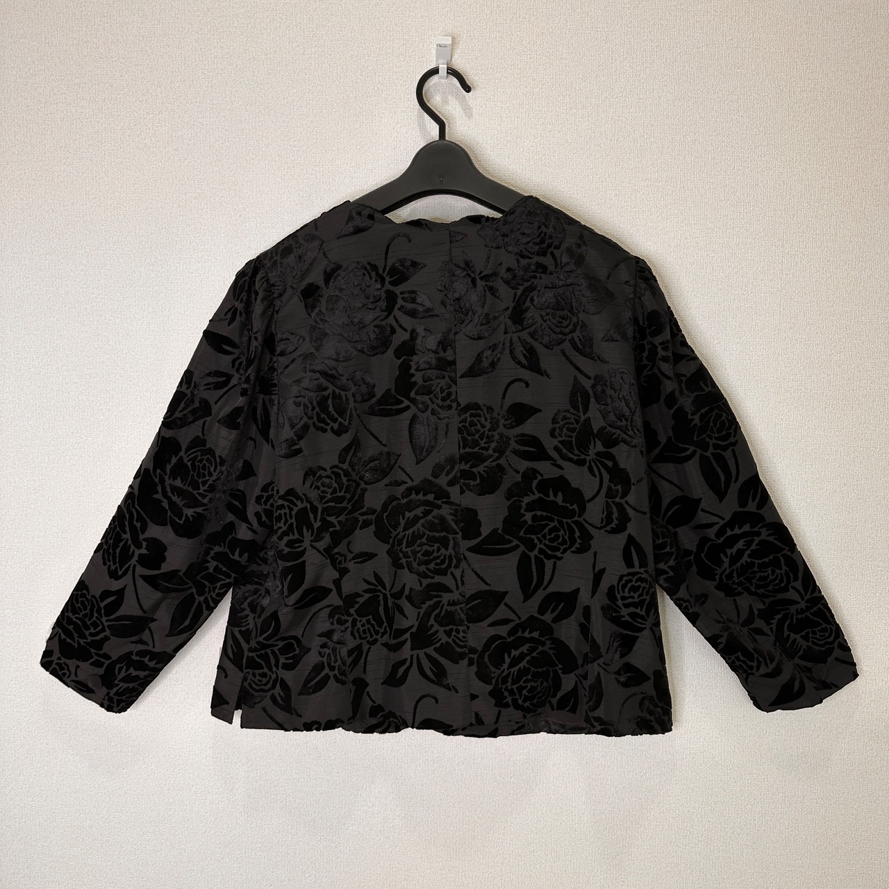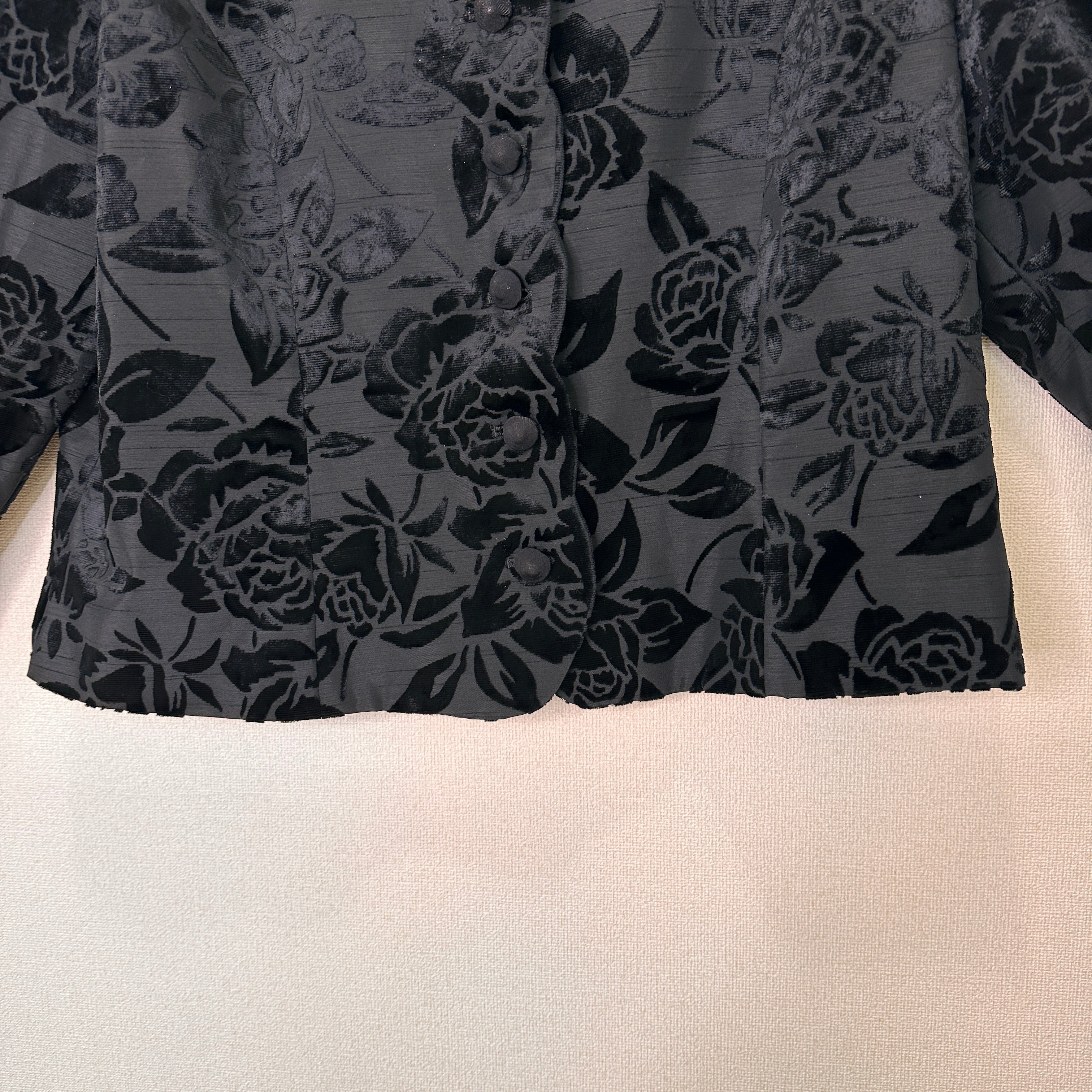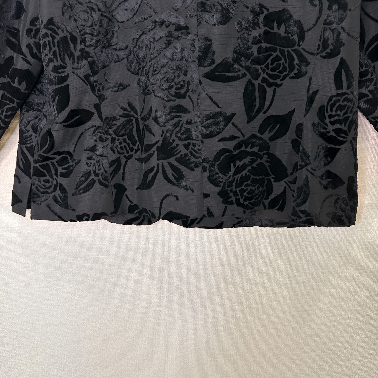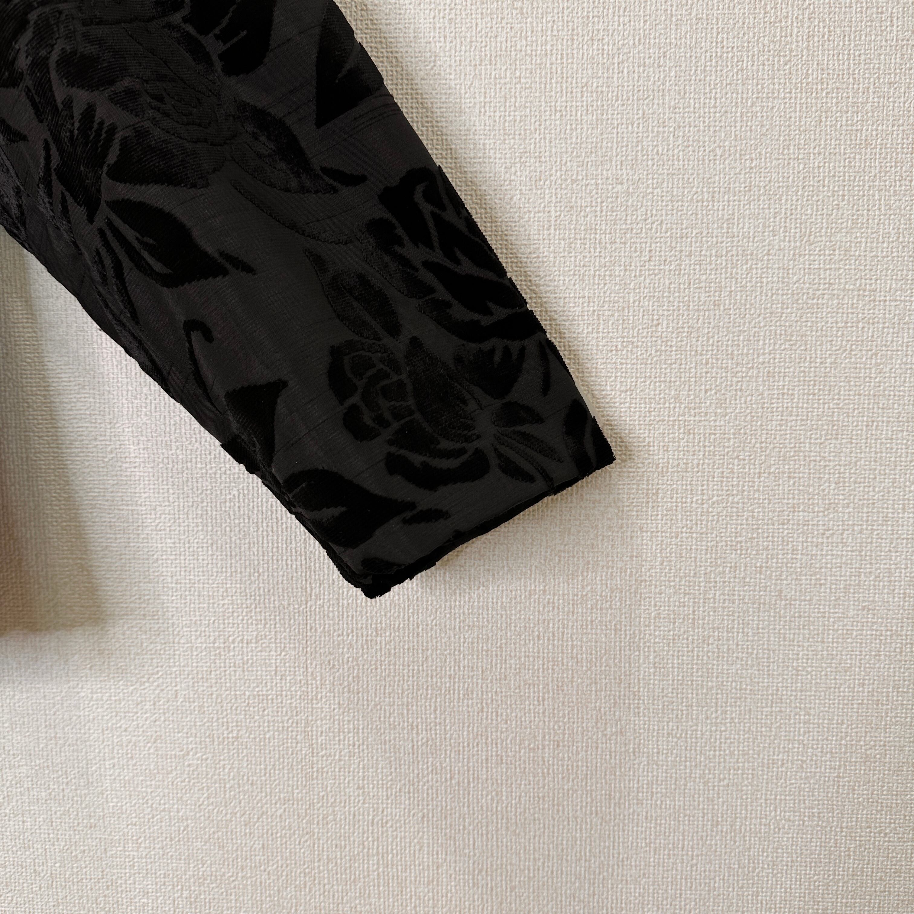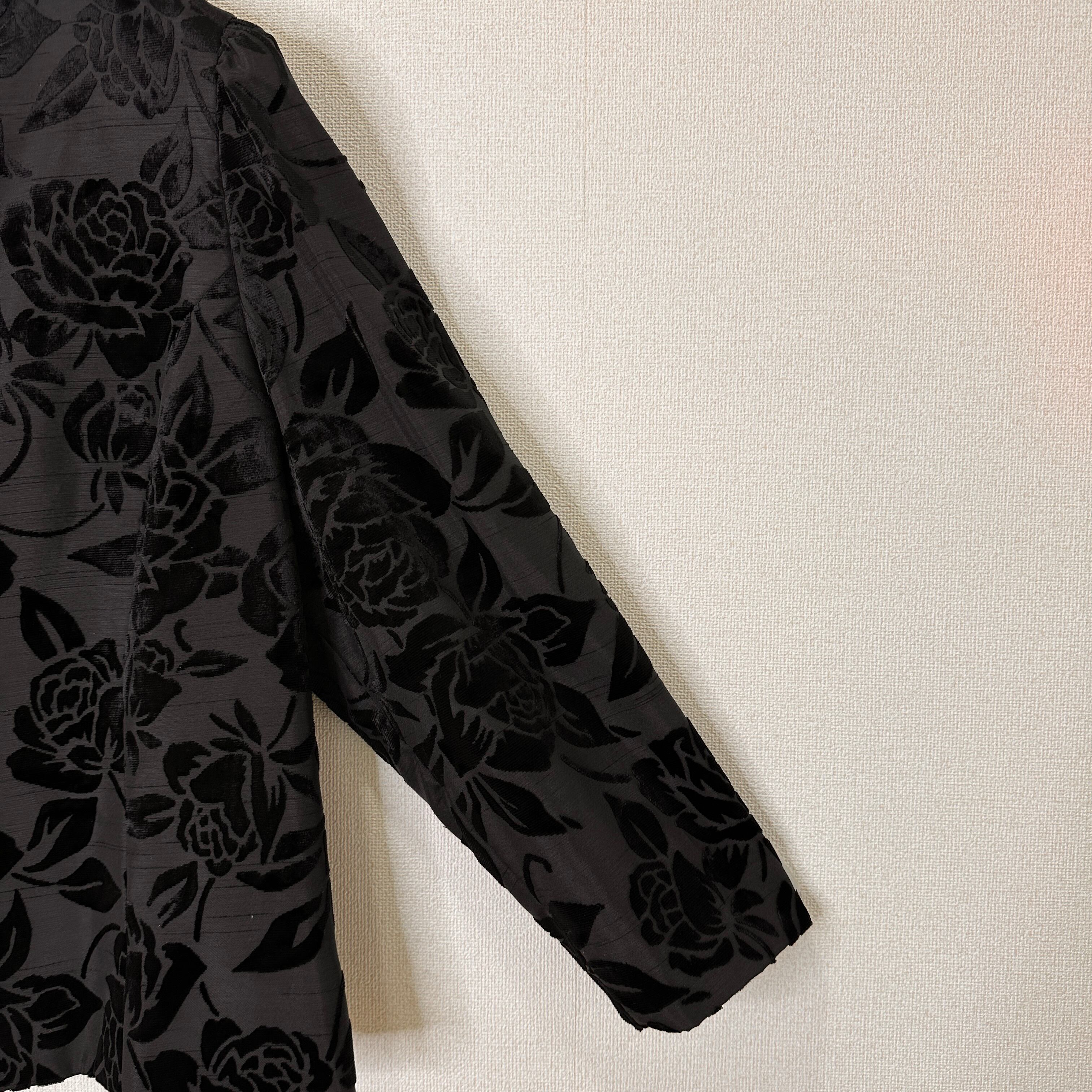 全体にベロア調の薔薇(ローズ)柄が施されており、立体感と光沢のある華やかなデザインです。