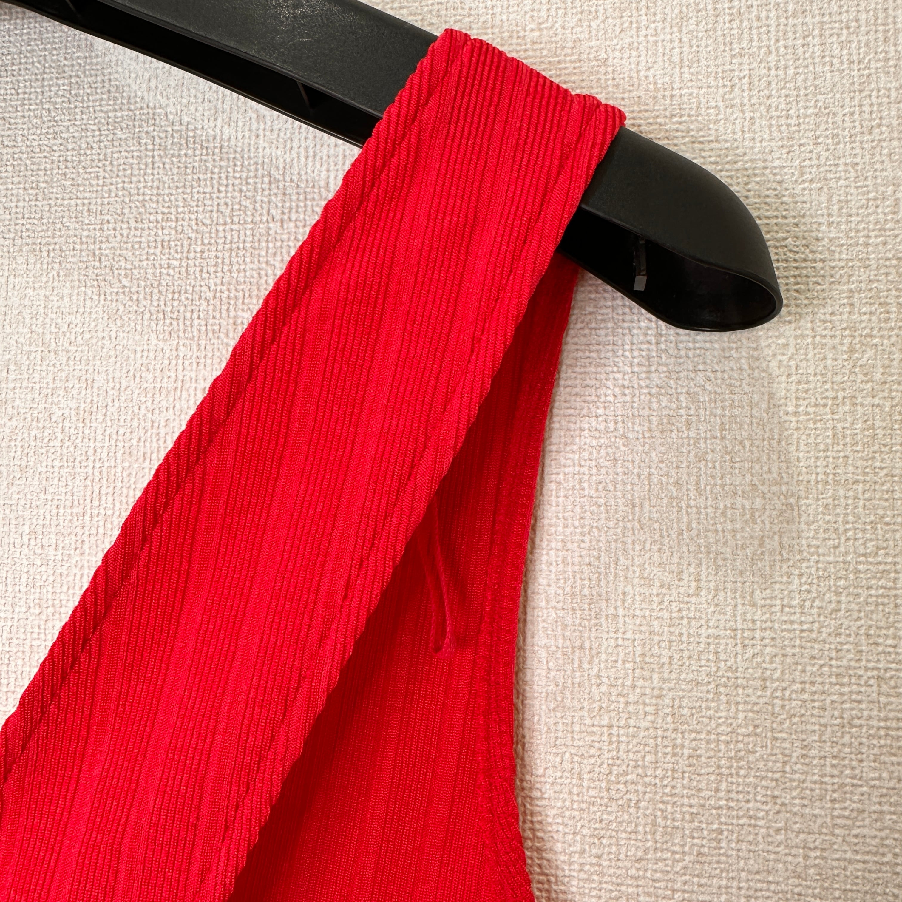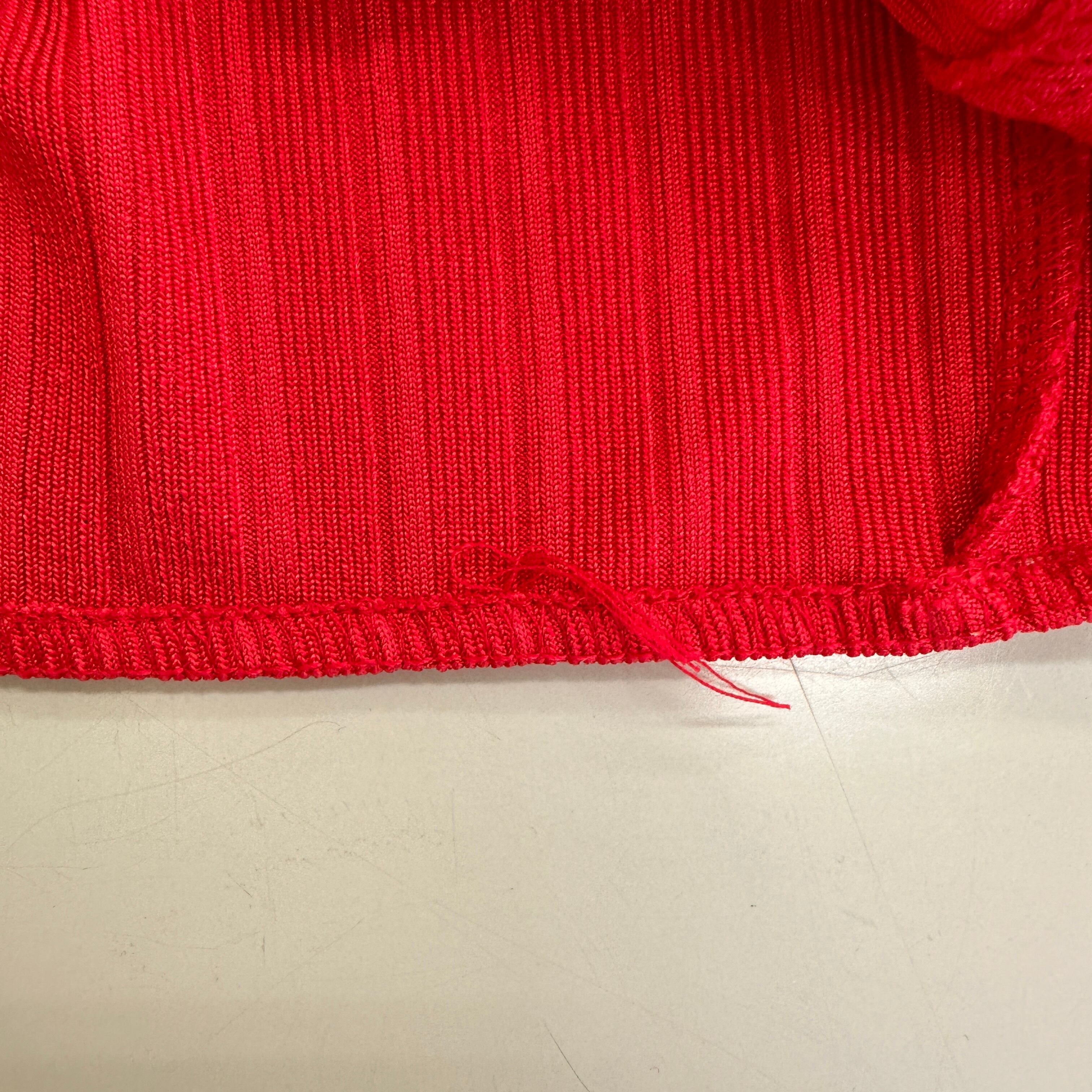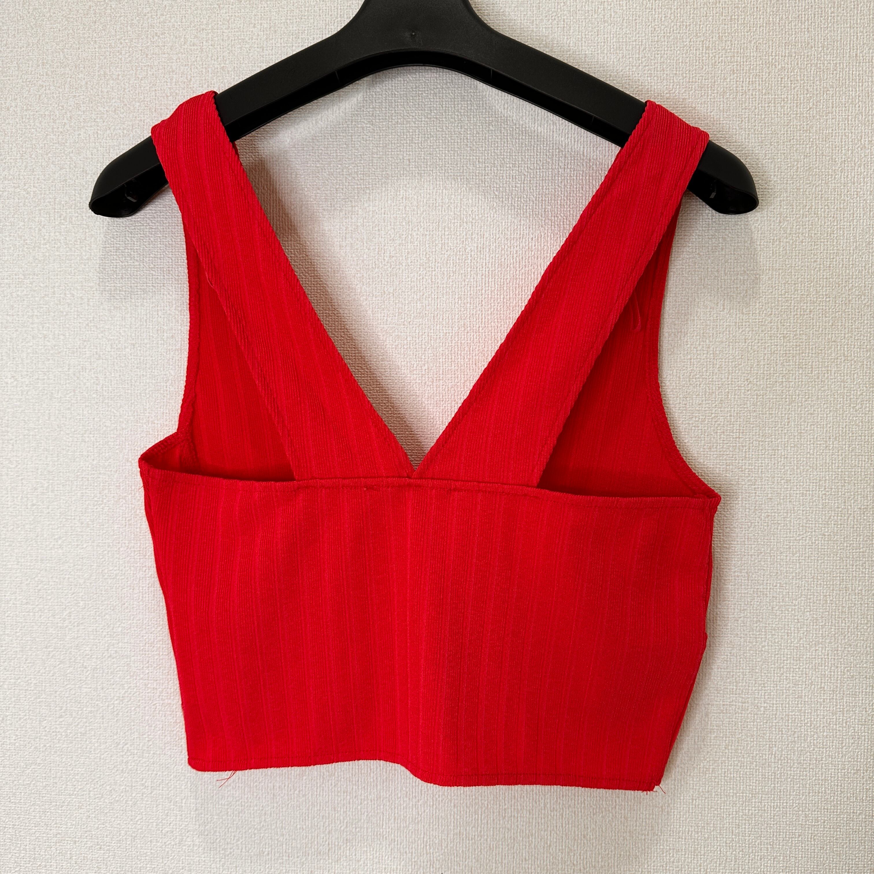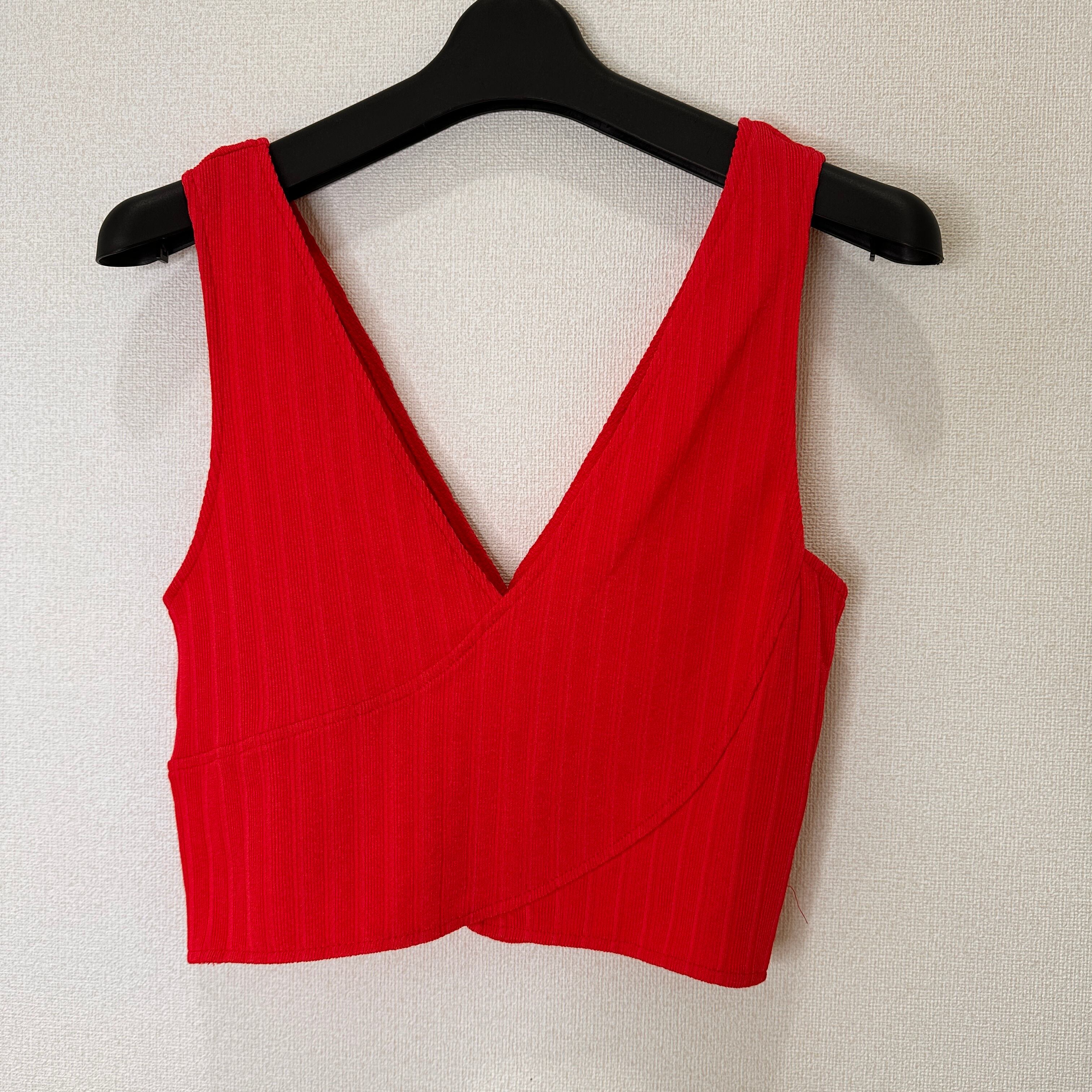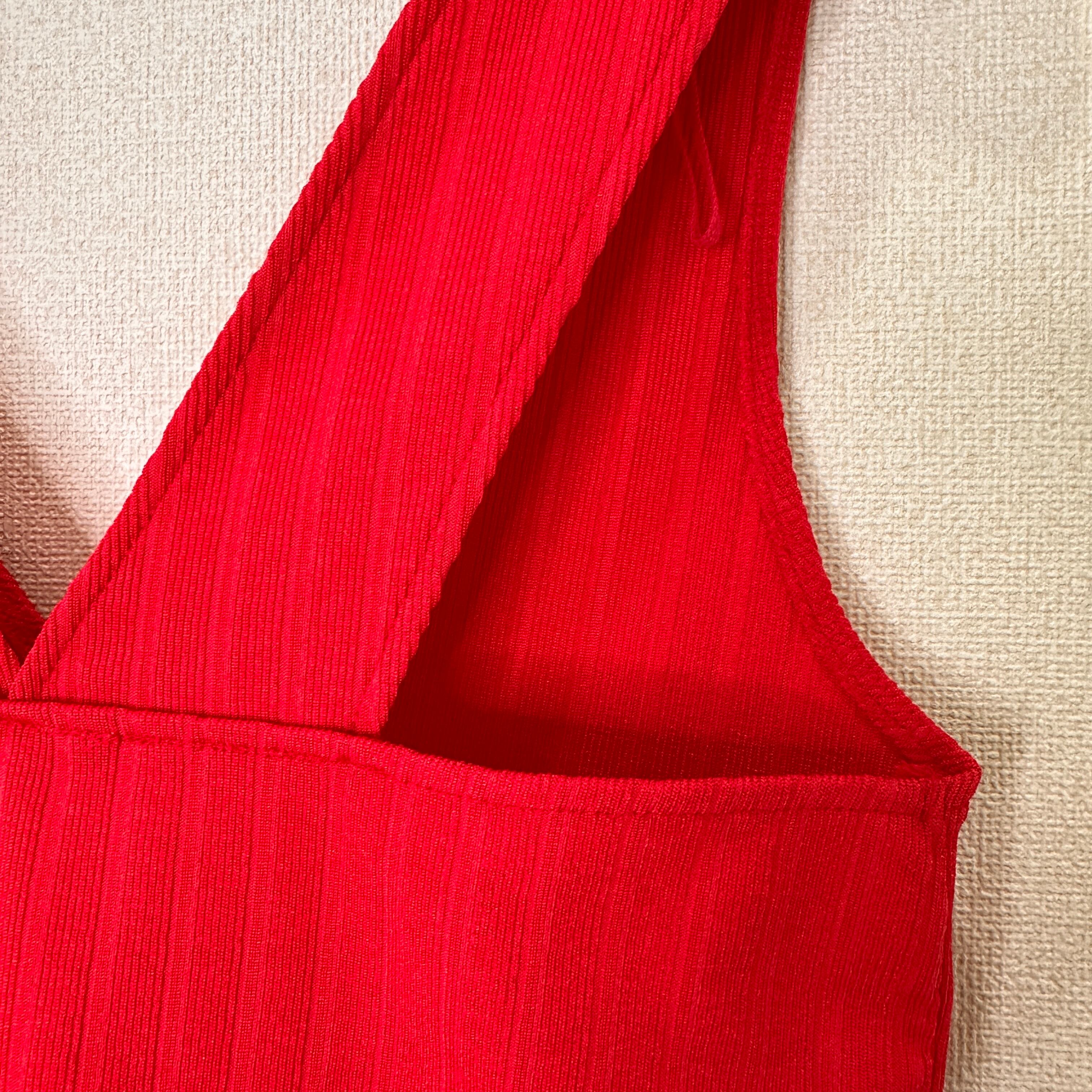 目立った傷や汚れはありませんが、中古品にご理解いただける方のみご購入をお願いいたします。リブ編みのレッドビスチェ、Vネックデザインでスタイリッシュ。
