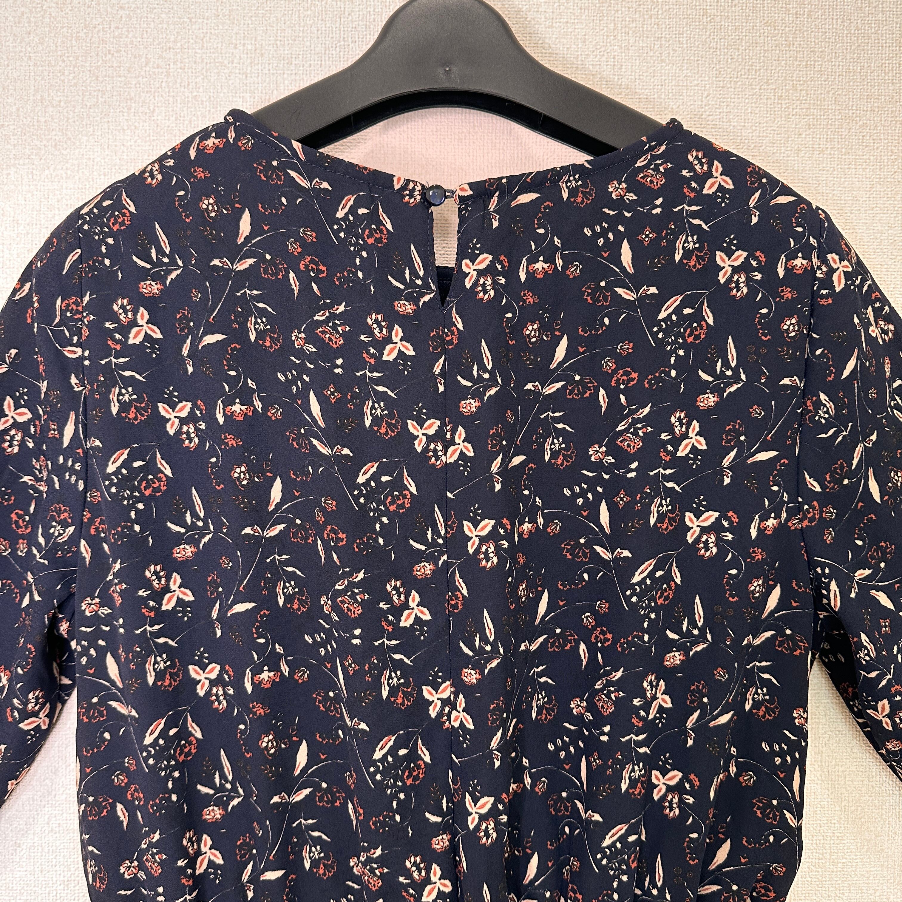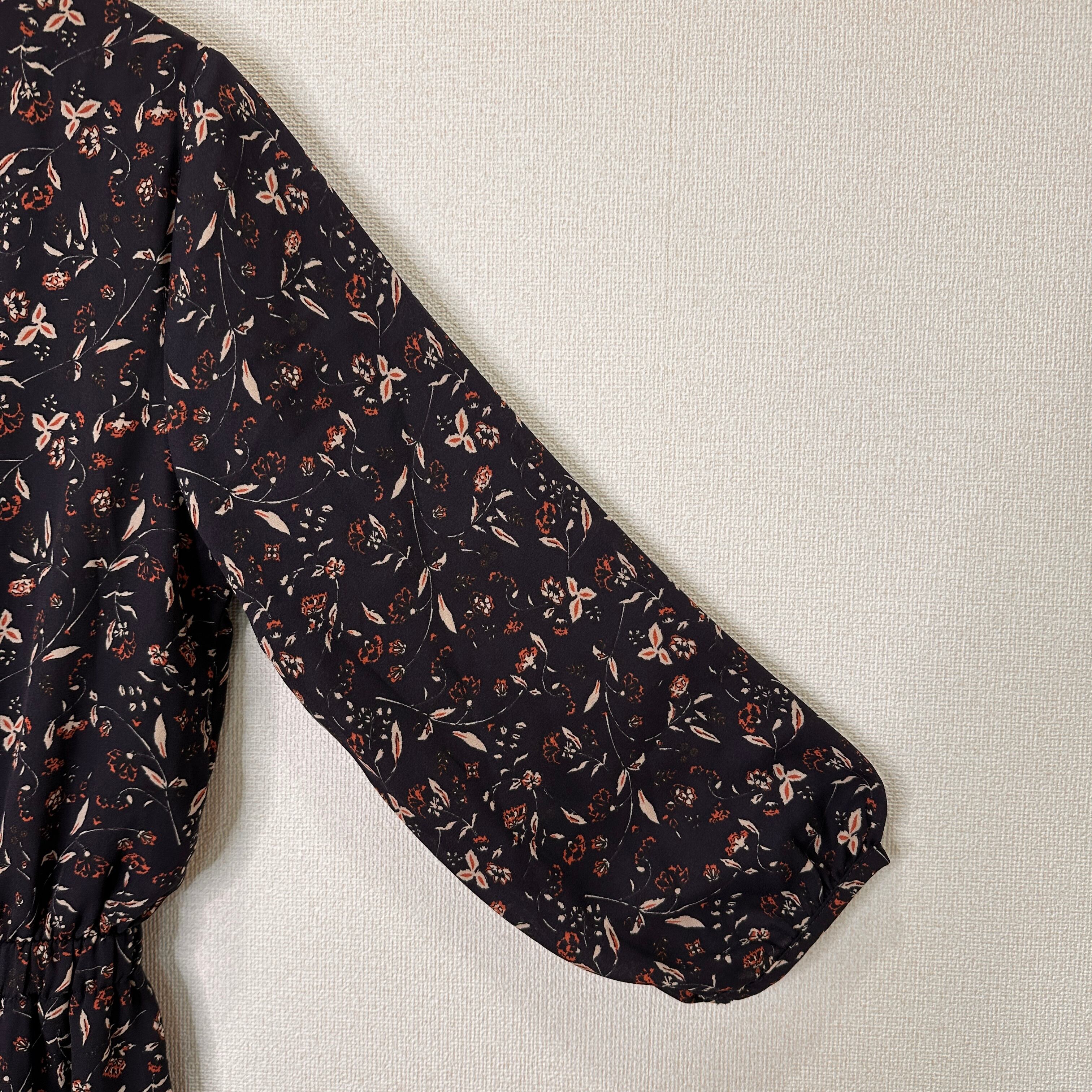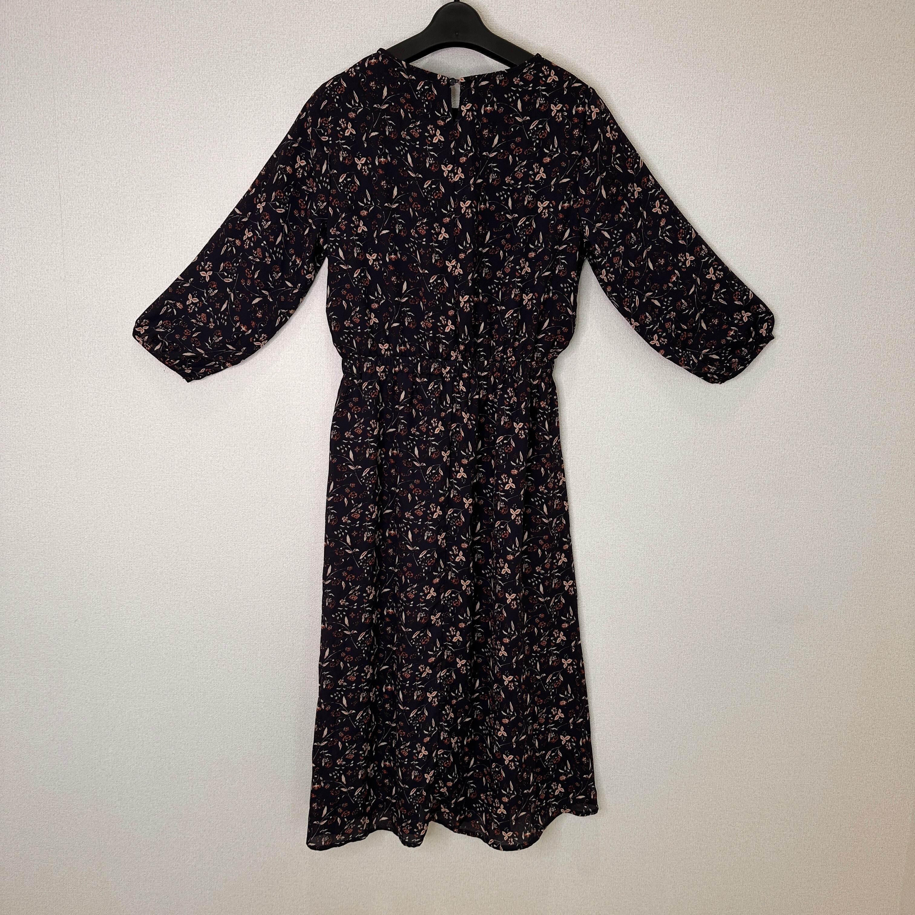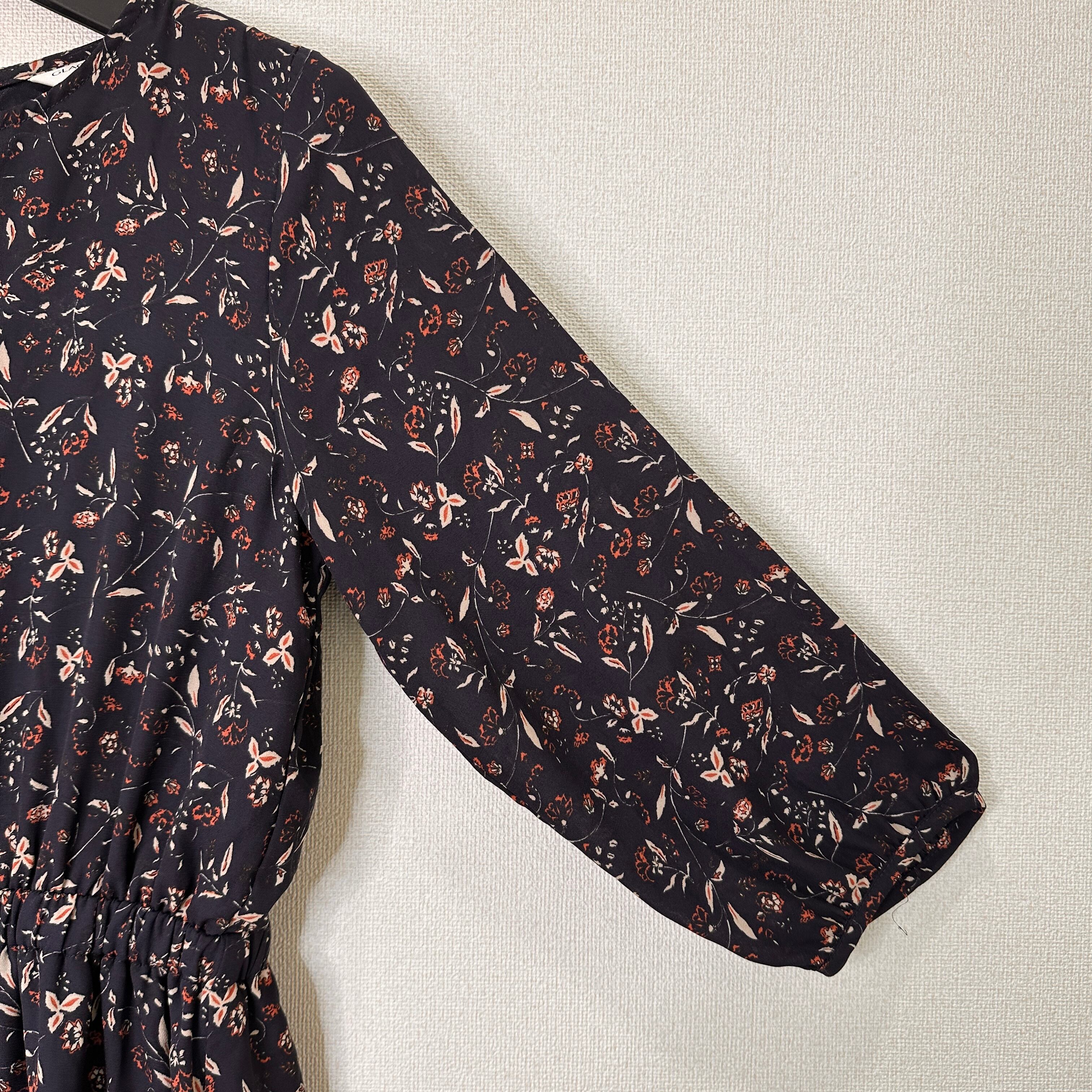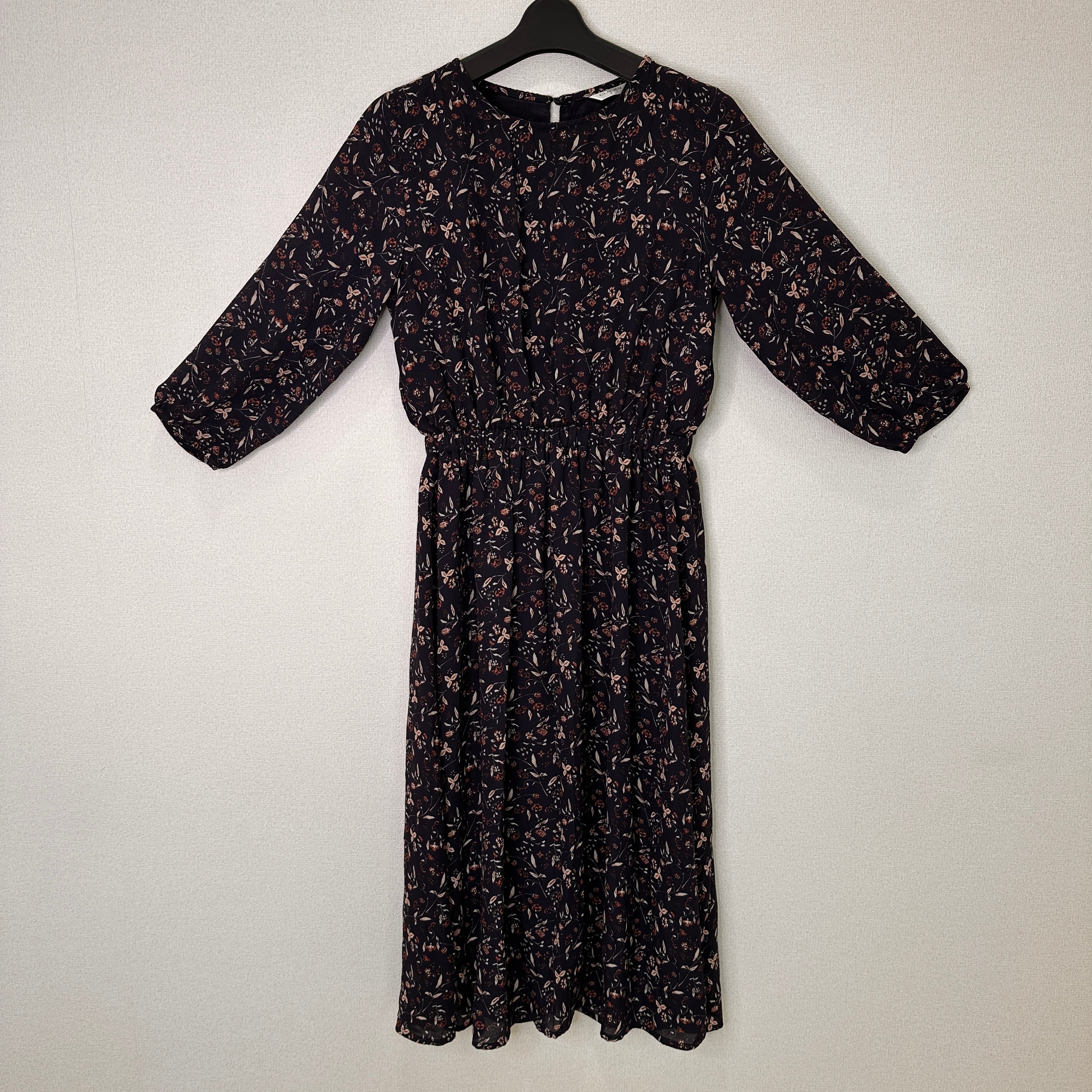 ネイビーの花柄デザイン、長袖のSサイズワンピース。