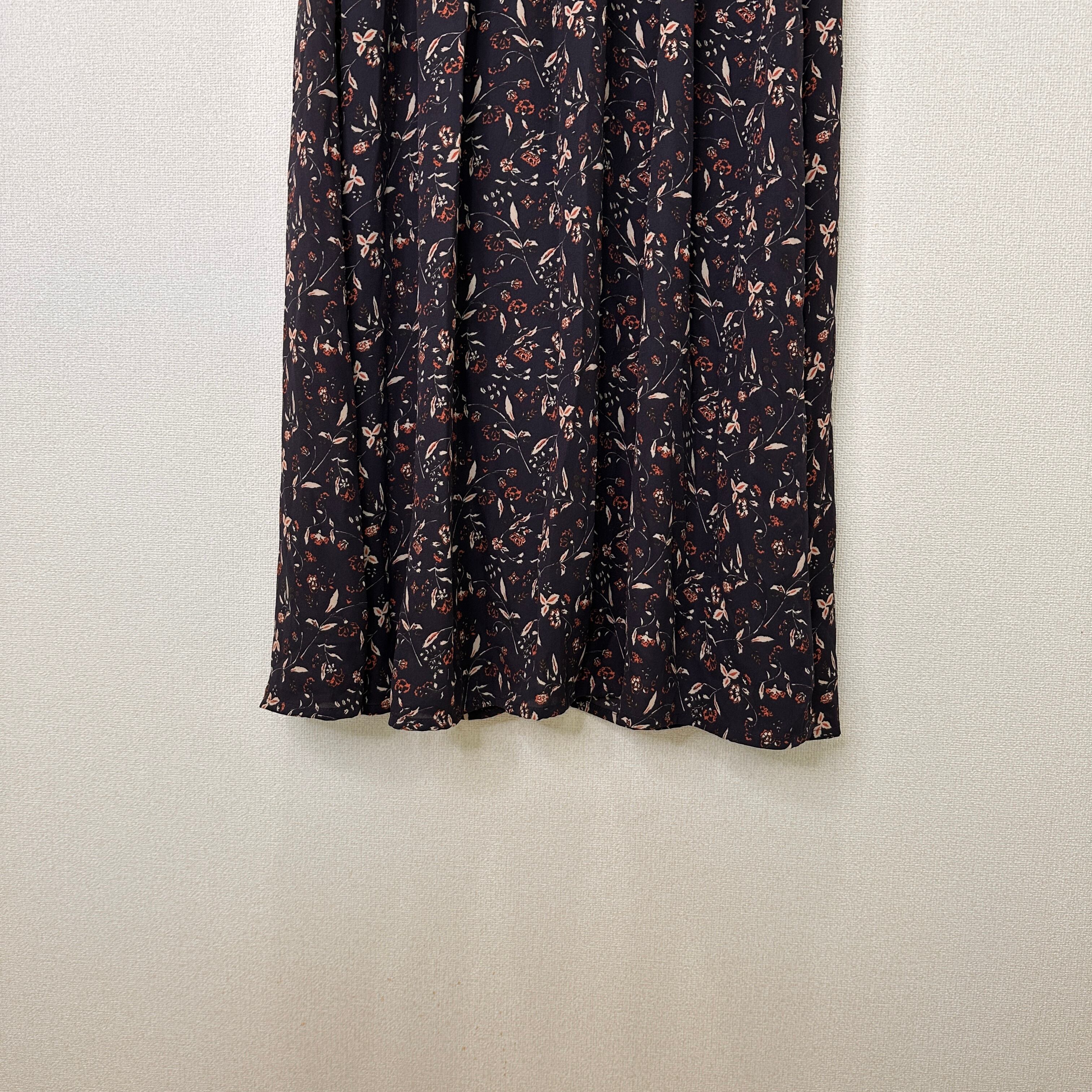 濃紺にブラウン系などの小花柄があしらわれた、シックで上品なロング丈ワンピースです。