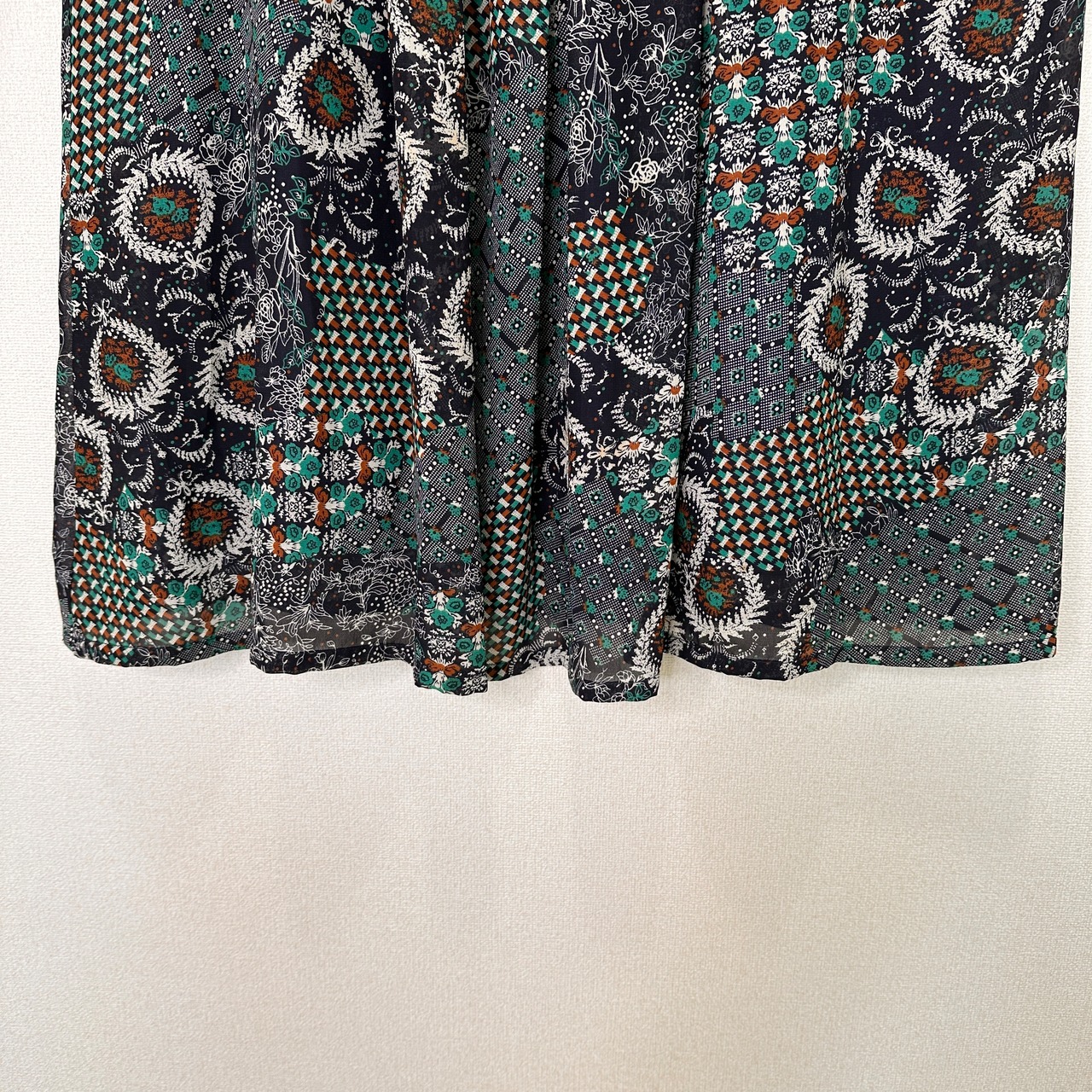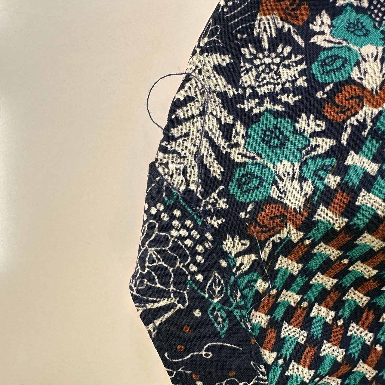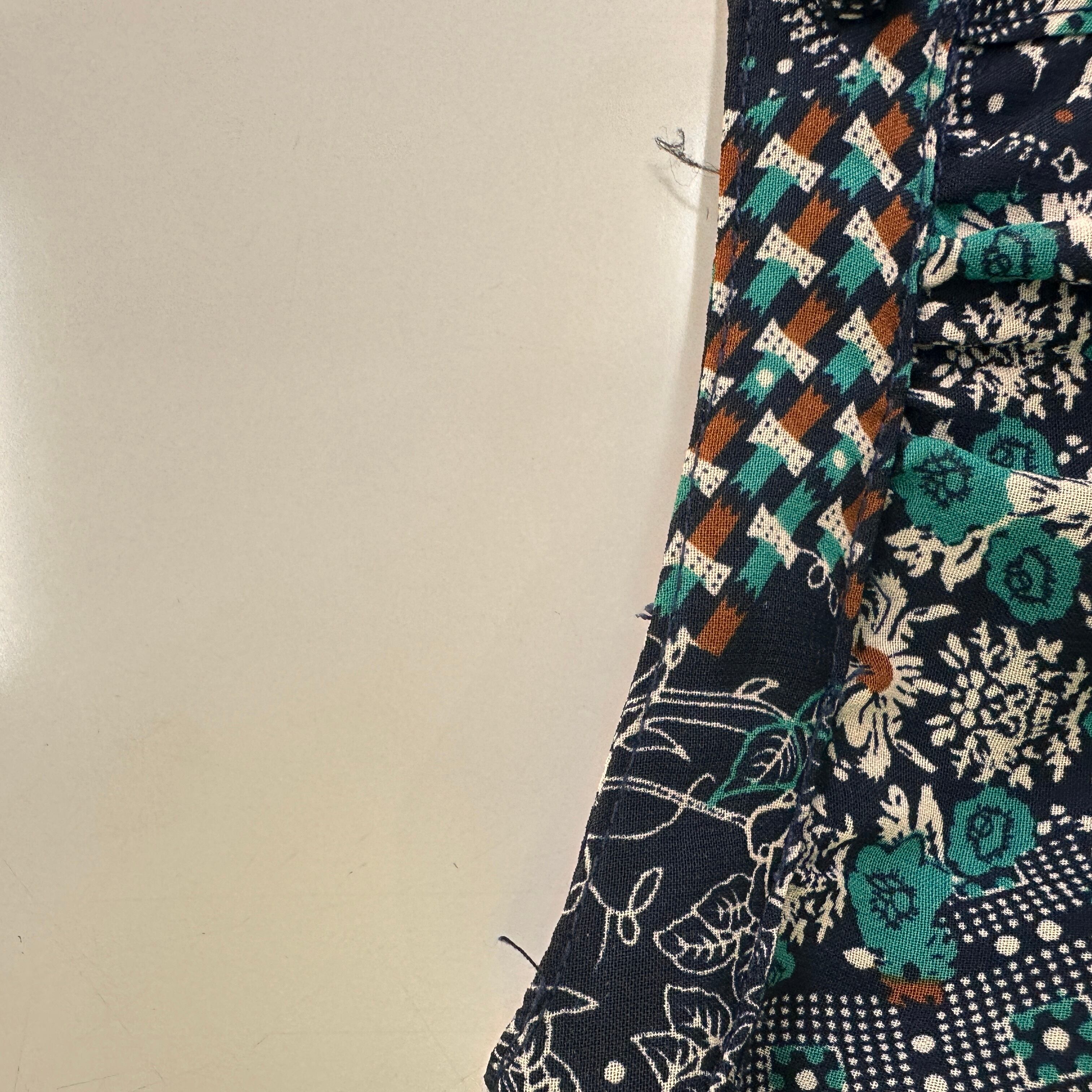 ネイビー/グリーン/オレンジなどの色を使った、花柄とパッチワークを組み合わせたような個性的な柄が魅力です。