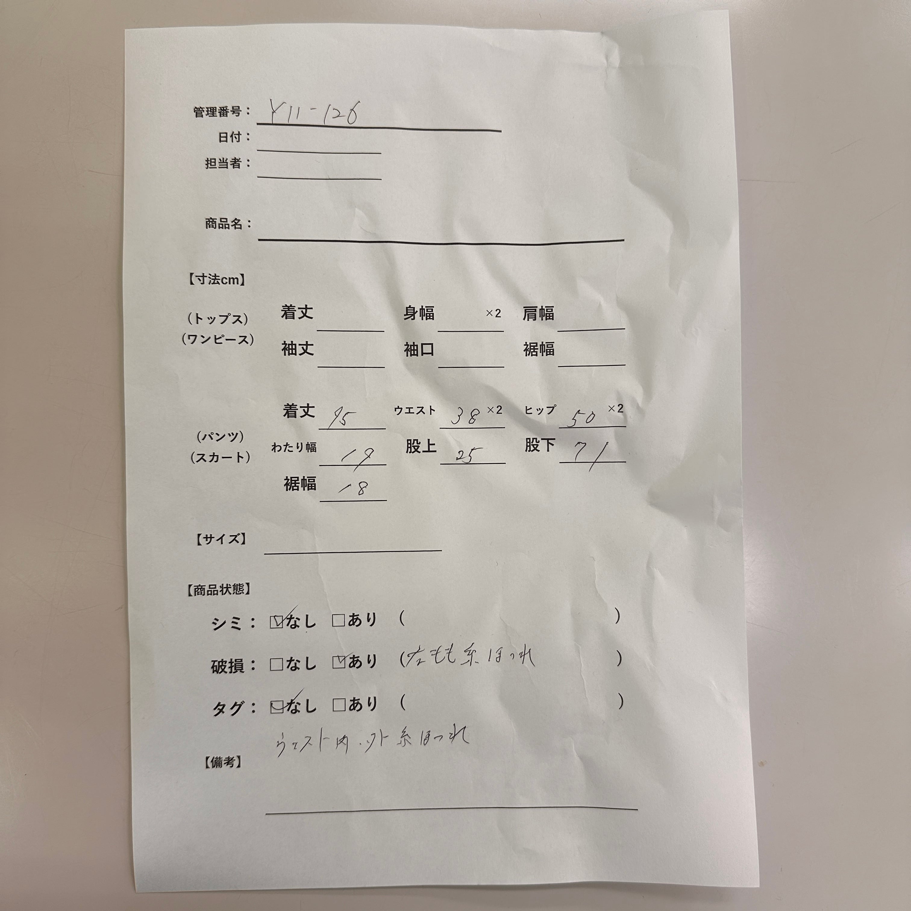 破損: あり(右もも糸ほつれ、ウエスト内・外糸ほつれ)