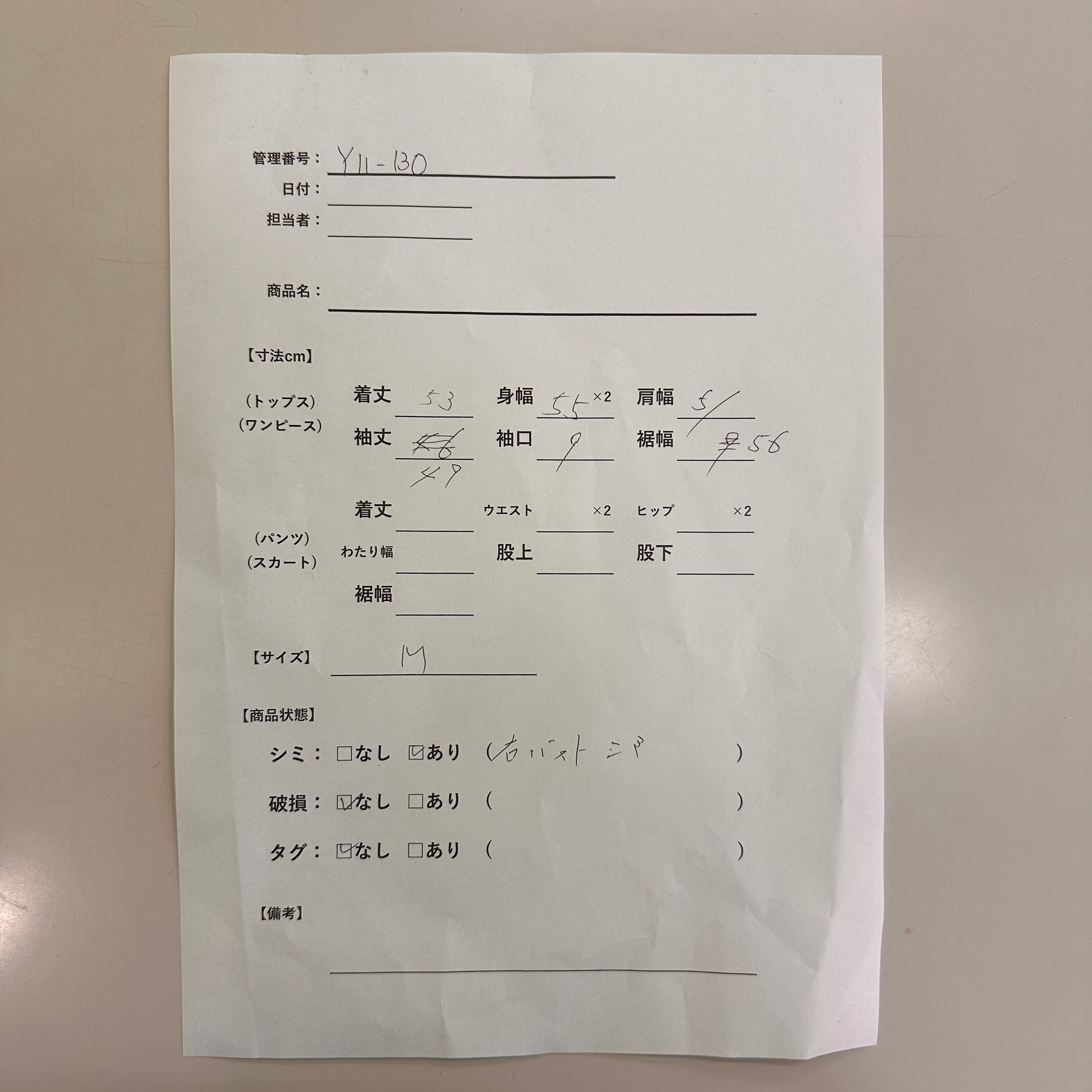 シミ/汚れ: あり(右バストにわずかにあり)