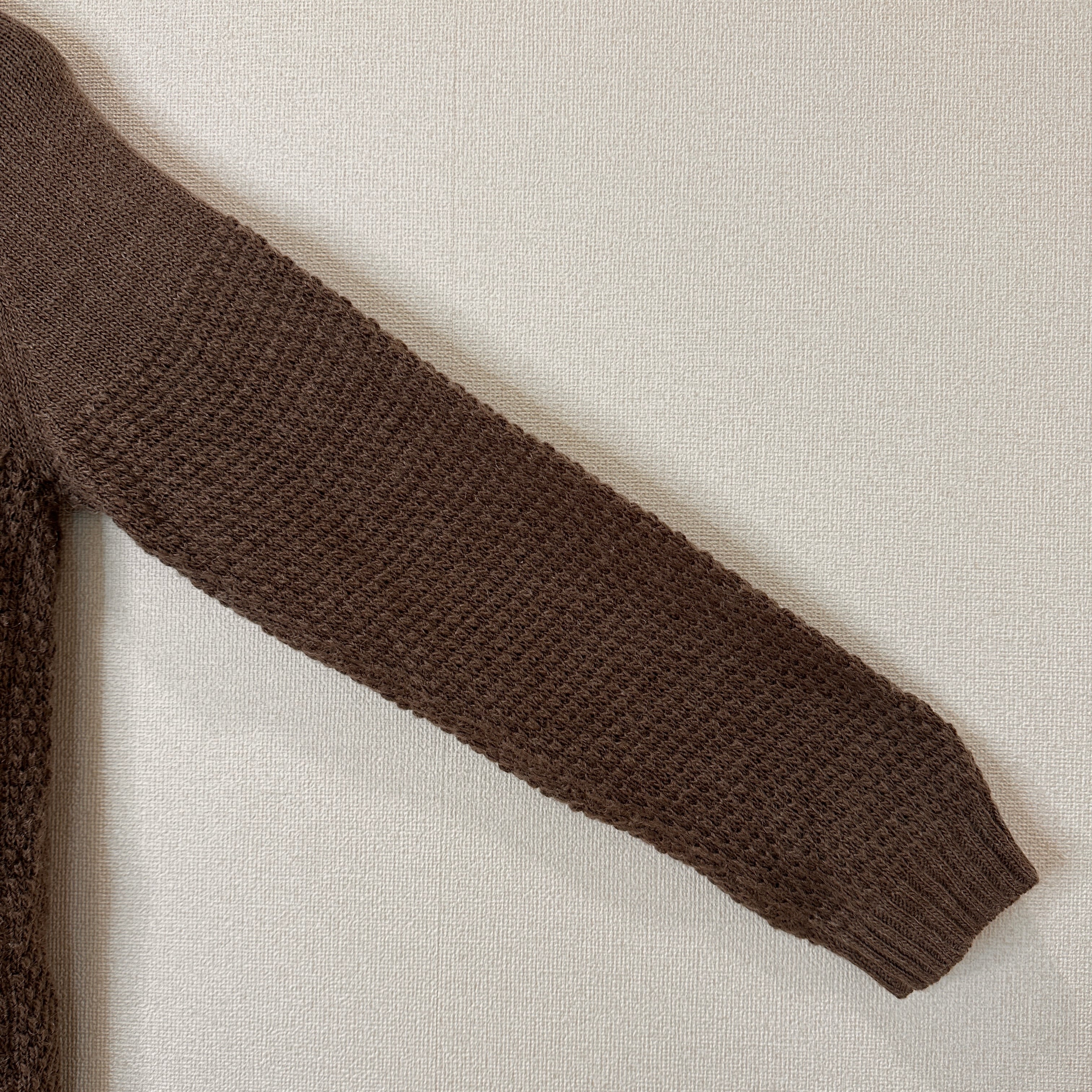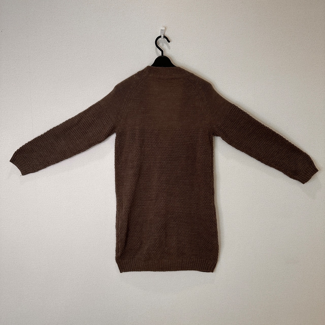 落ち着いたブラウン系(モカのような色味)で、ワンピースやパンツスタイルなど、様々なコーディネートに合わせやすい一着です。