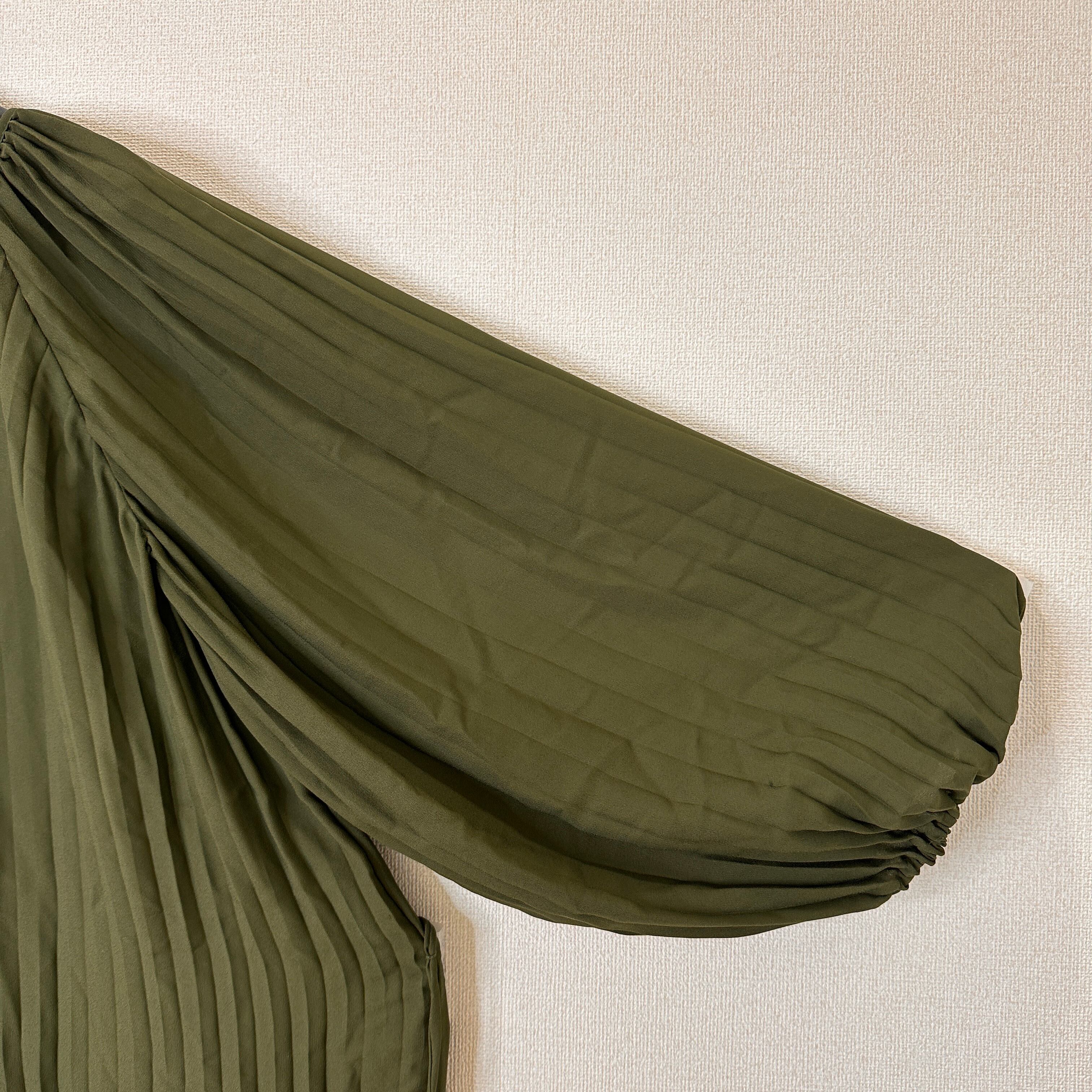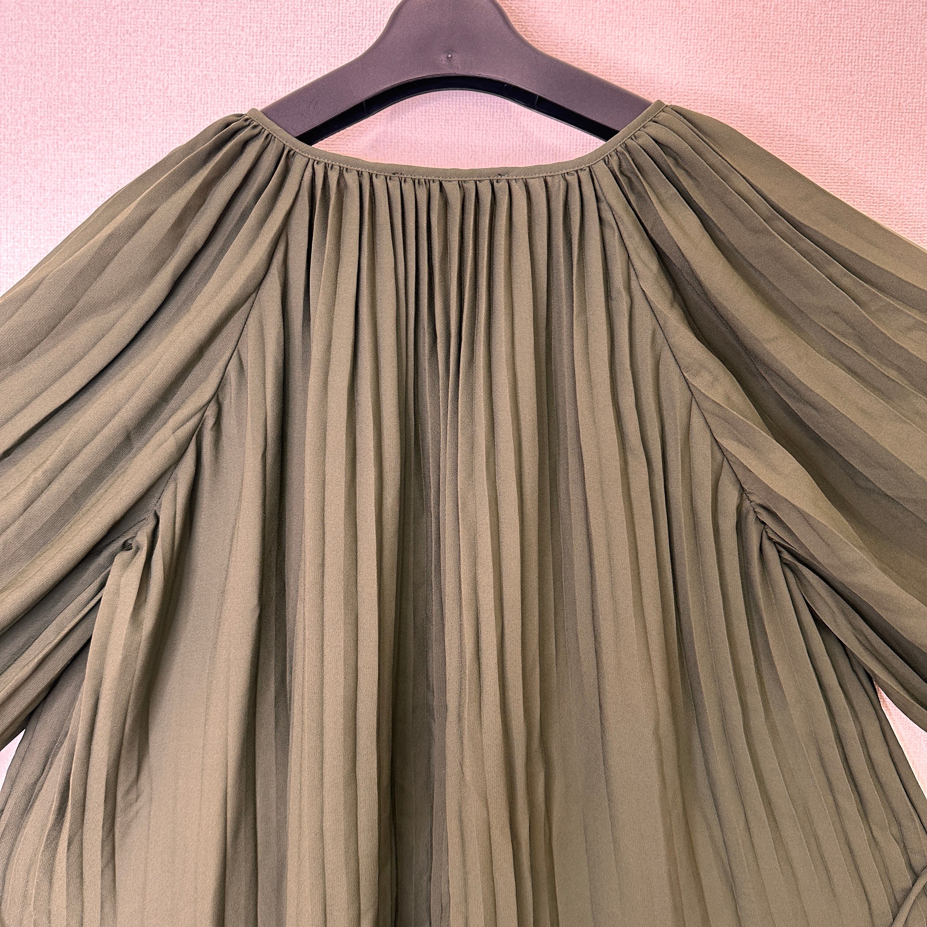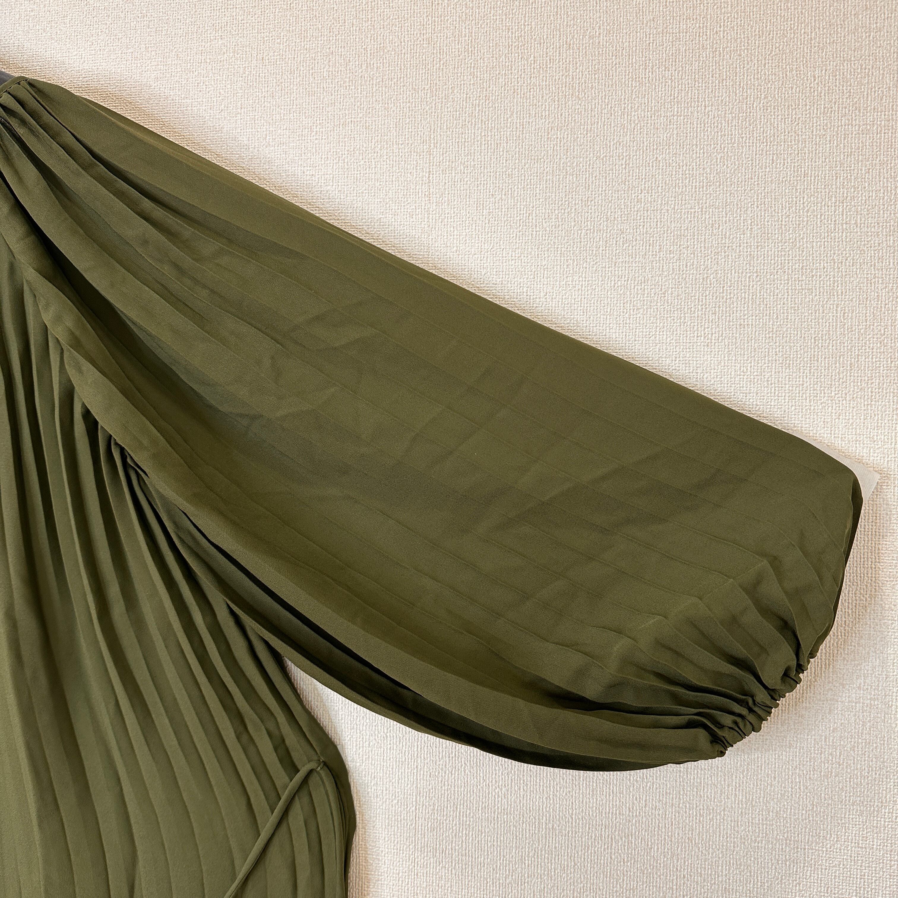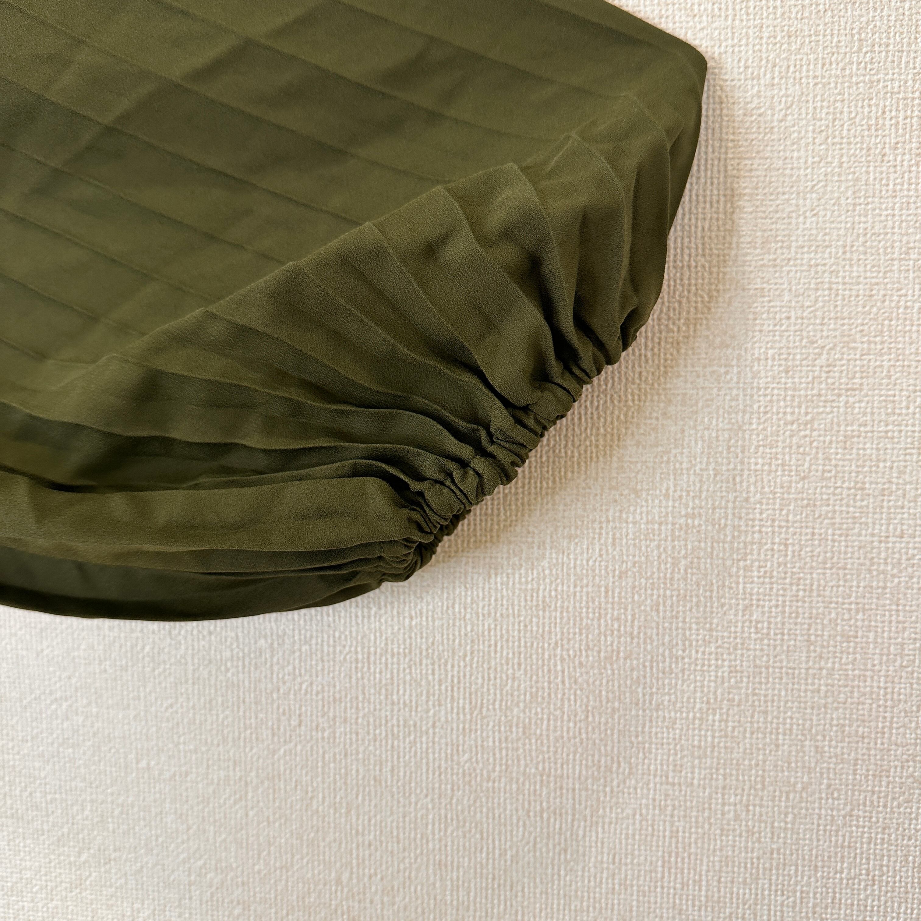 深みのあるカーキ/オリーブグリーン系の色味と、全体に入った細かなプリーツがエレガントな印象を与えます。