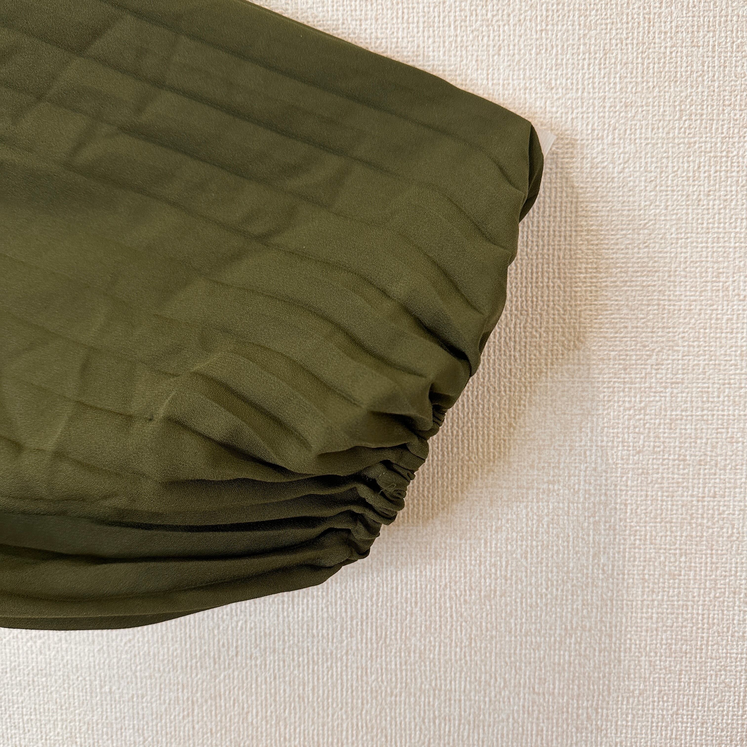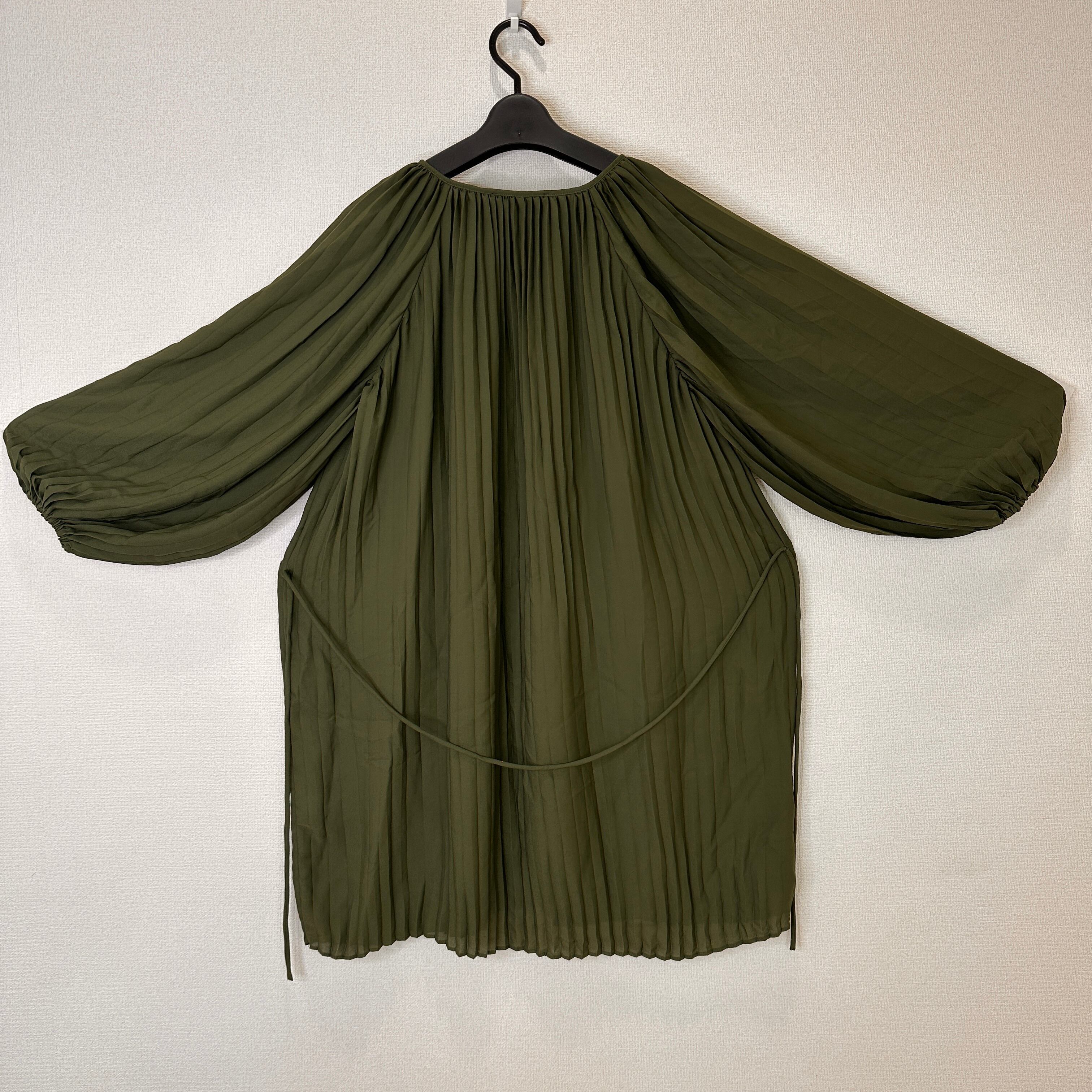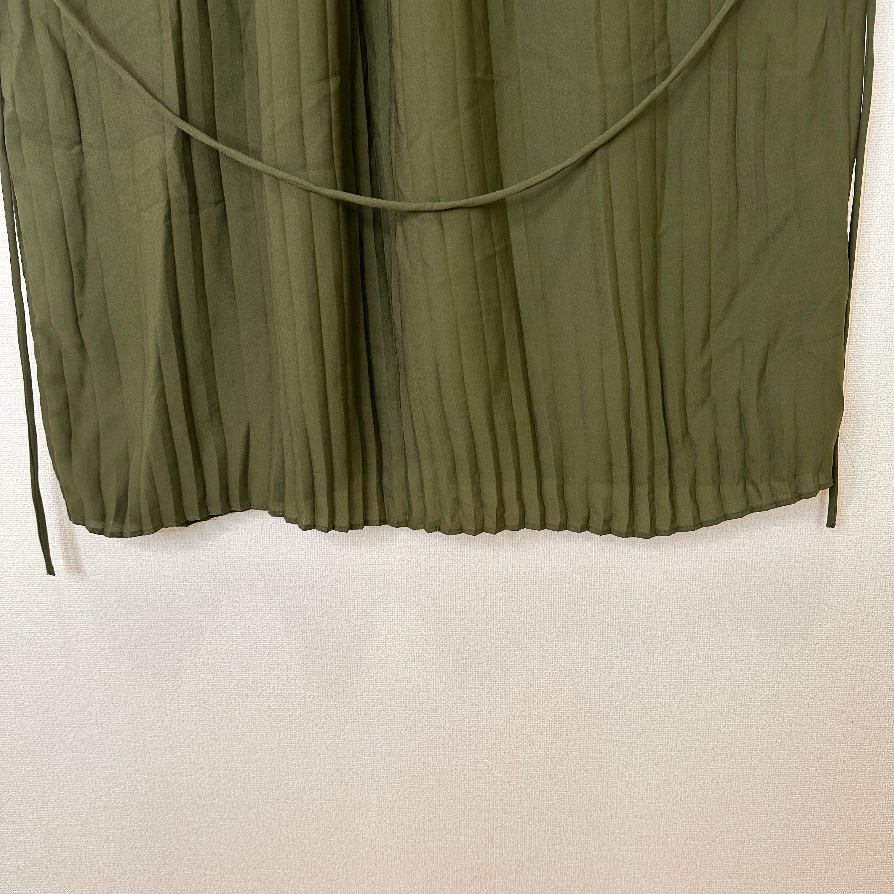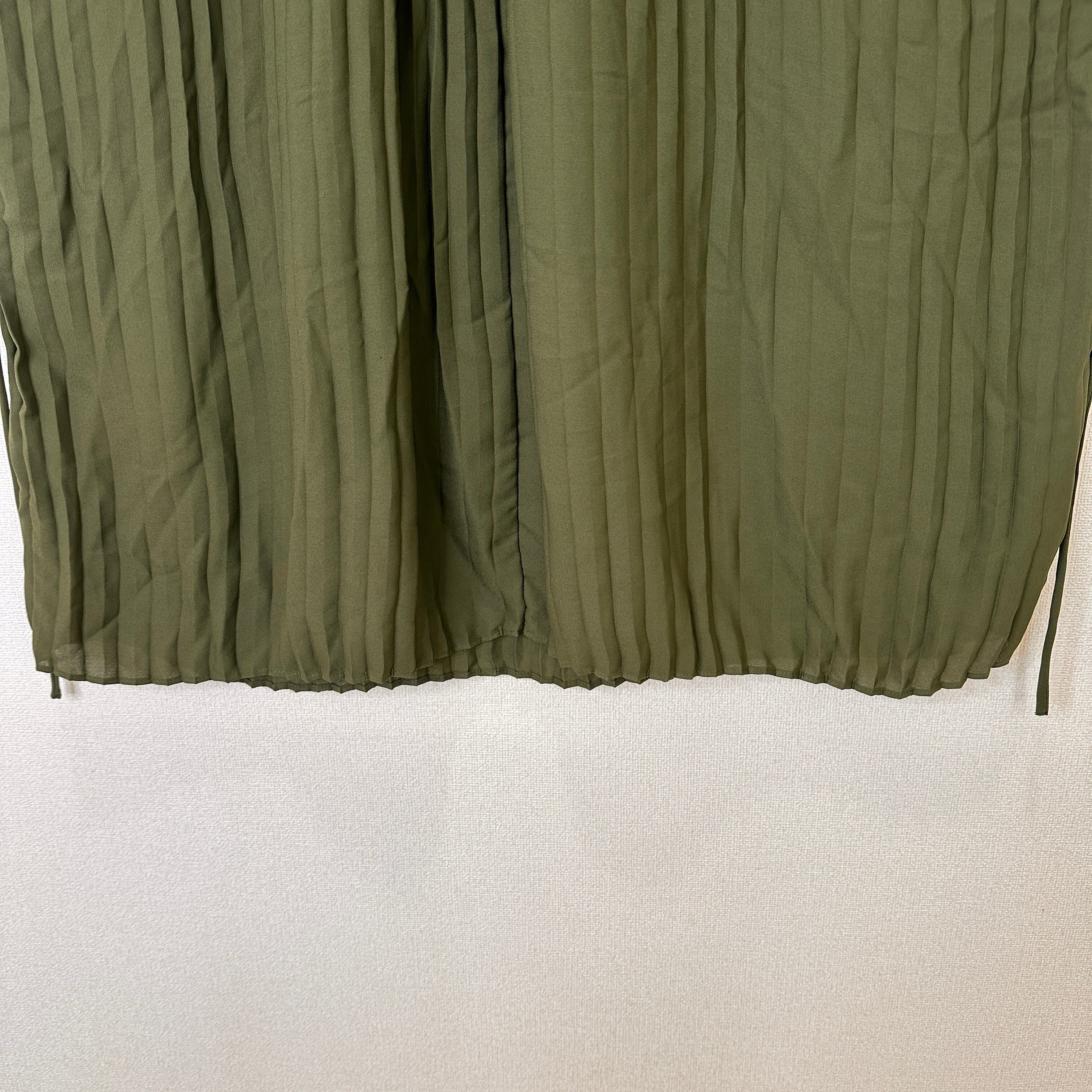 深みのあるカーキ/オリーブグリーン系の色味と、全体に入った細かなプリーツがエレガントな印象を与えます。