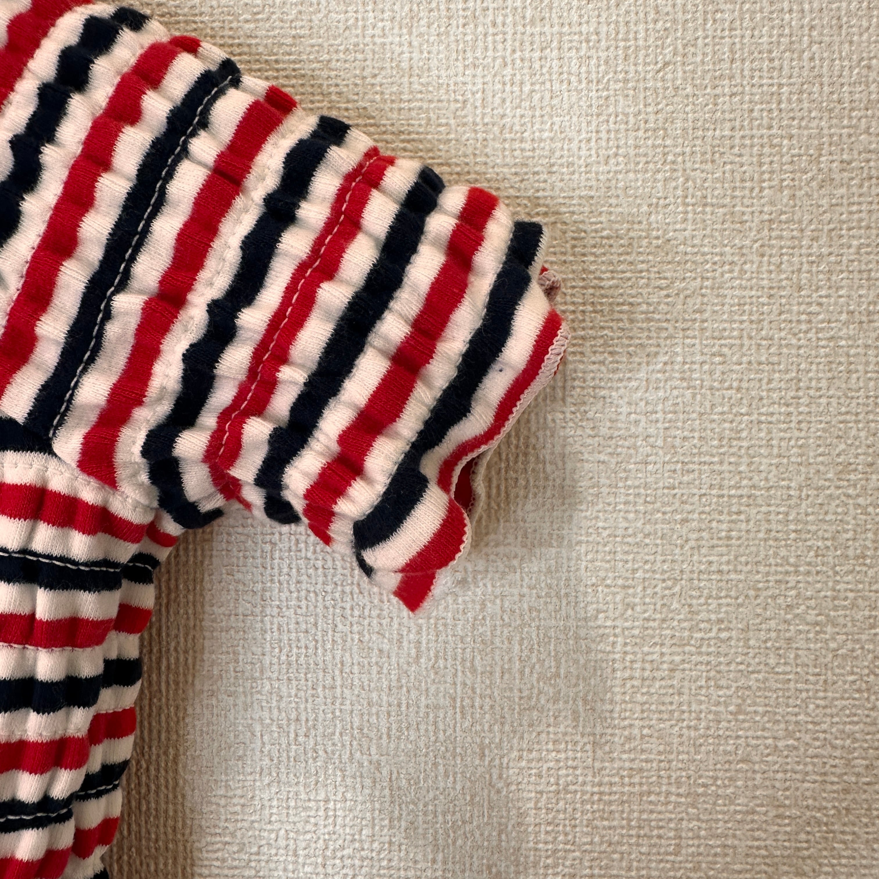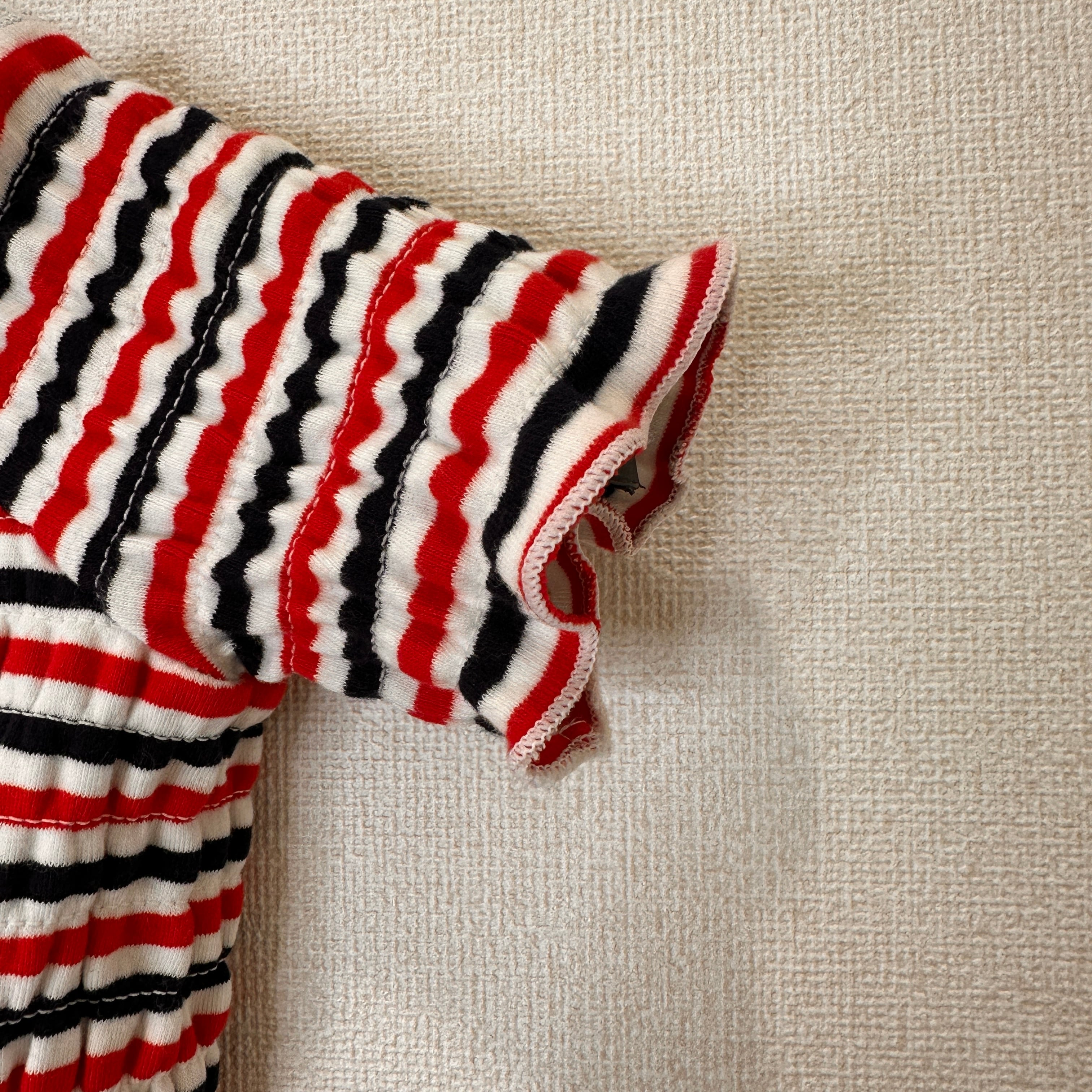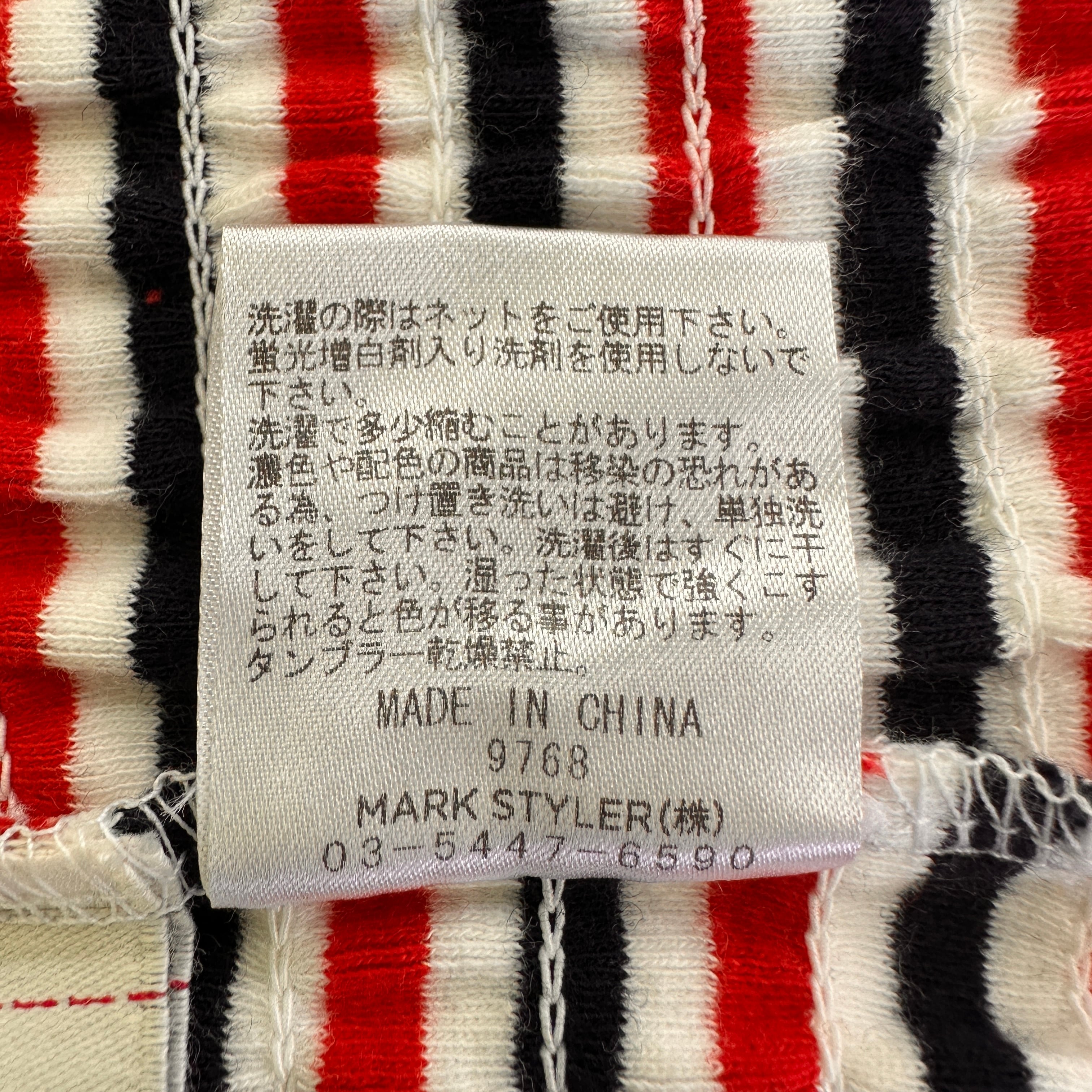 赤、白、黒のトリコロールカラーのボーダー柄が特徴で、全体にシャーリング(リブ加工)が施されているため、身体にフィットするコンパクトなシルエットです。