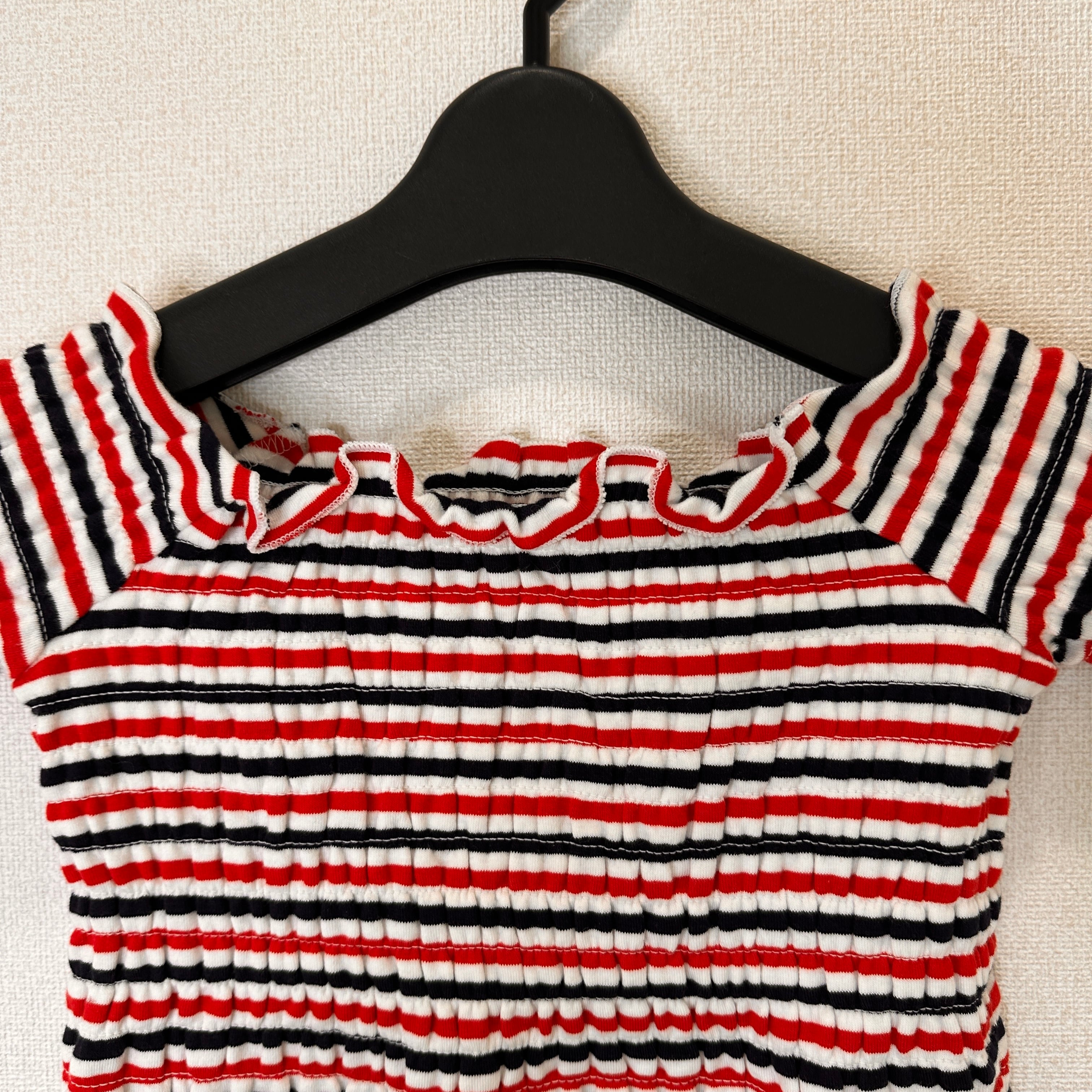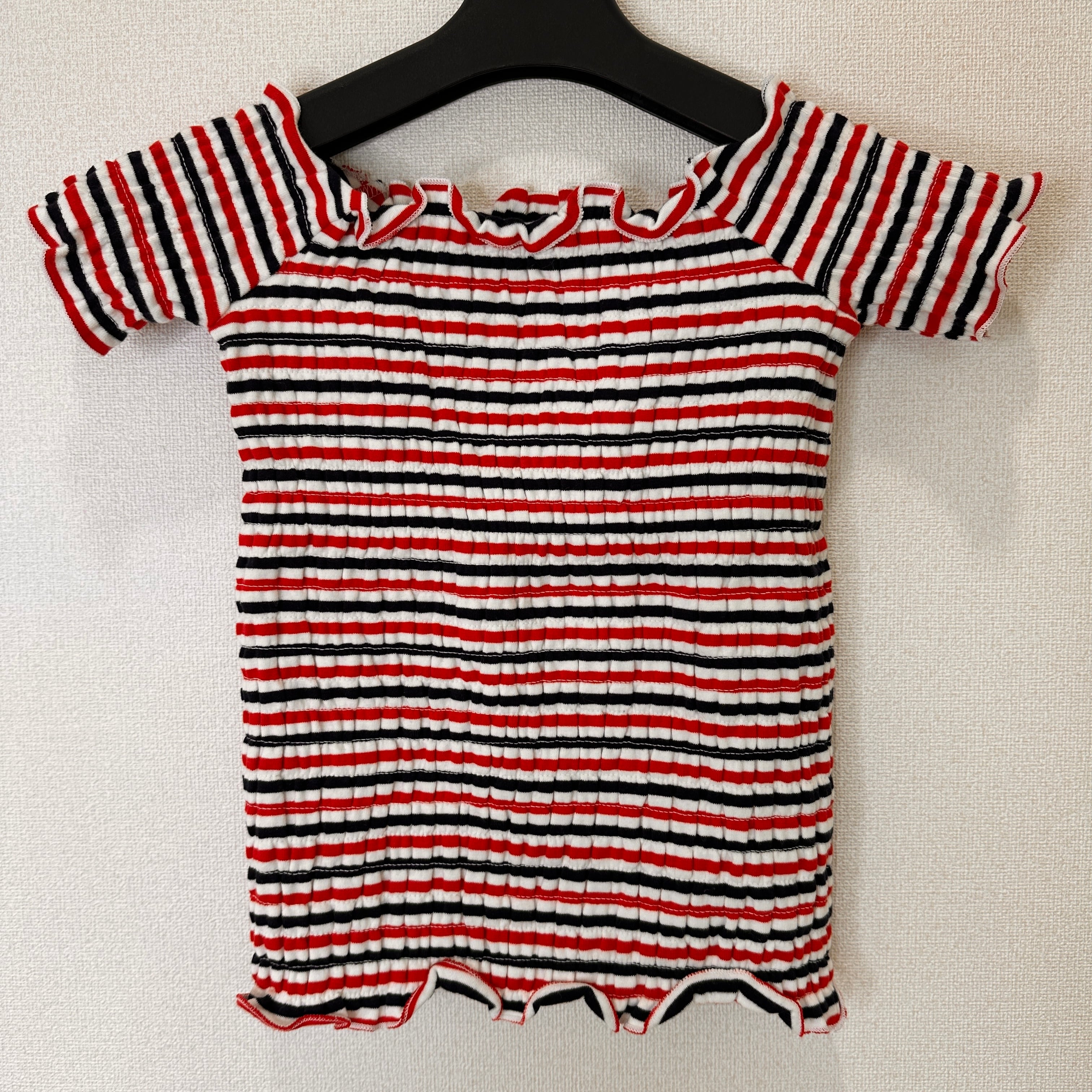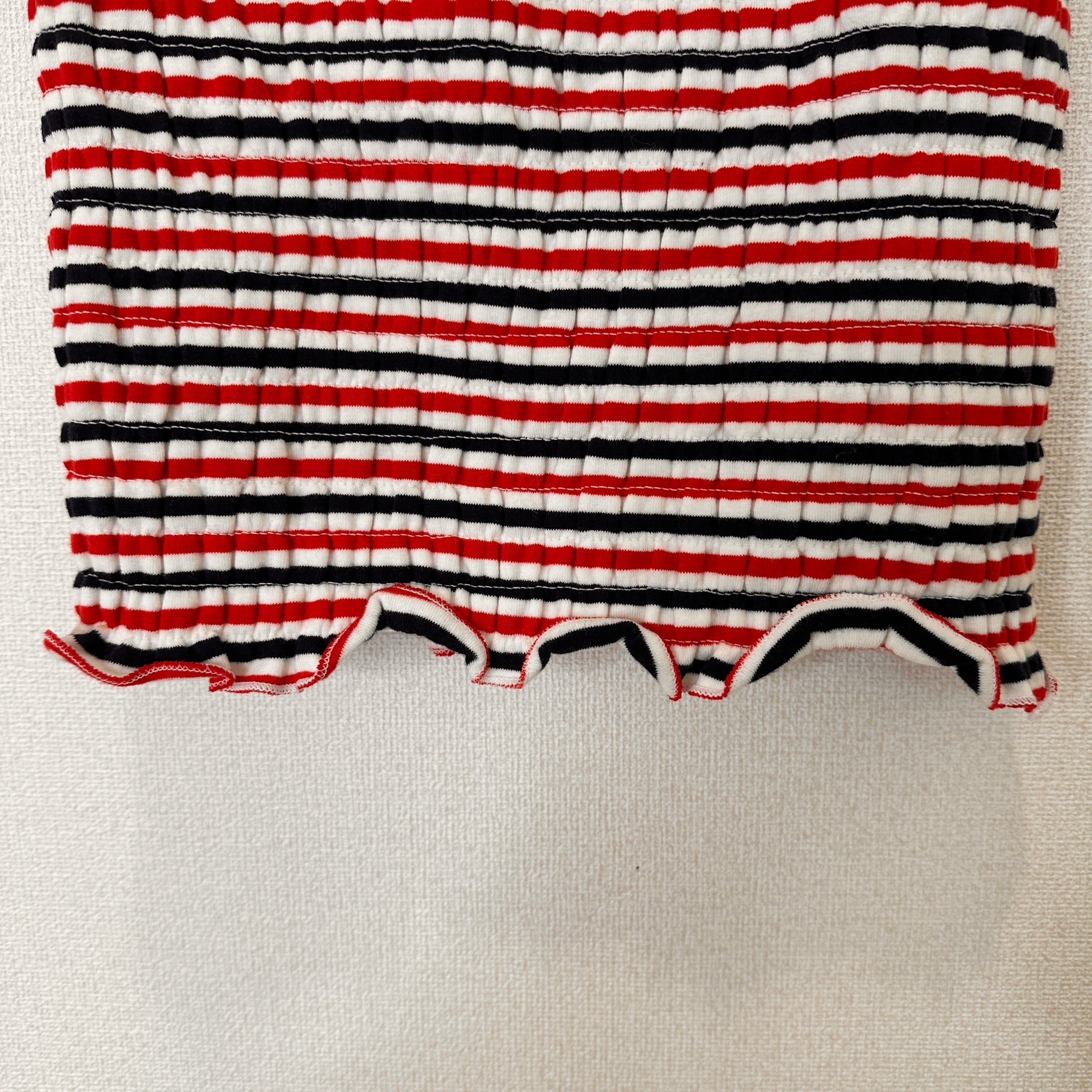 目立った傷や汚れはありませんが、中古品にご理解いただける方のみご購入をお願いいたします。フリル付きオフショルダーの赤・白・黒ストライプのリブ編みトップス。