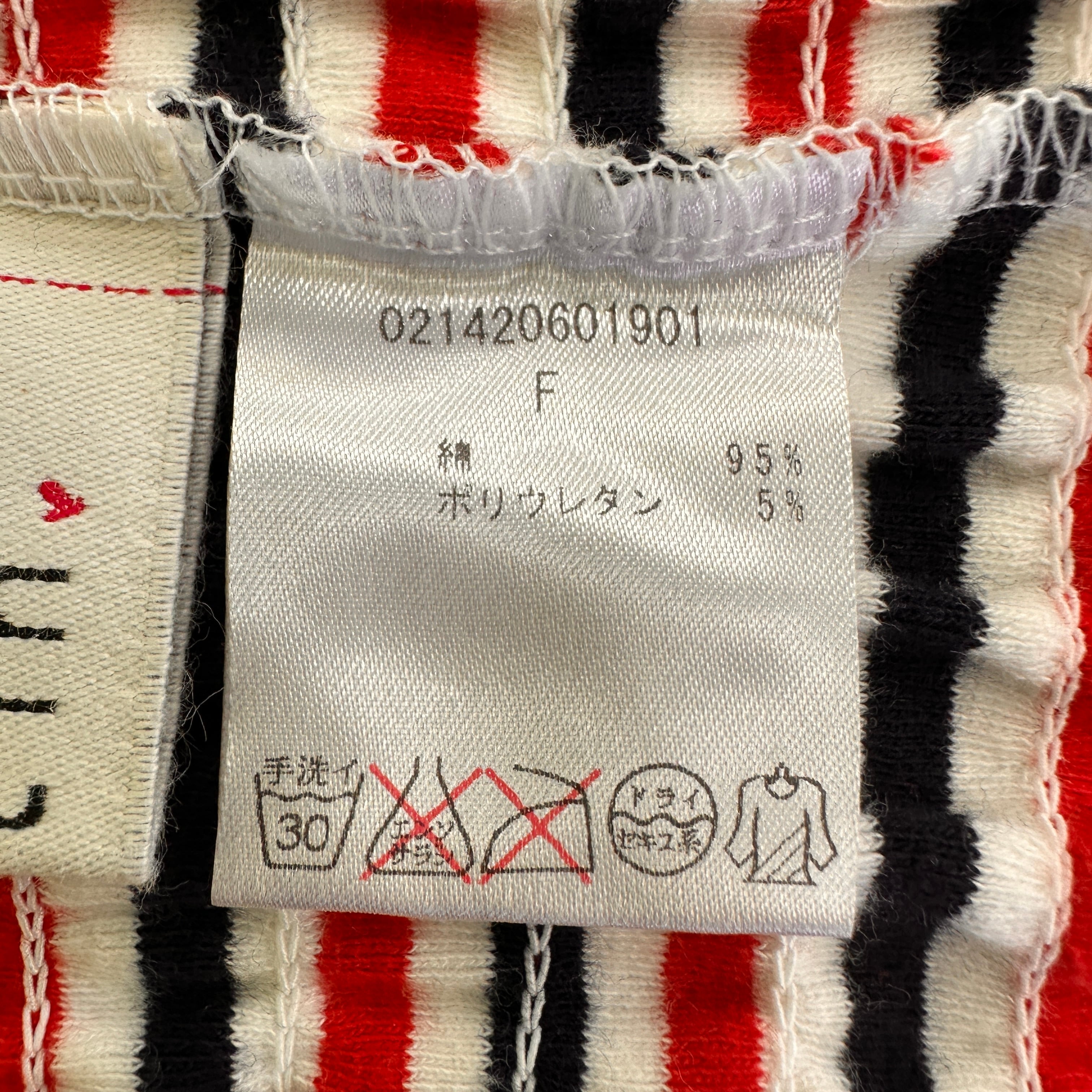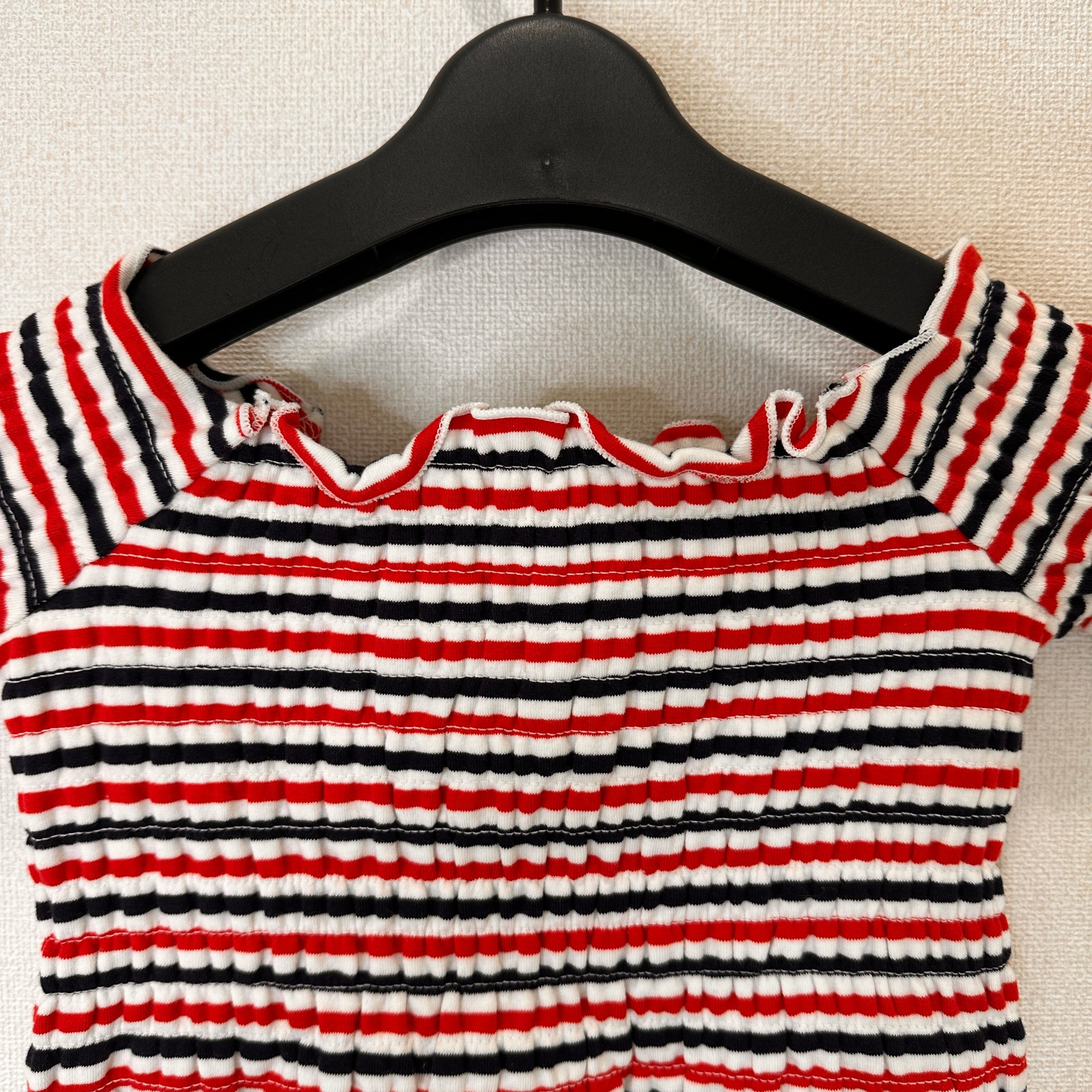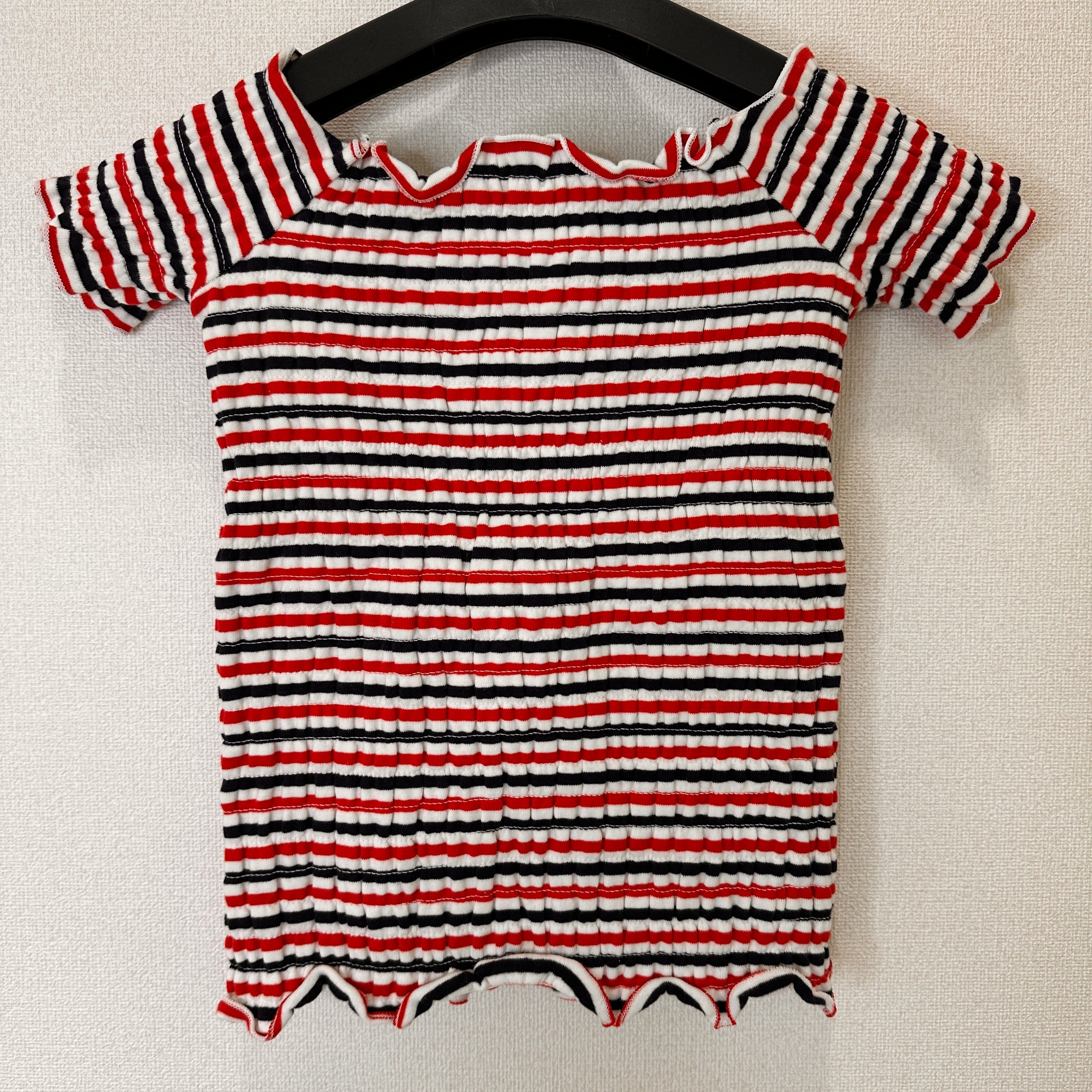 目立った傷や汚れはありませんが、中古品にご理解いただける方のみご購入をお願いいたします。フリル付きオフショルダーの赤・白・黒ストライプのリブ編みトップス。