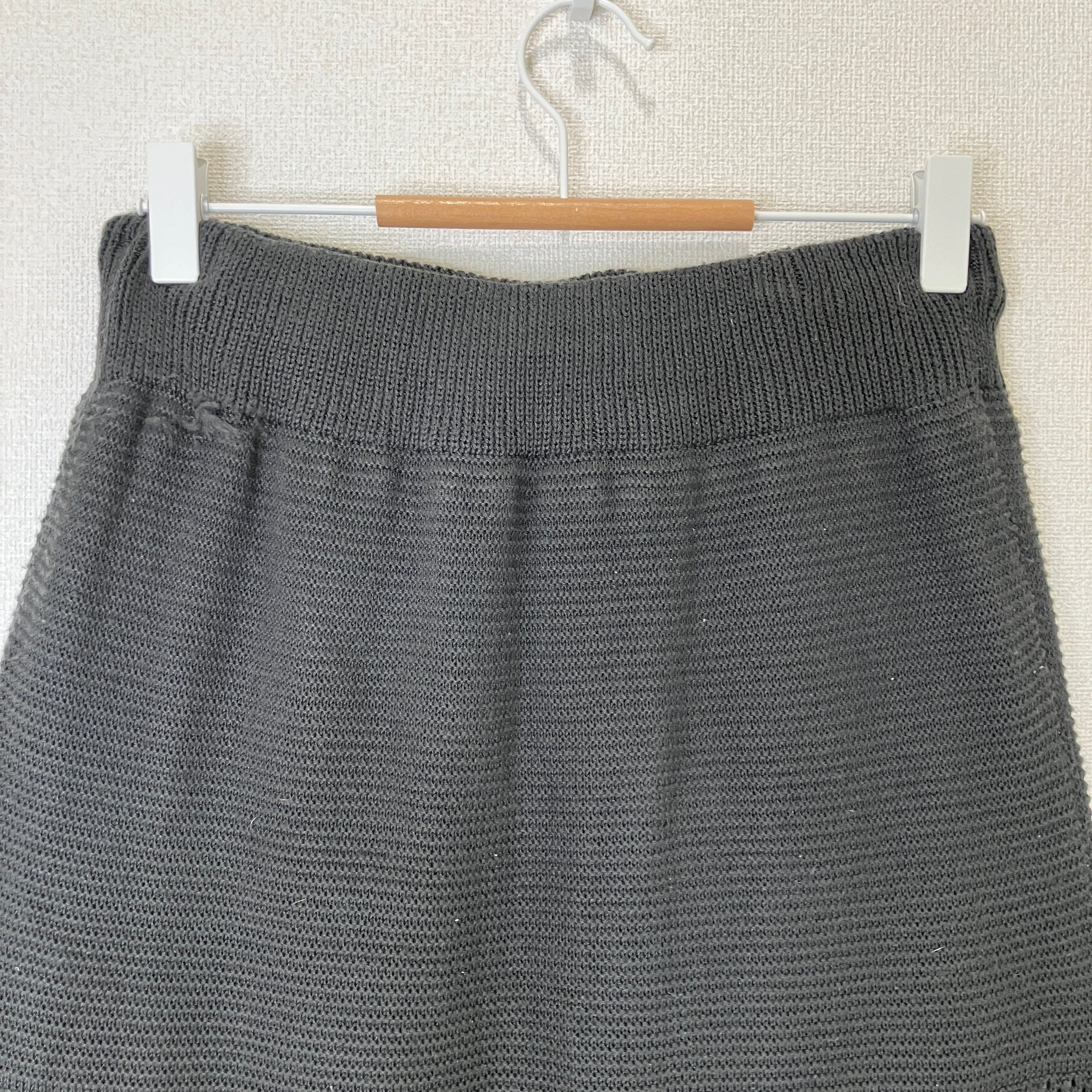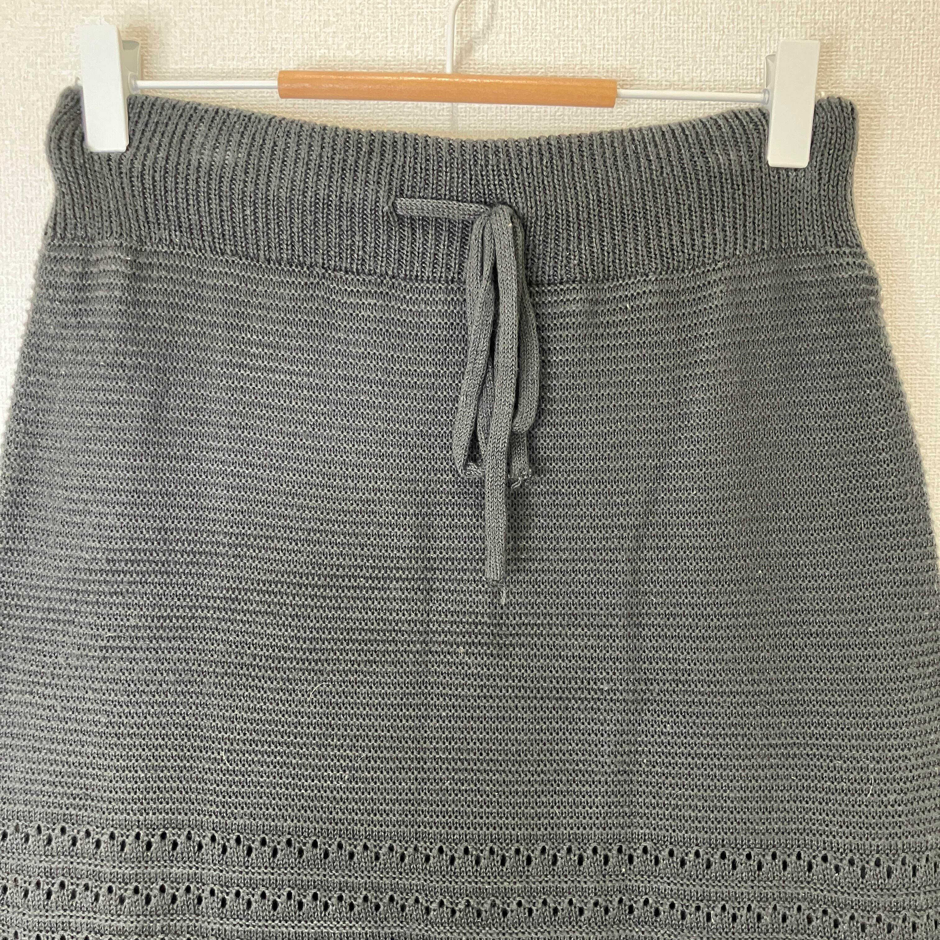 目立った傷や汚れはありませんが、中古品にご理解いただける方のみご購入をお願いいたします。 ニット素材のレース編みロングスカート、ドローストリング付き。