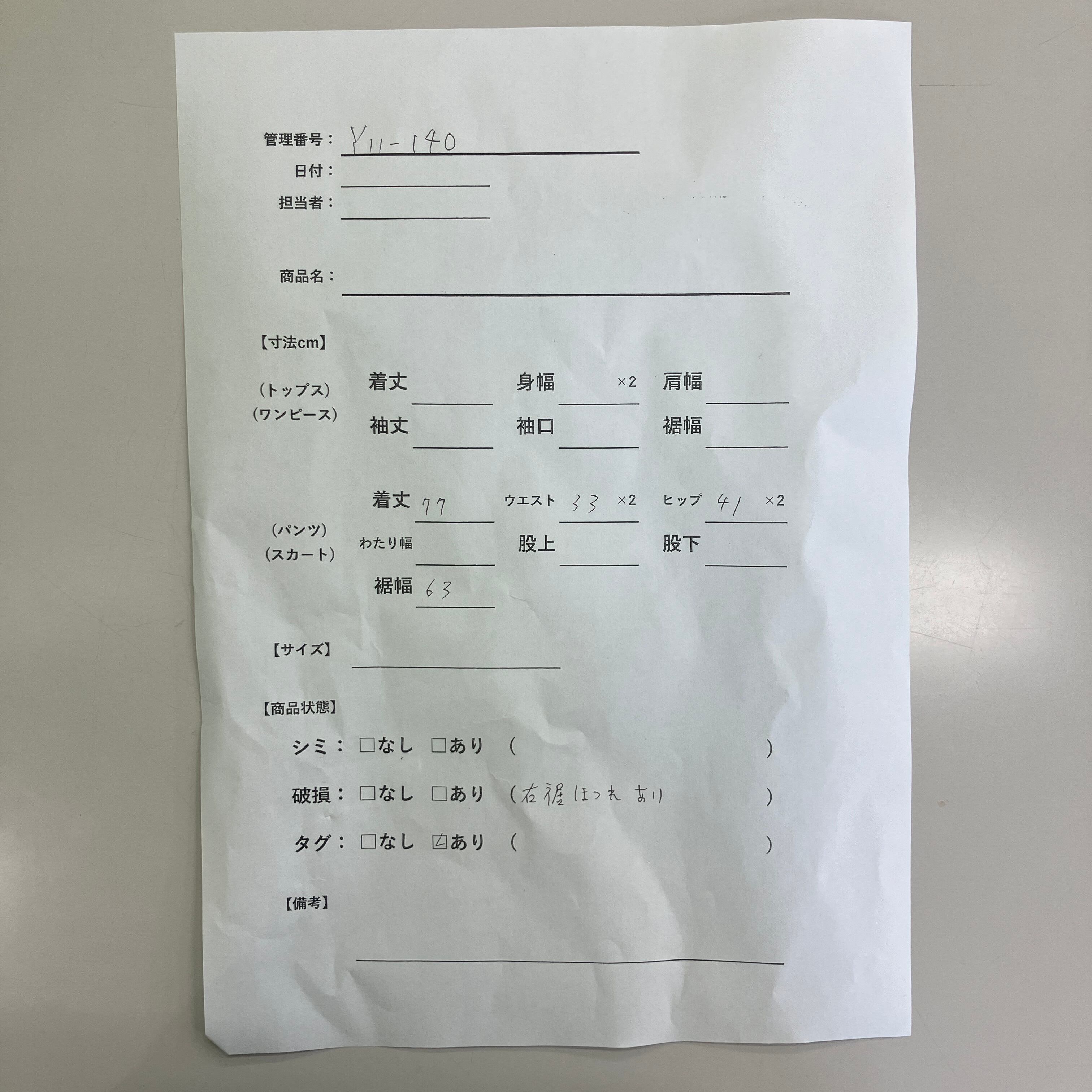 破損: あり (裾右側ほつれ)