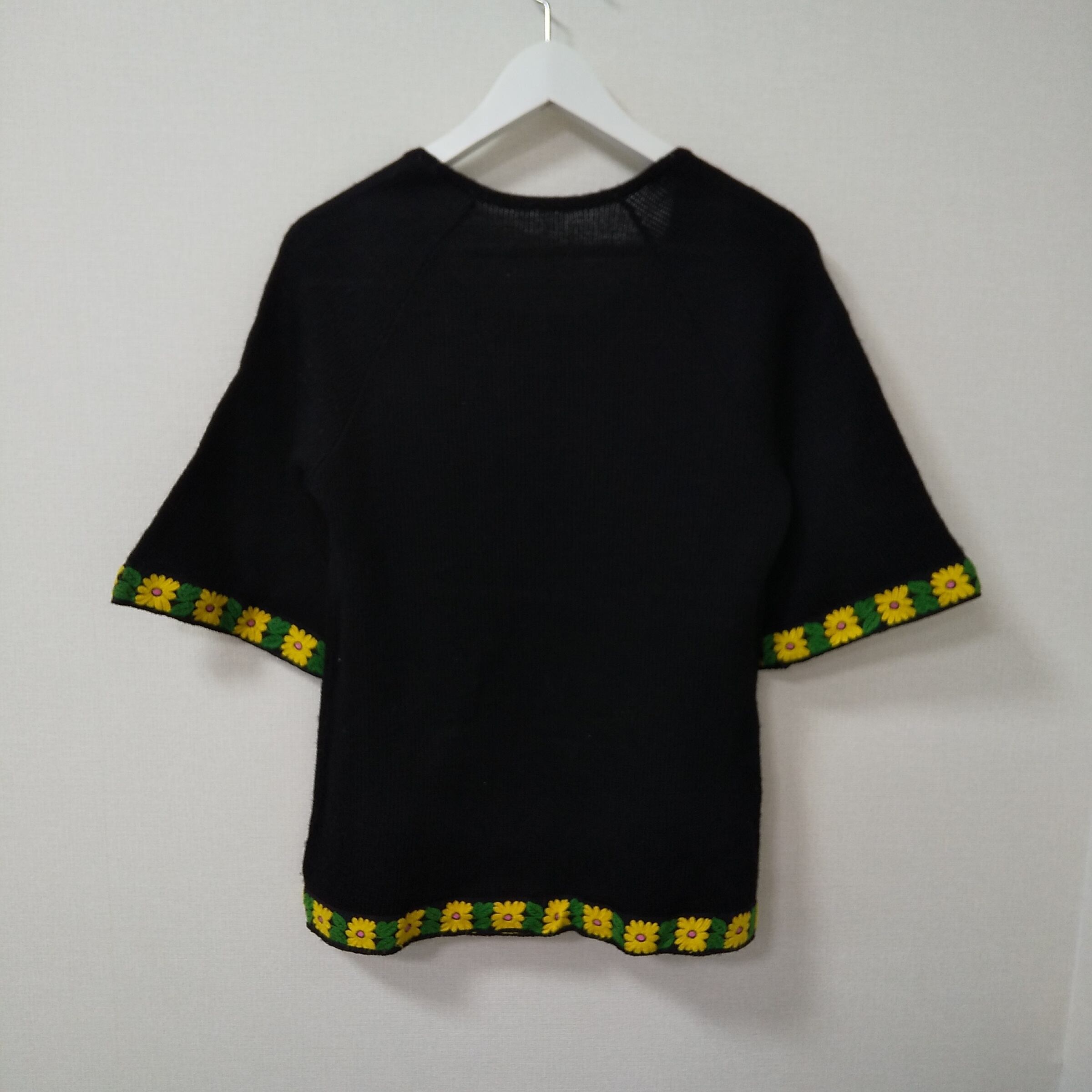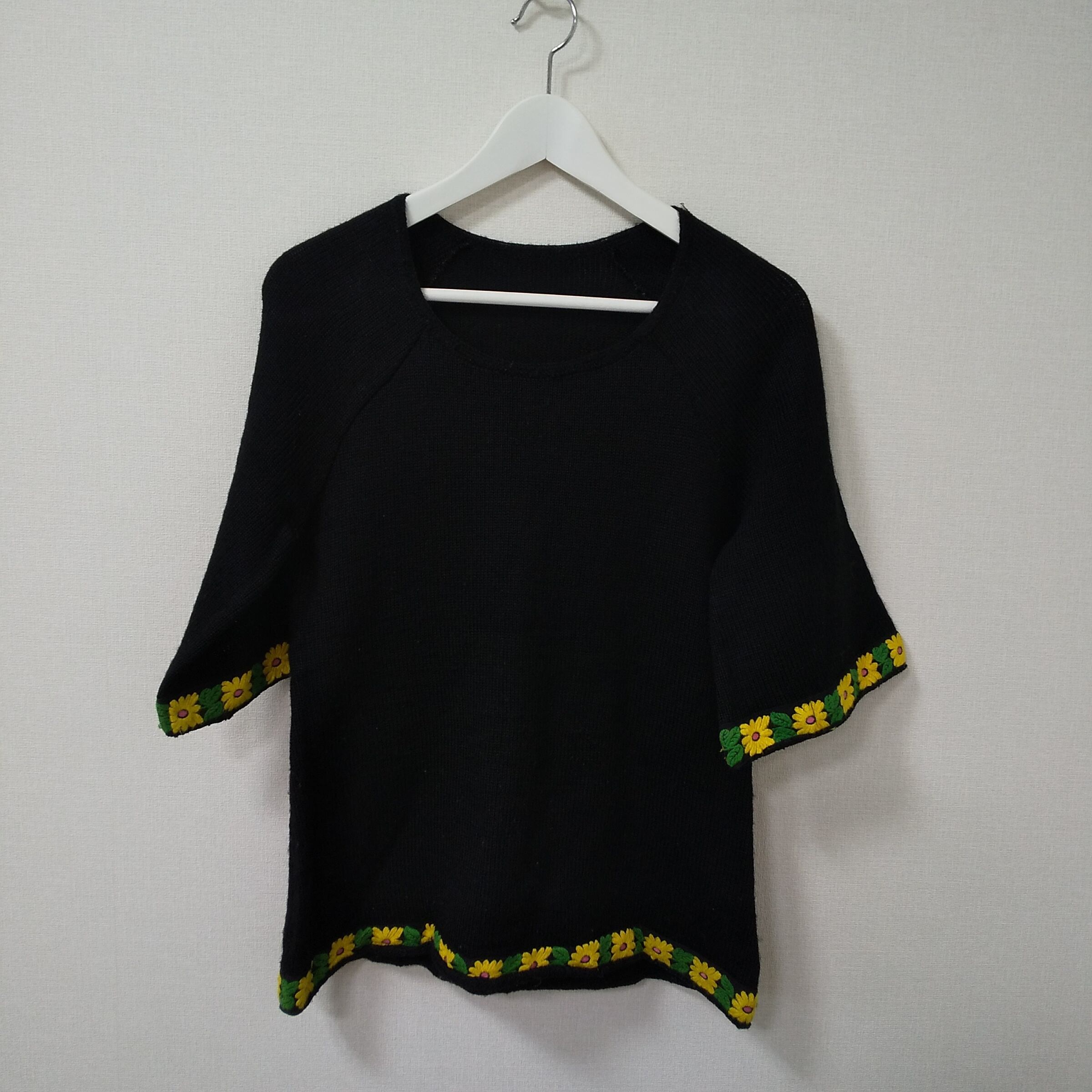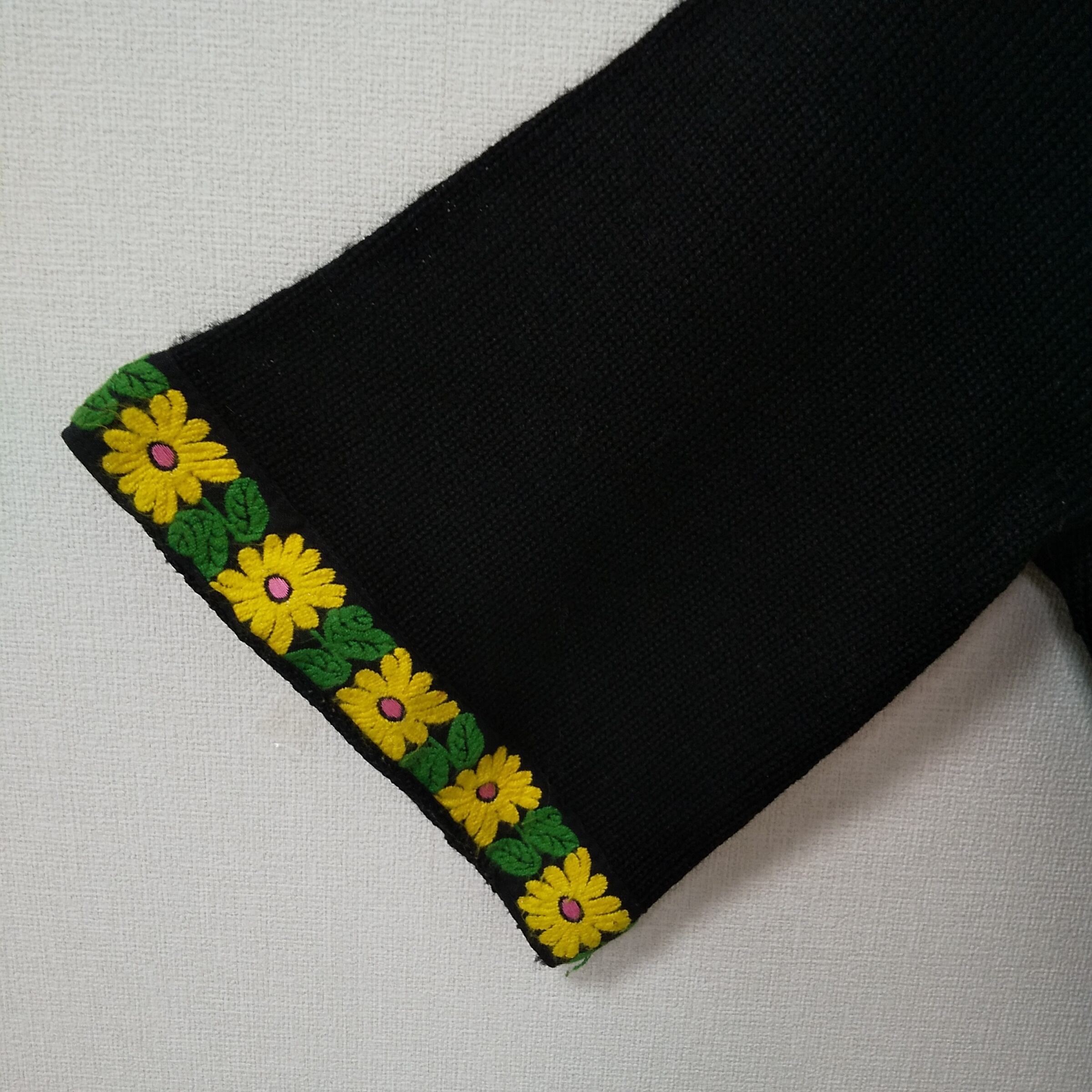 レトロで可愛い花柄刺繍が魅力的な黒ニットです。袖口と裾部分に施された黄色い花と緑の葉の刺繍がアクセントとなり、シンプルな黒ベースに華やかさをプラスしています。花の中心にはピンク色のワンポイントが入っており、繊細で立体感のある仕上がりです。