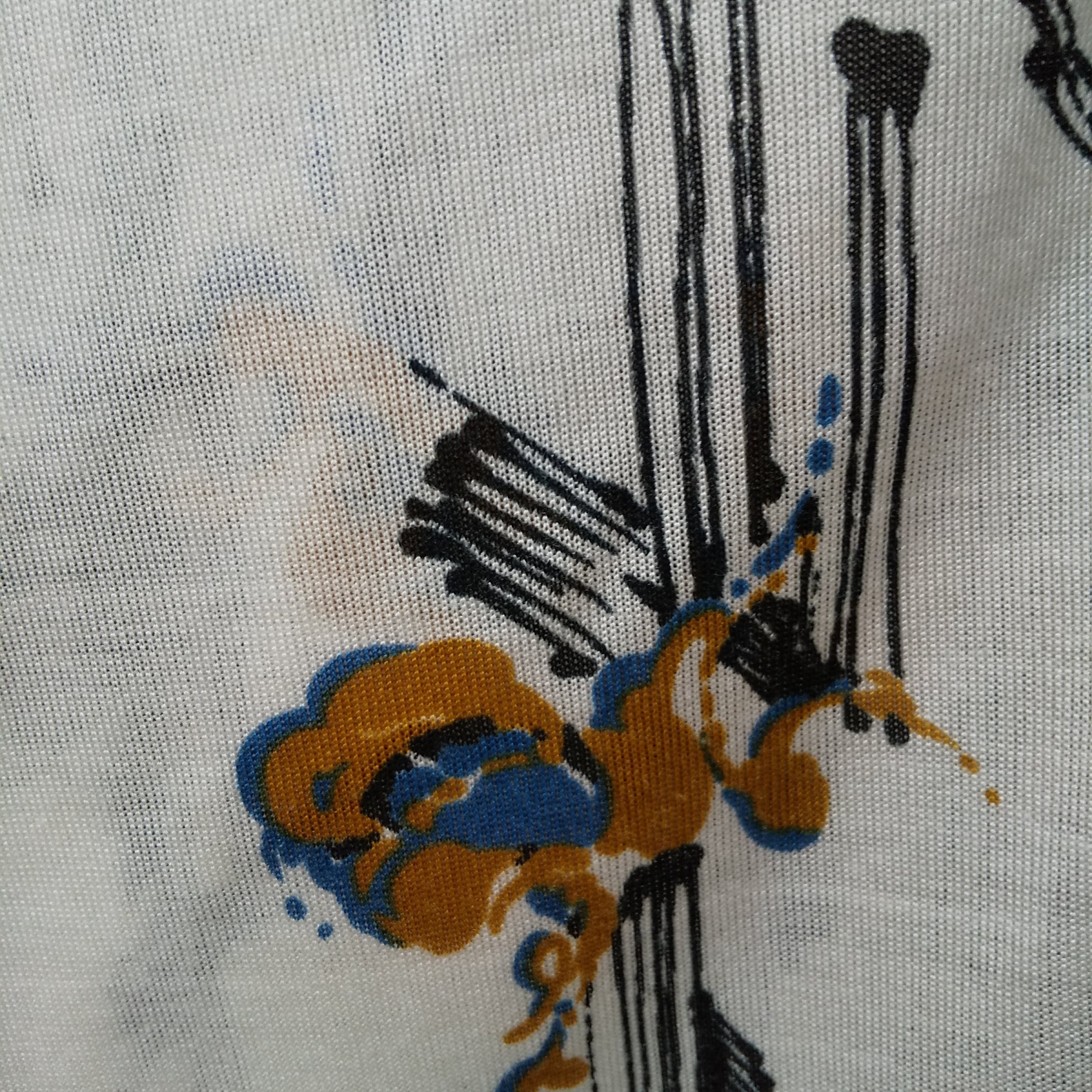 ホワイトをベースに、オレンジ、青、黒系の幾何学模様が施されたレトロなデザインが特徴です。