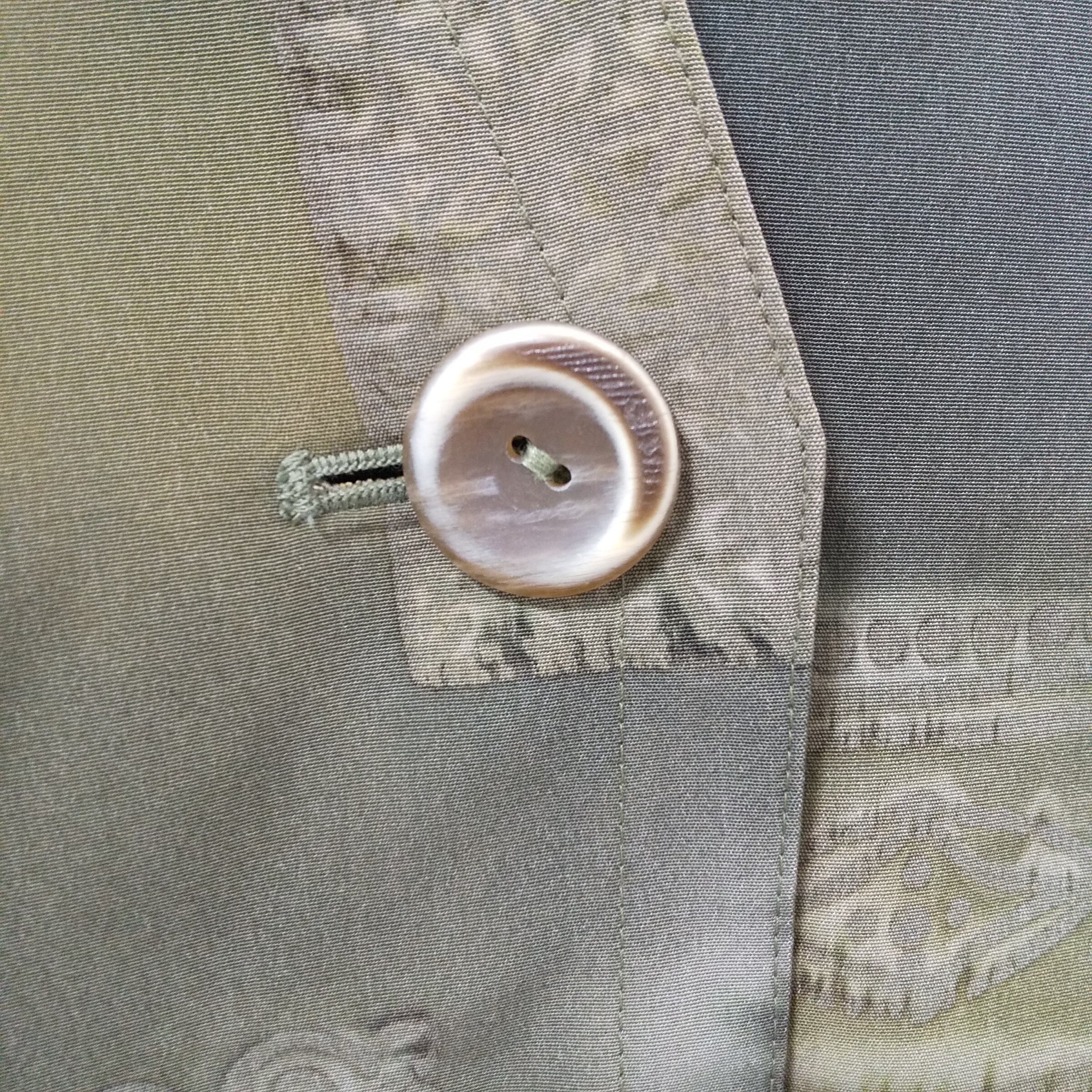 迅速かつ丁寧に対応させていただきます。オリーブグリーンのシルクのような光沢感のあるテーラードジャケット、ボタン付きのVネックデザイン。