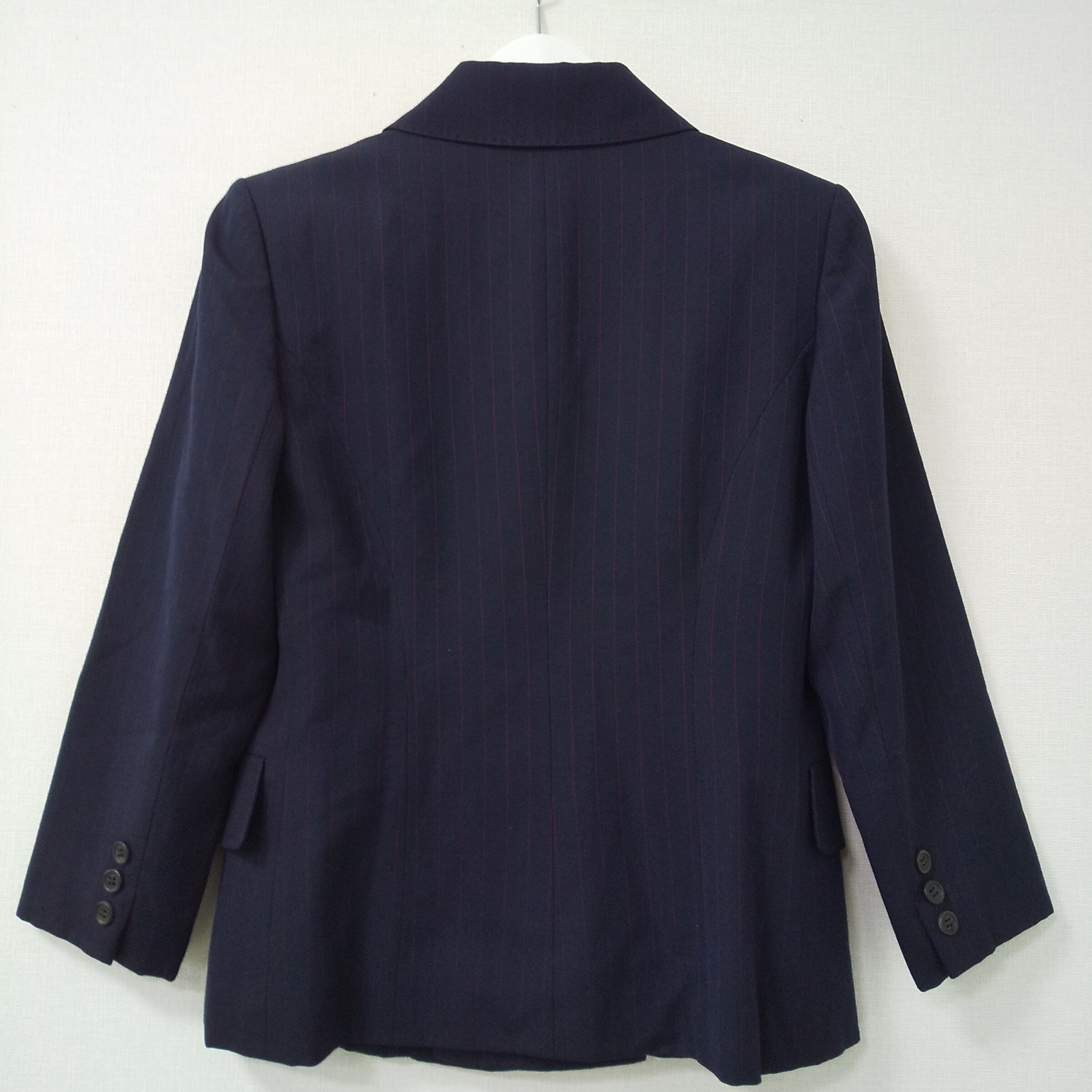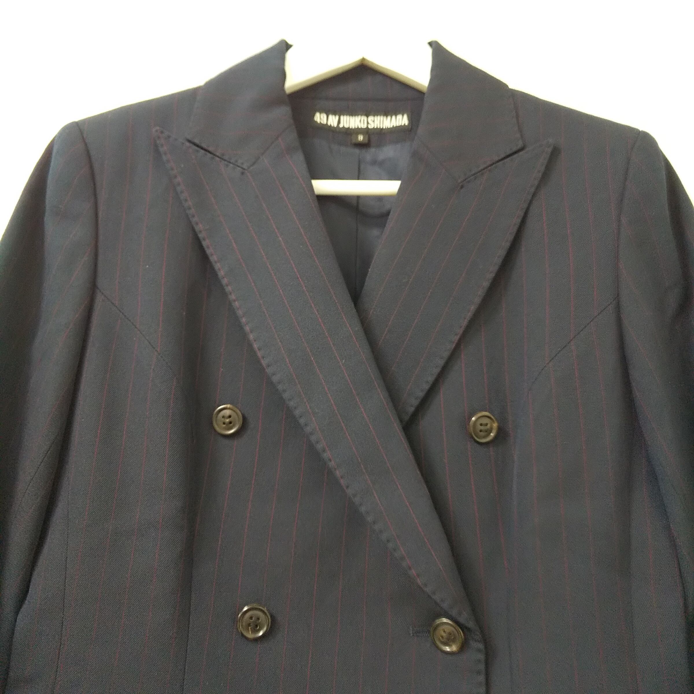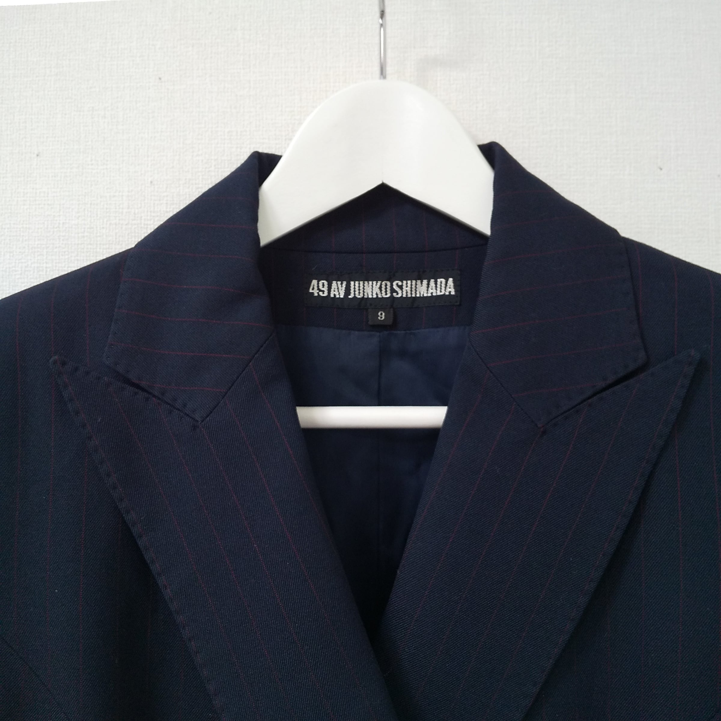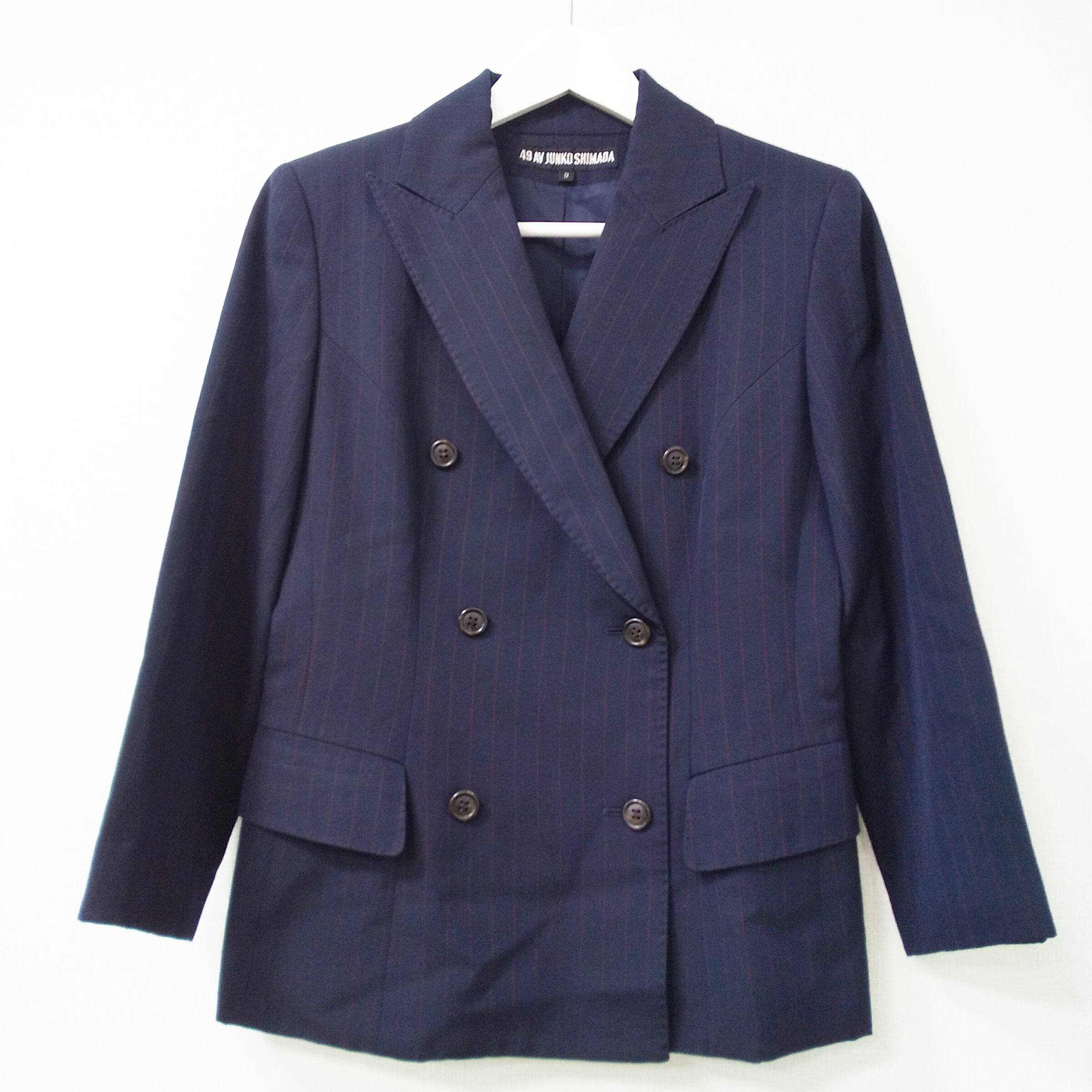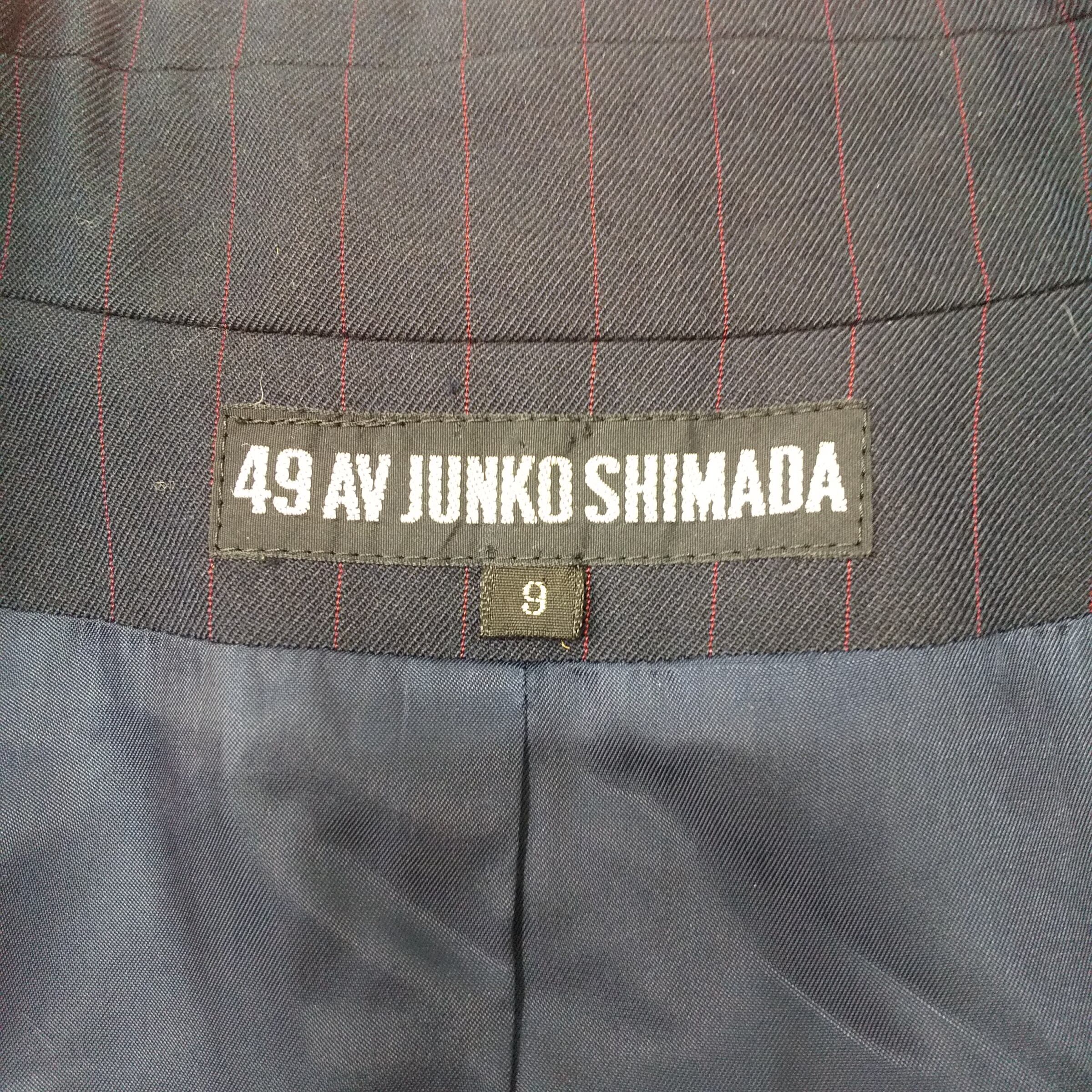 49AV JUNKO SHIMADA(ジュンコシマダ)のダブルブレステッドジャケットです。上品なネイビーカラーにエンジ色の立て線が入ったピンストライプ柄が特徴的で、秋冬シーズンに活躍する一着です。