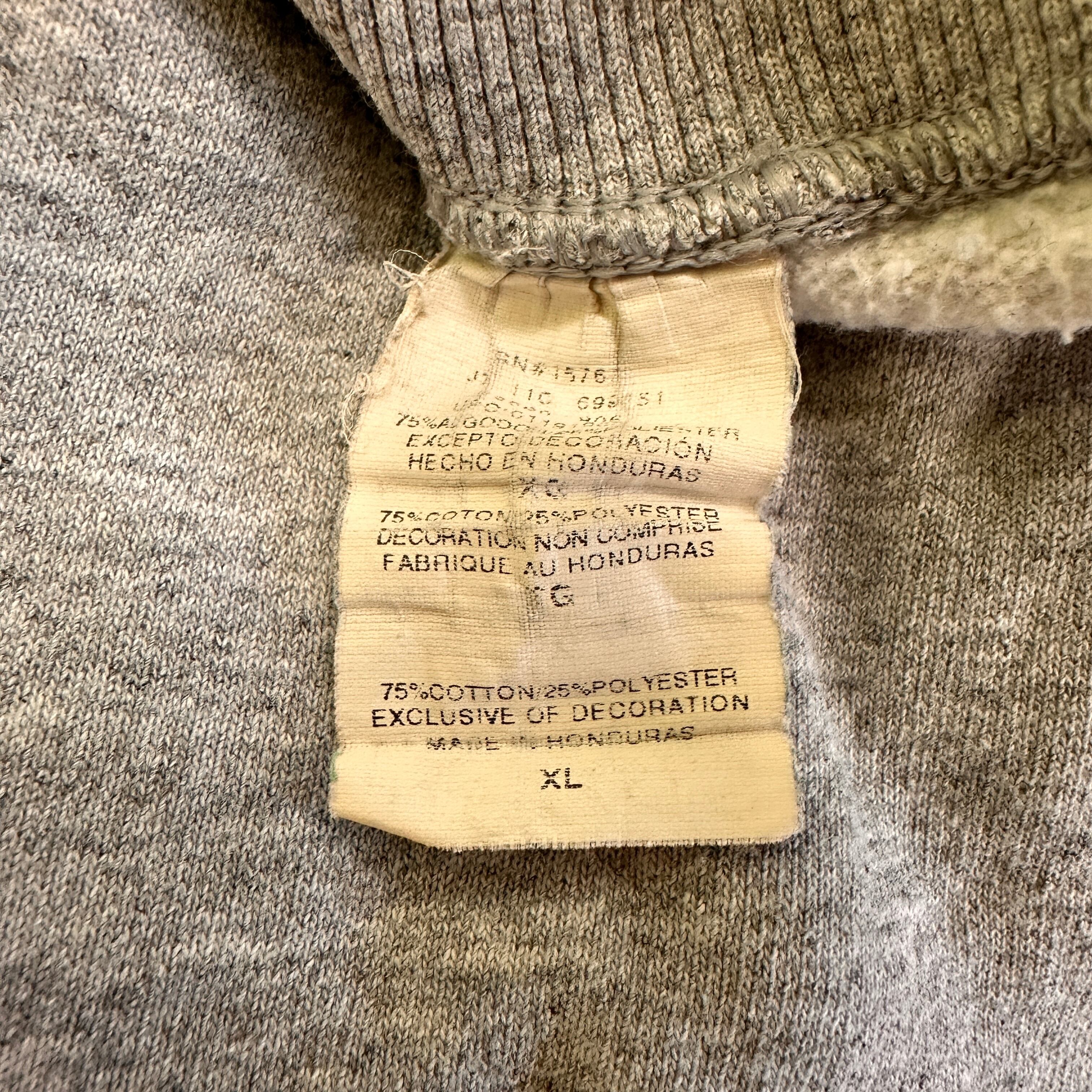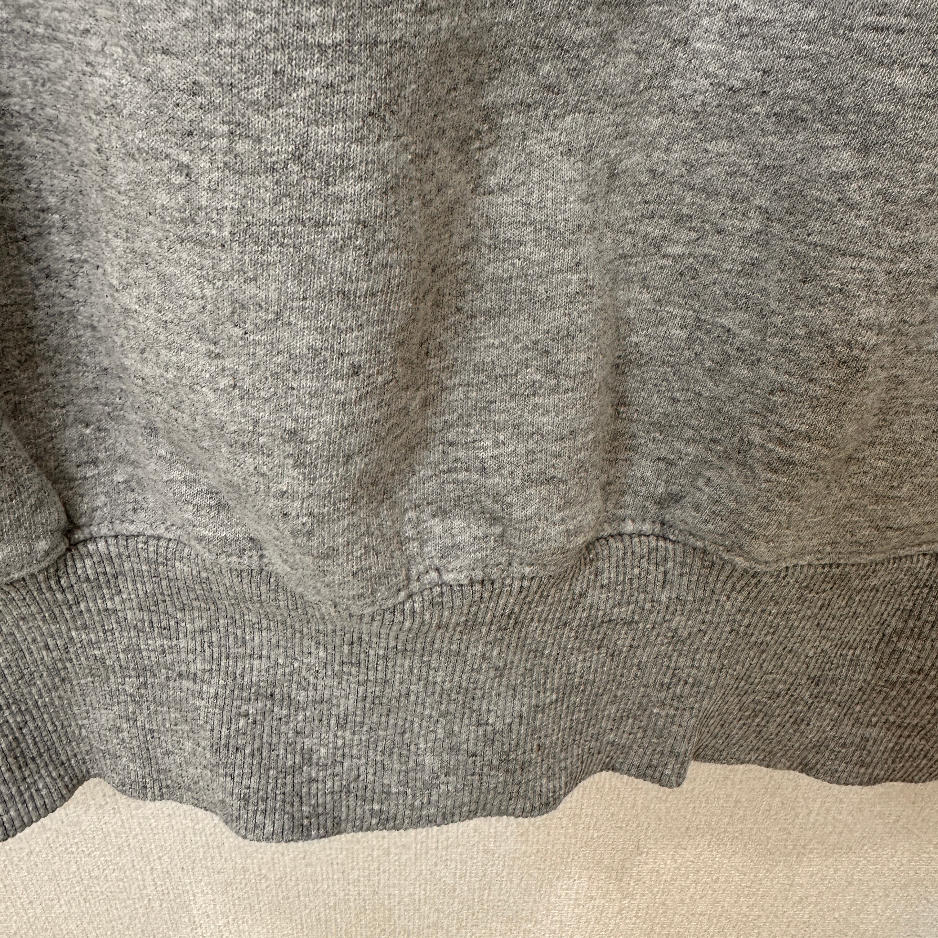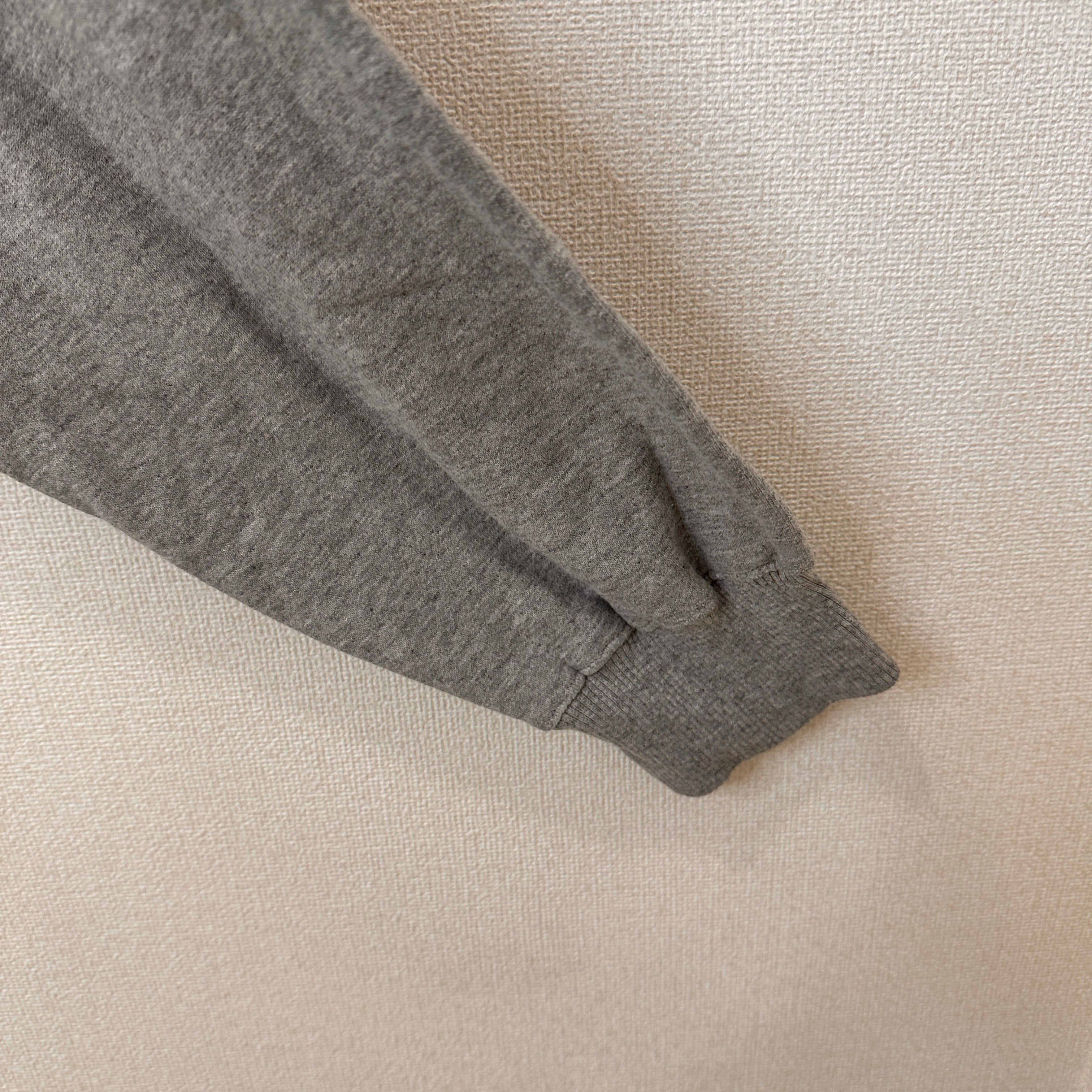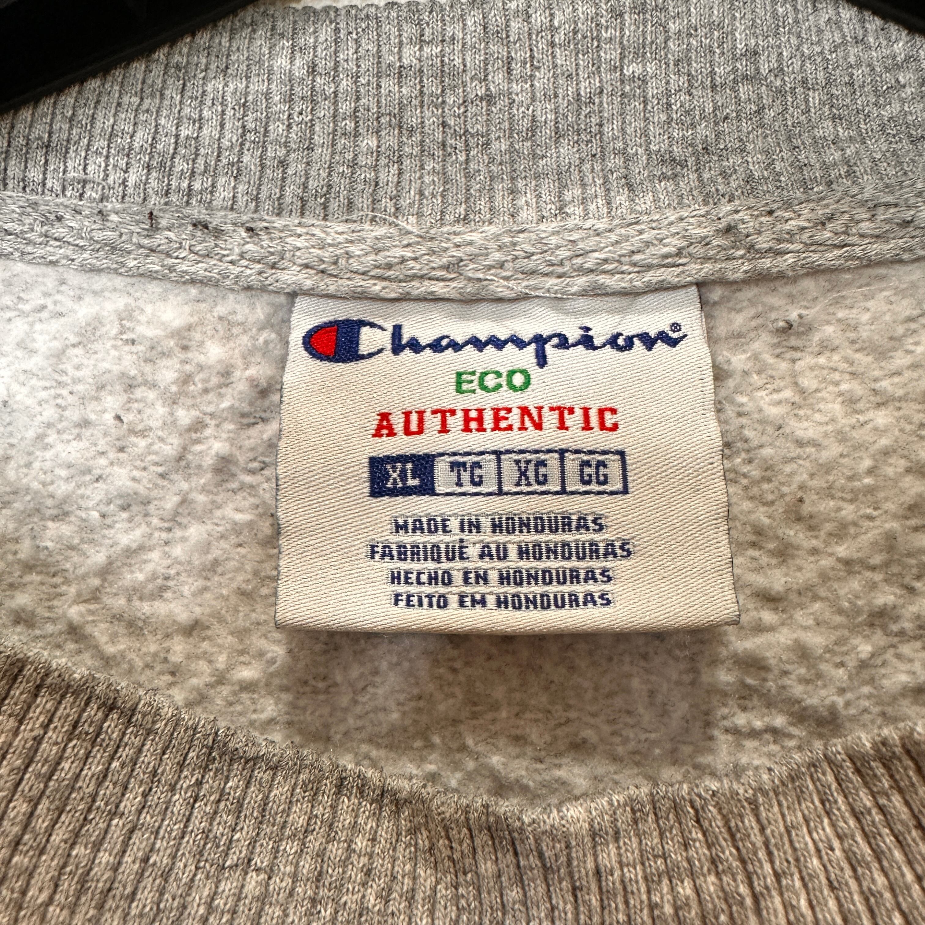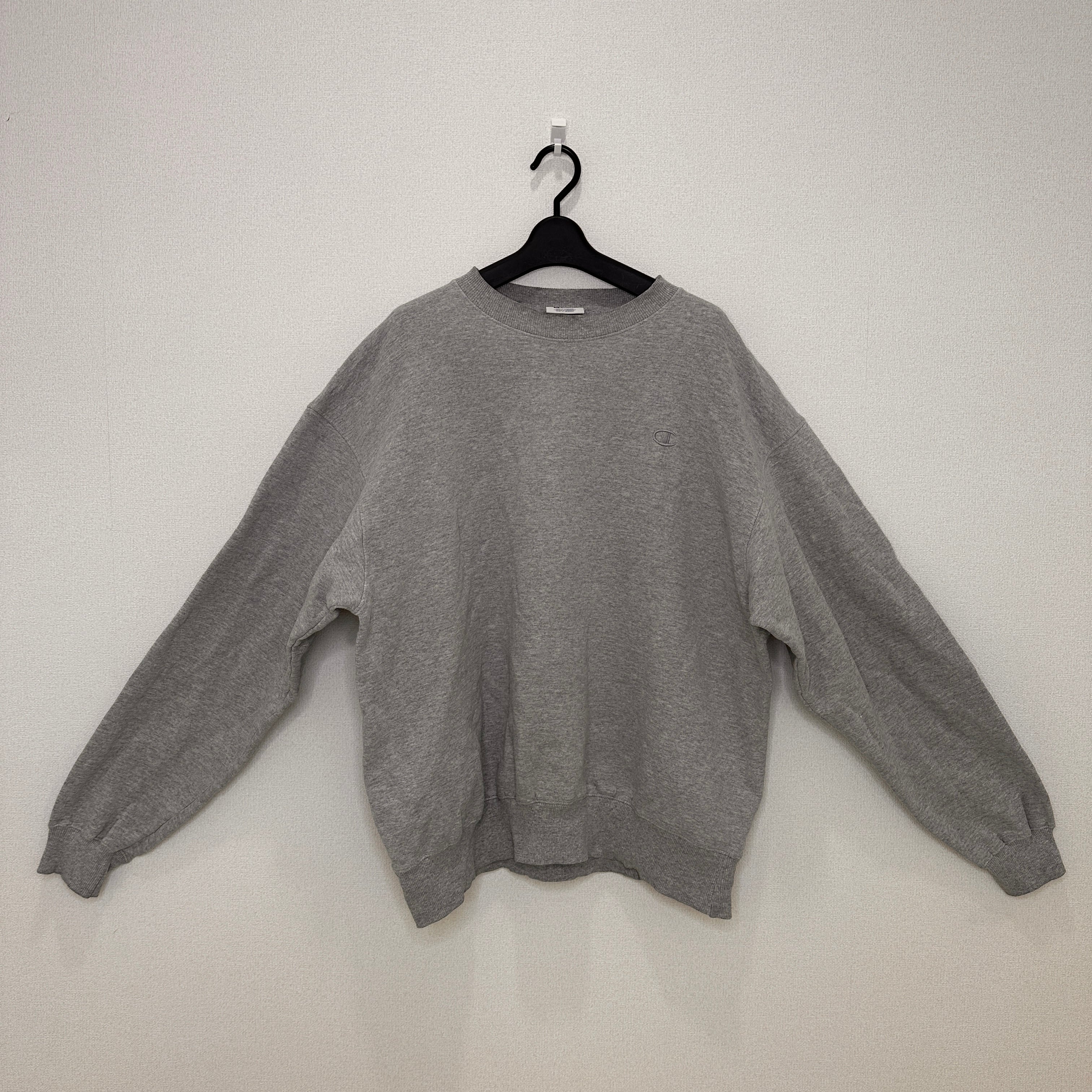 Champion(チャンピオン)のグレーのクルーネックスウェットシャツです。胸元にワンポイントのCロゴ刺繍、左袖口にもブランドアイコンのCマークが付いたシンプルなデザインです。ECOシリーズで、素材はコットン75%・ポリエステル25%。XLのゆったりしたサイズ感で男女問わず着用できます。ホンジュラス製です。