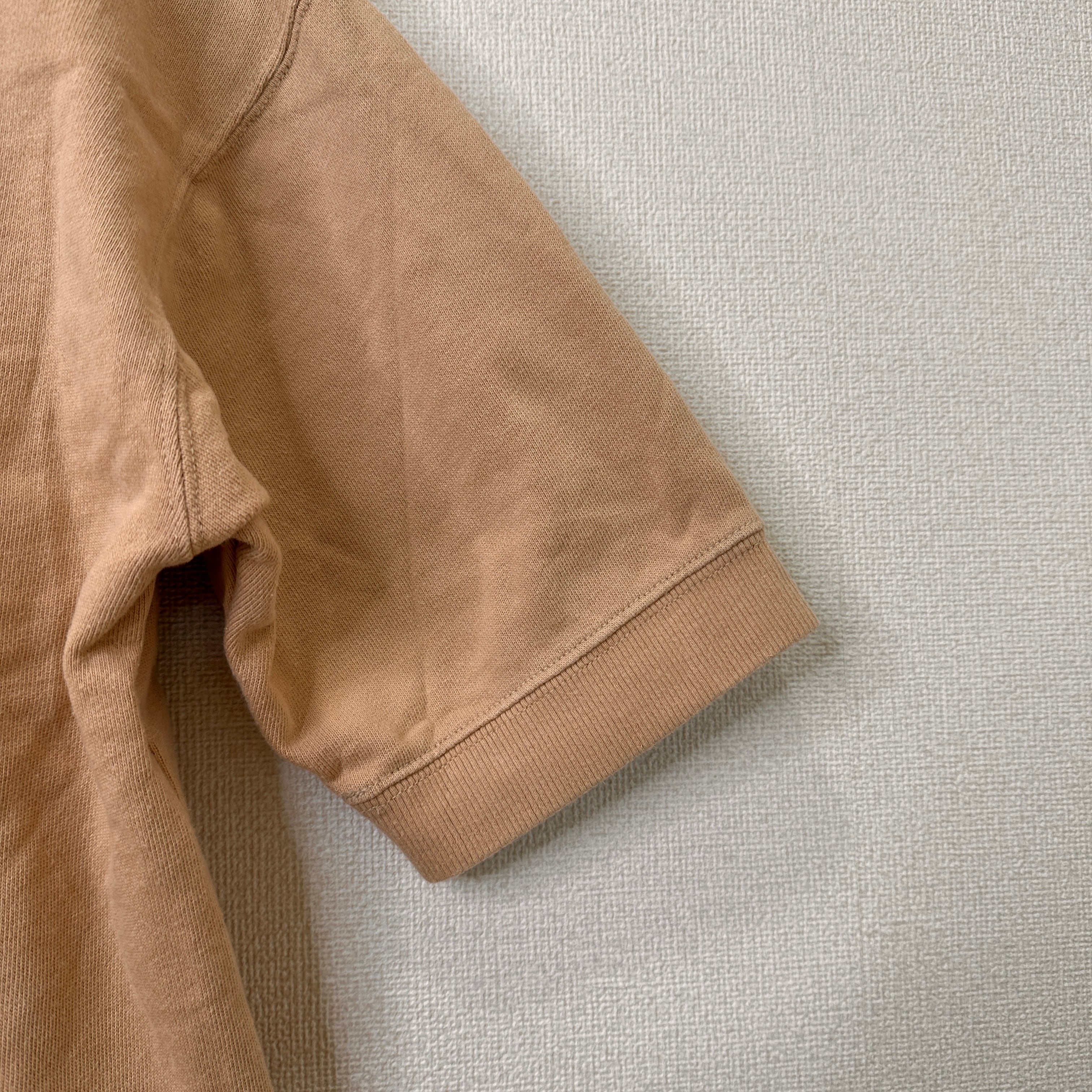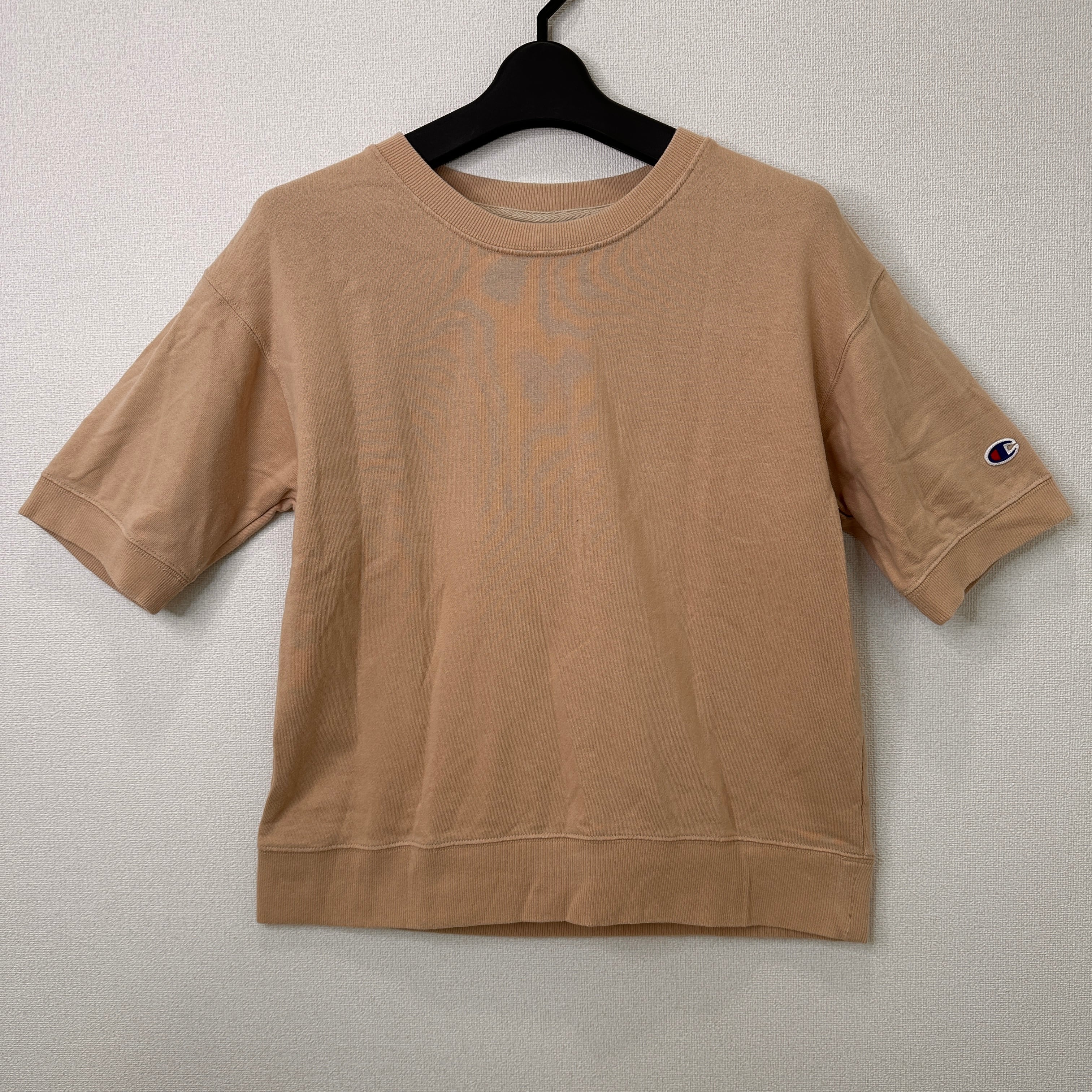 チャンピオンの半袖スウェットまたはTシャツです。しっかりとした生地感で、袖口と裾はリブ仕様になっています。カジュアルなスタイルにぴったりの一枚です。左袖にチャンピオンのロゴワッペンが付いています。色は肌なじみの良いベージュ系です。