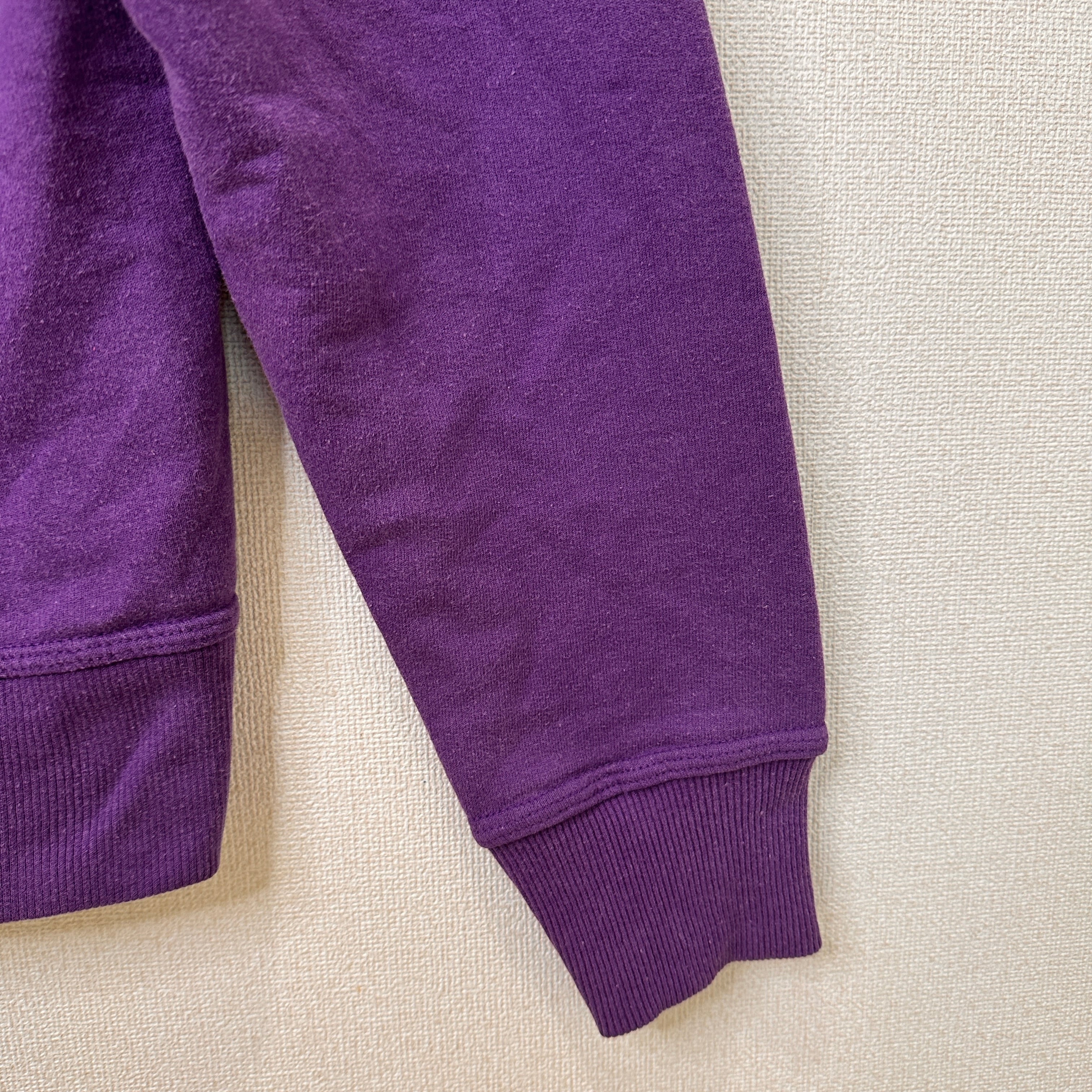 鮮やかなパープル(紫色)のボディに、左胸と左袖口に定番のCロゴのワンポイント刺繍が施されています。