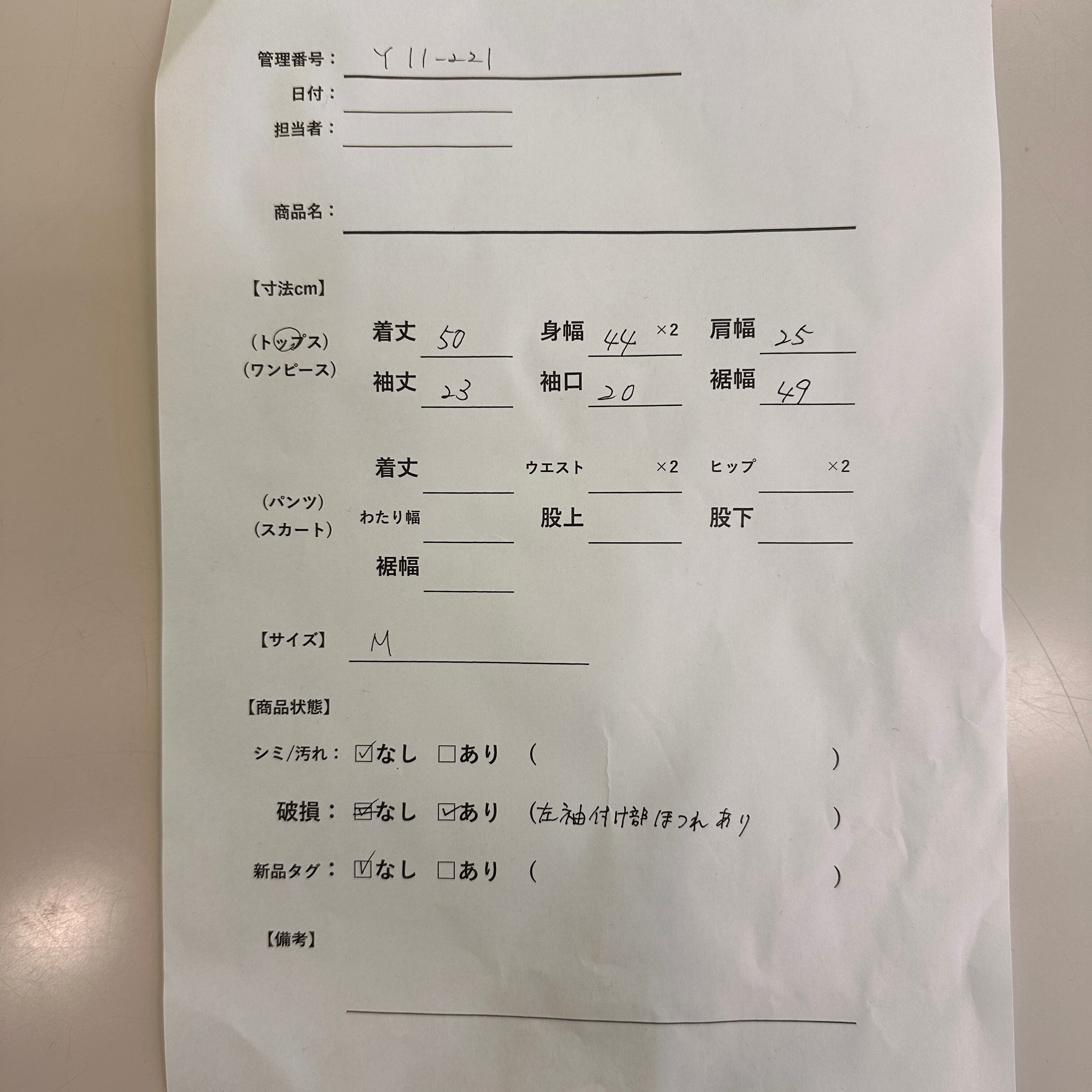 破損: あり(左袖付け部ほつれあり)