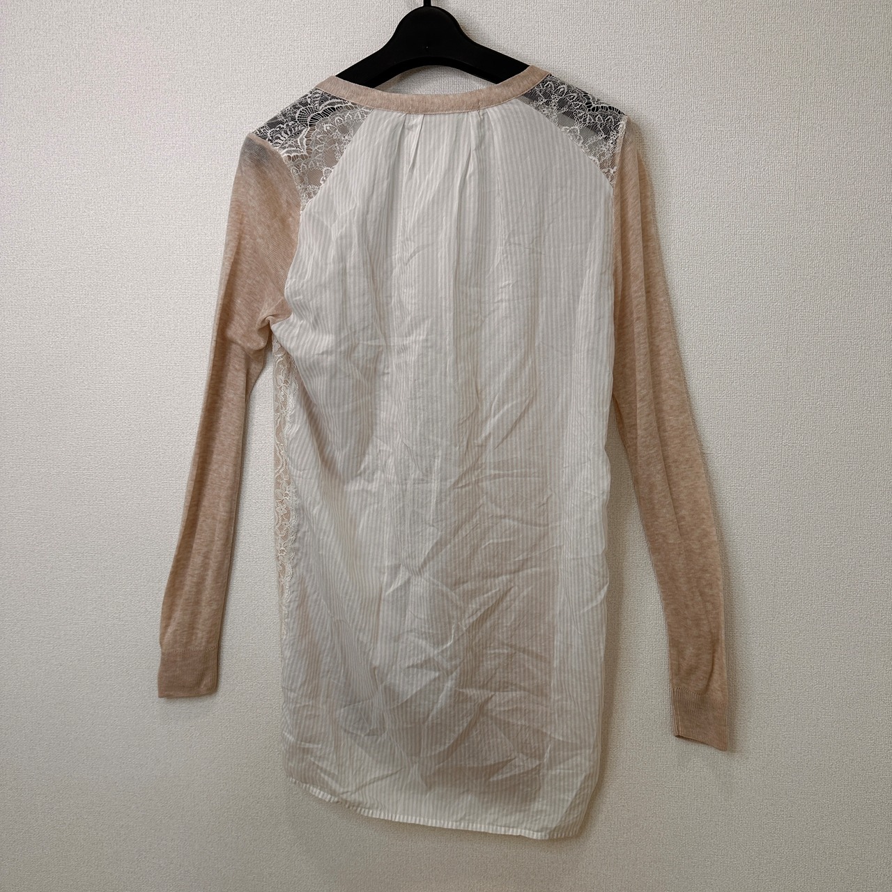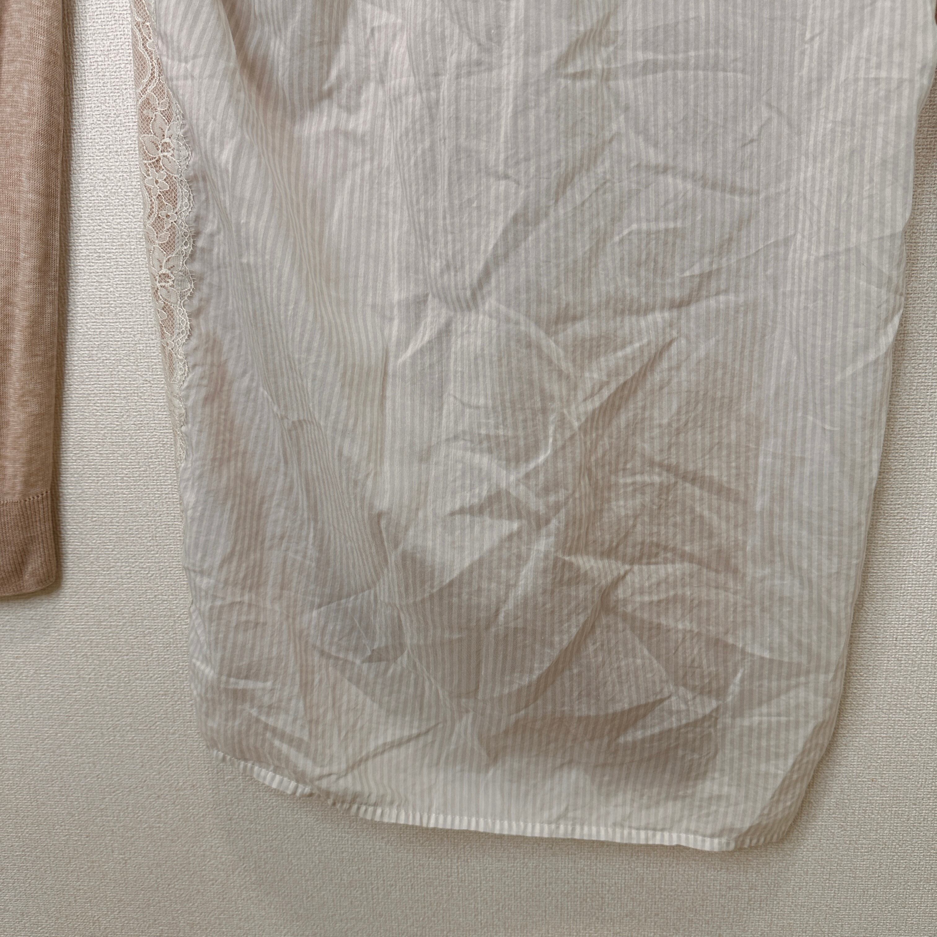 サイドと肩に繊細な白のレースと異素材(ストライプの布帛)が切り替えられた、
