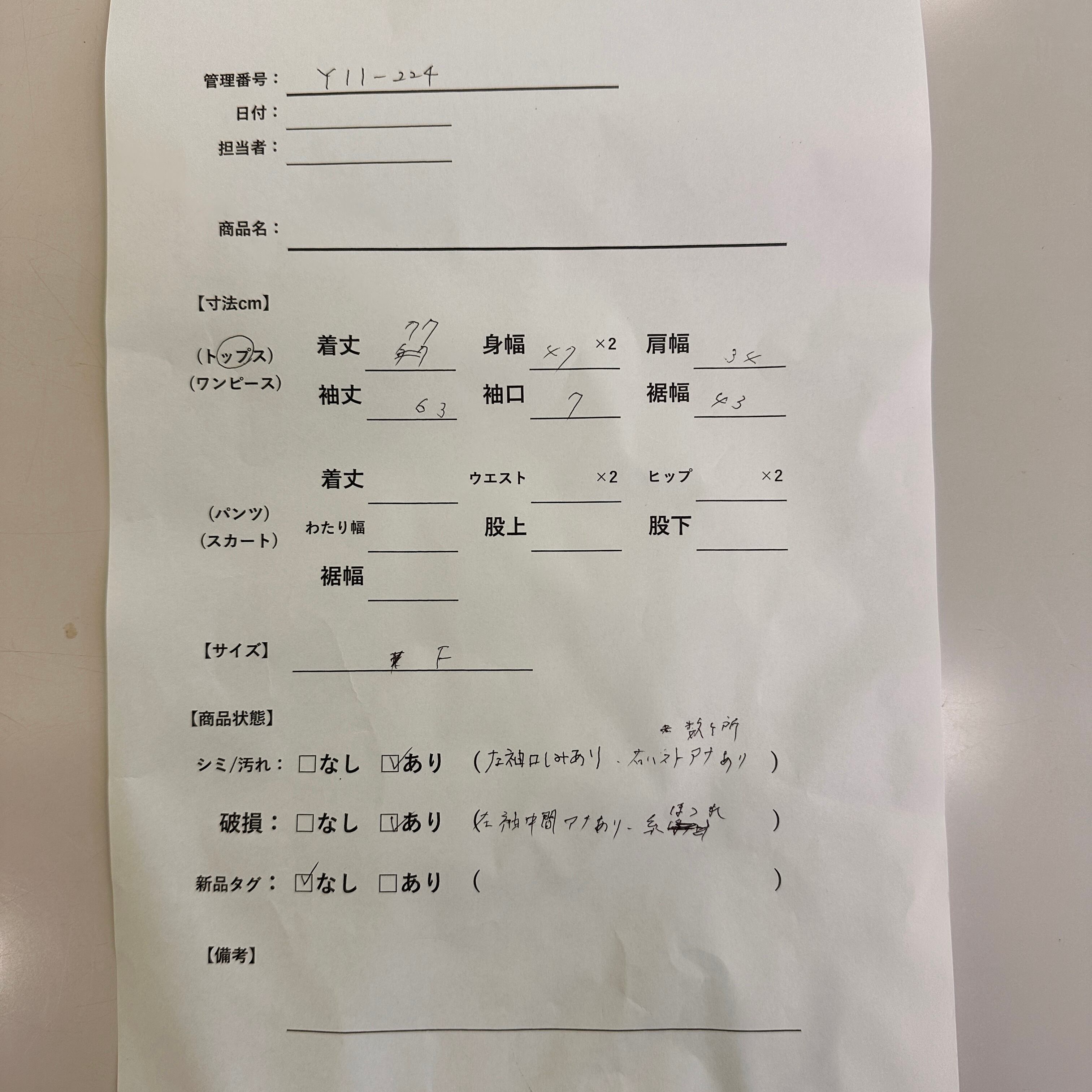 シミ/汚れ: あり (左袖口にシミあり、右バスト数か所穴あり)