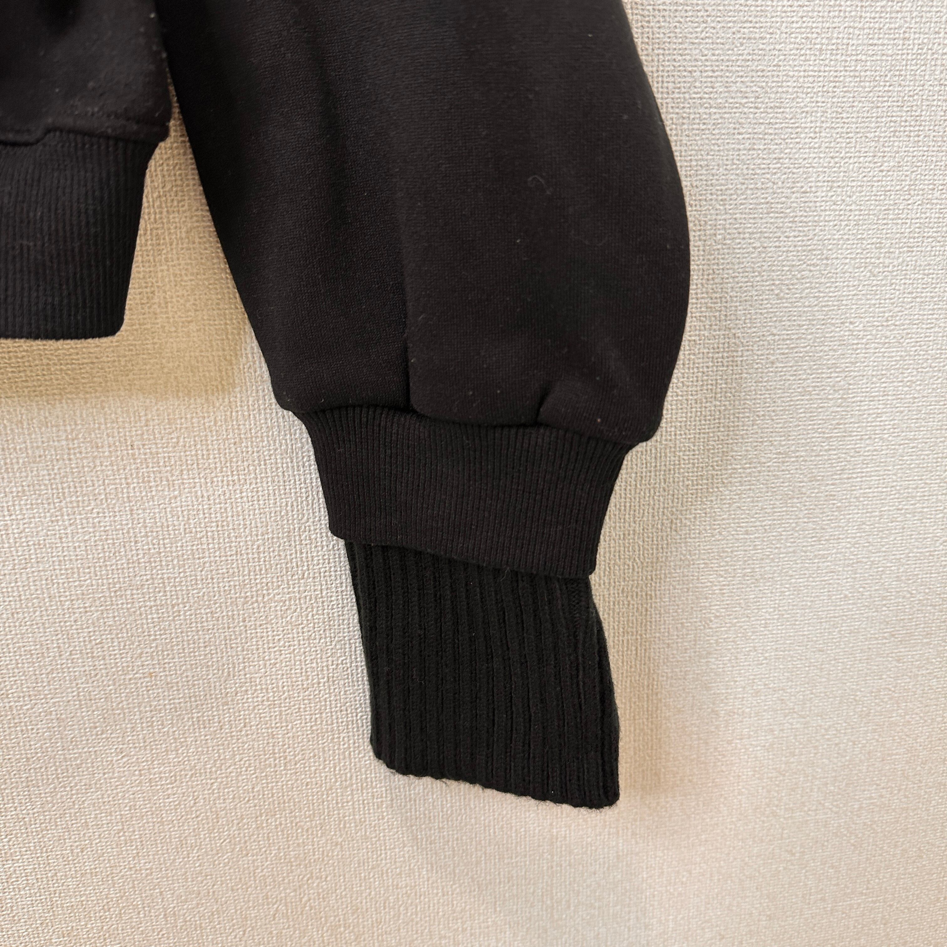 タートルネックのリブニットとクルーネックのスウェットがドッキングされたようなデザインの黒いプルオーバーです。