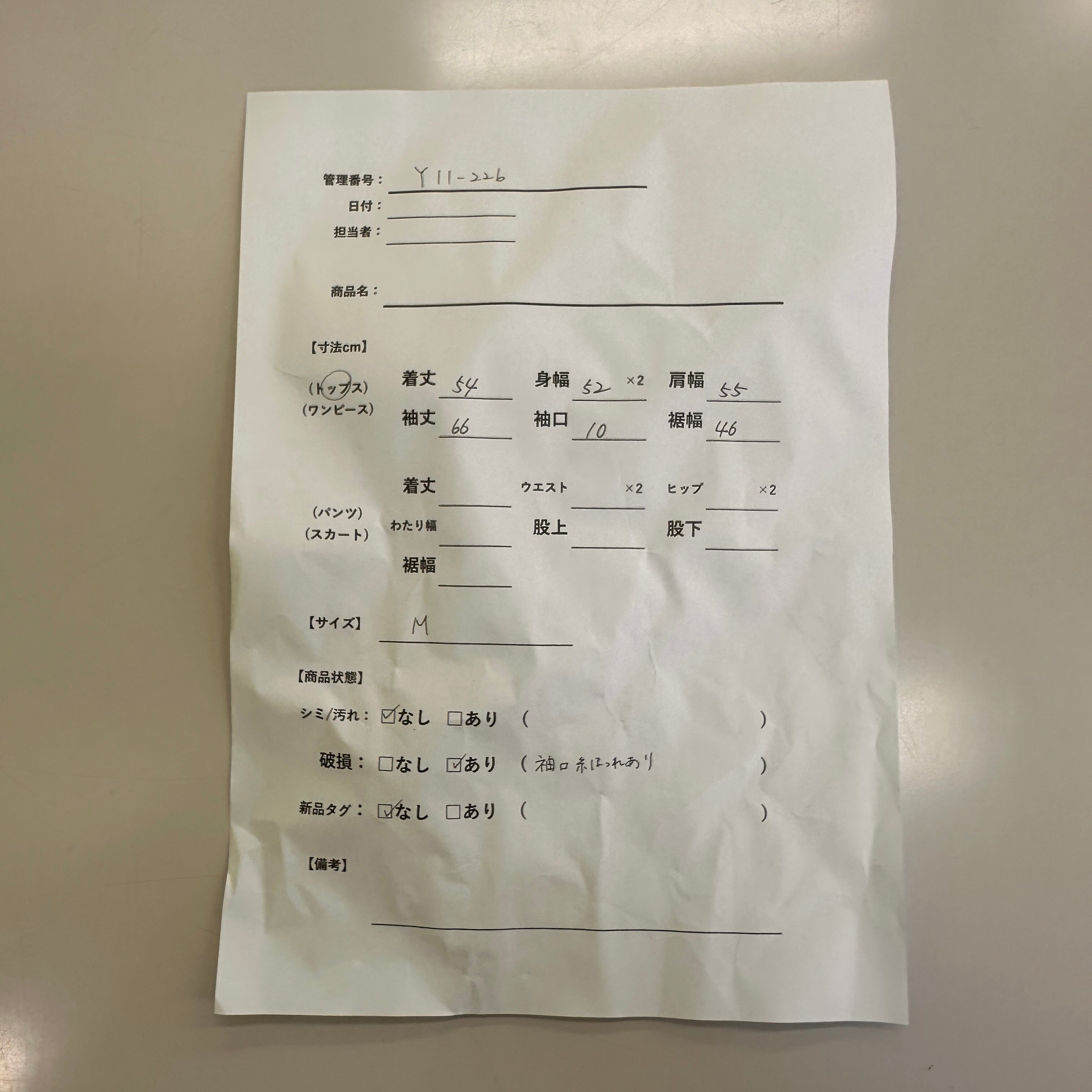破損: あり(袖口に糸ほつれあり)