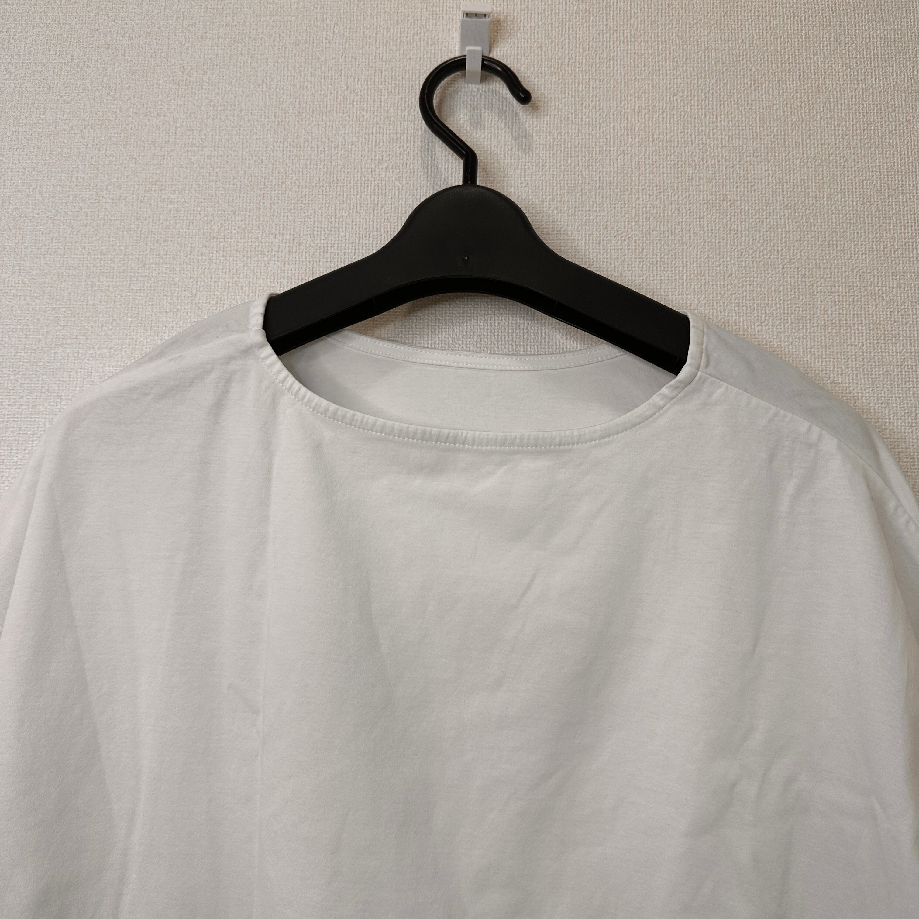 綿100%で肌触りが良く、ドロップショルダーとゆったりとした身幅でリラックス感のある着心地です。