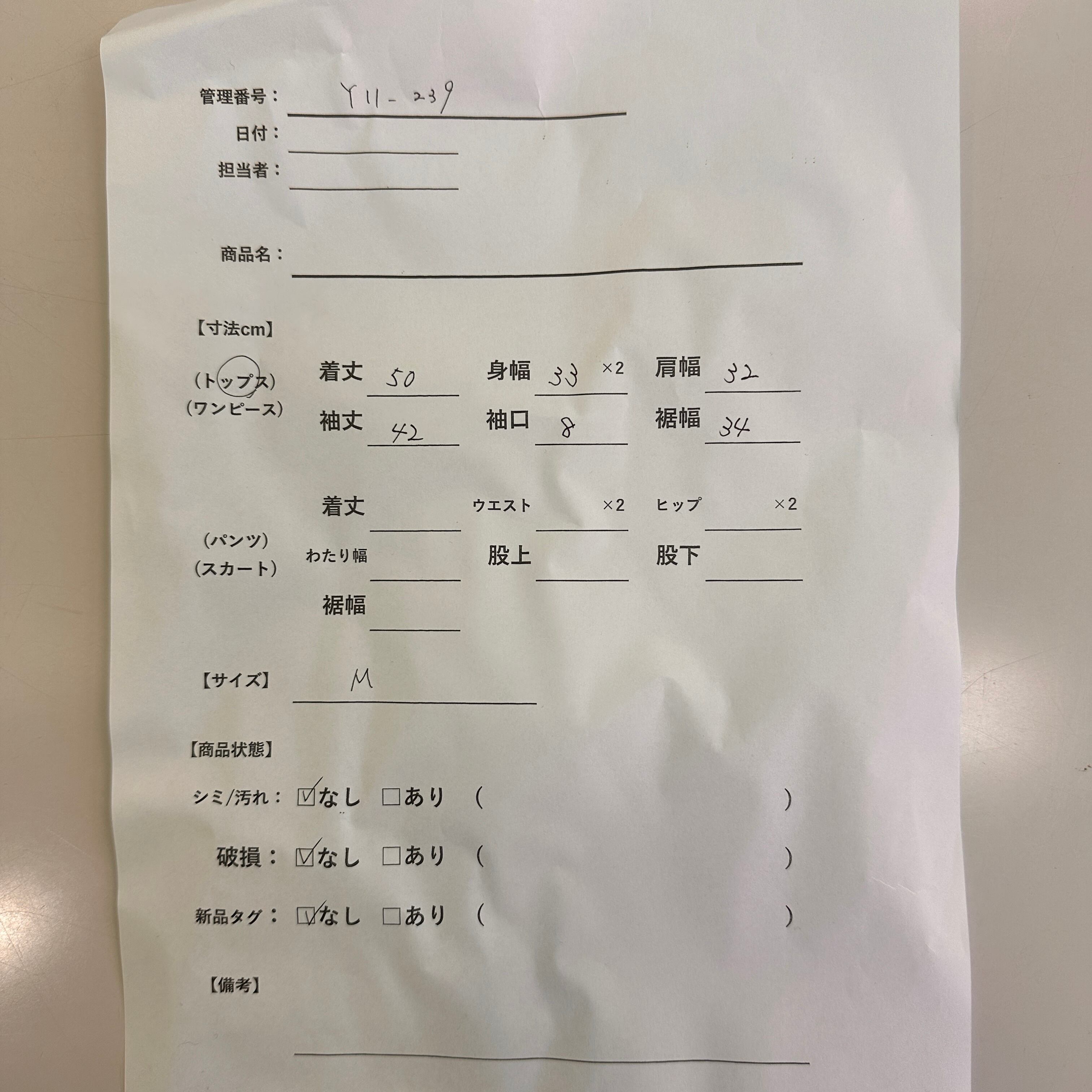シミ/汚れ: なし