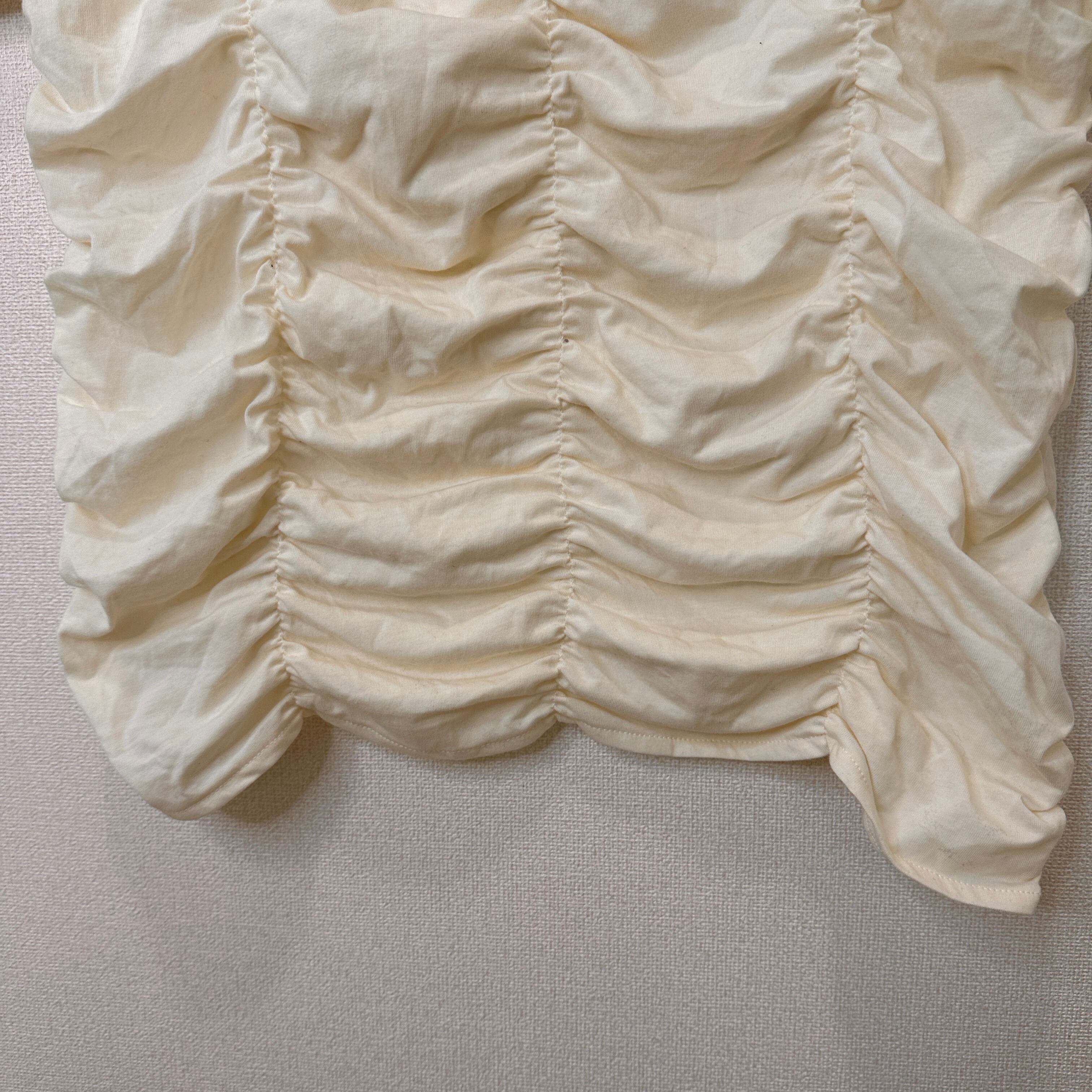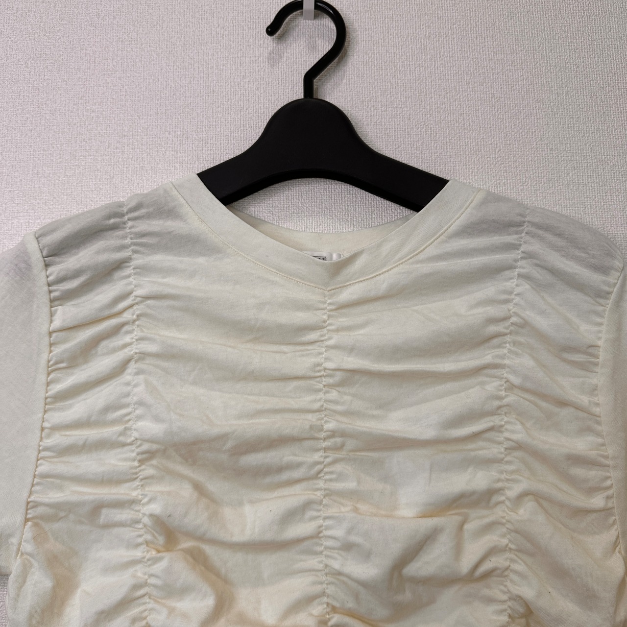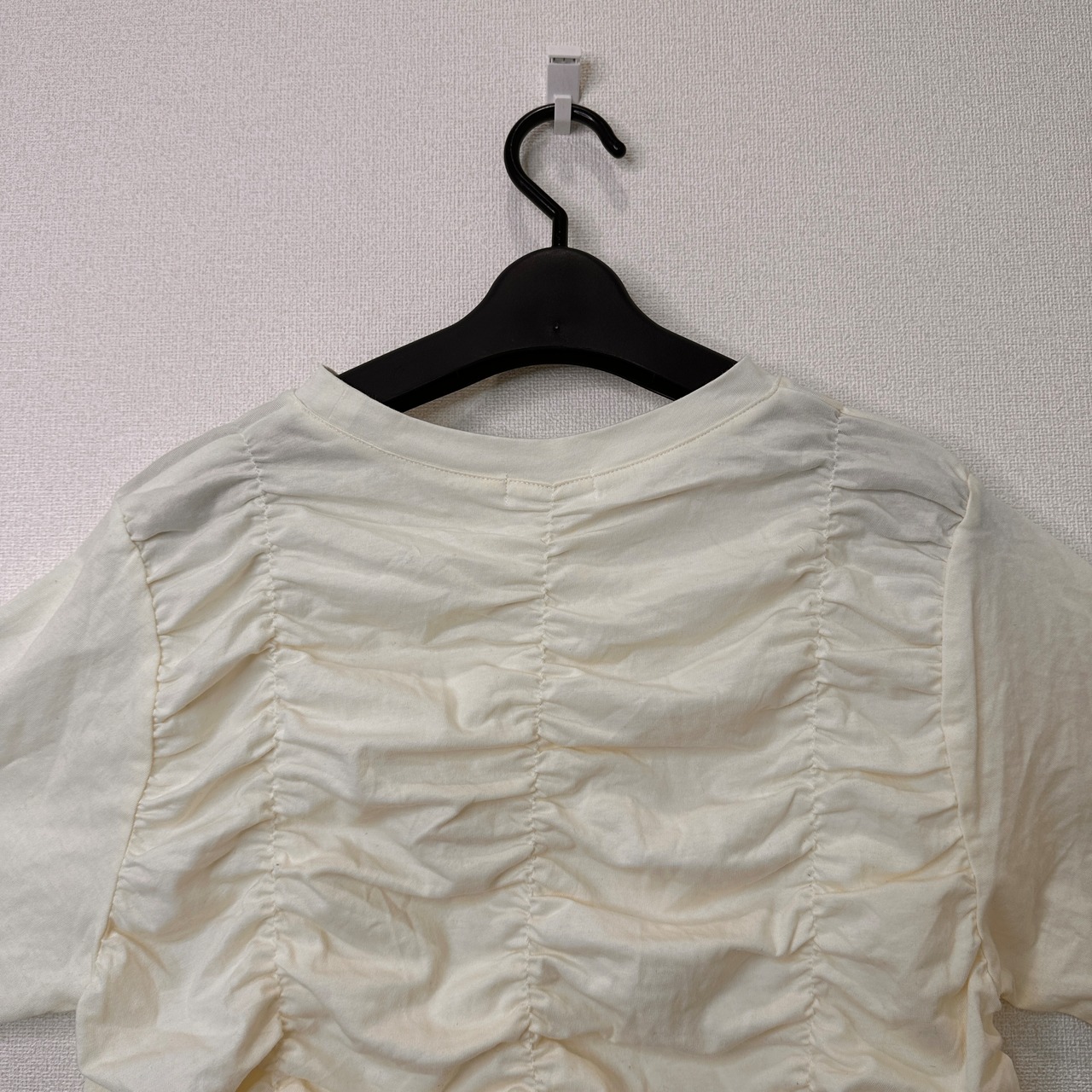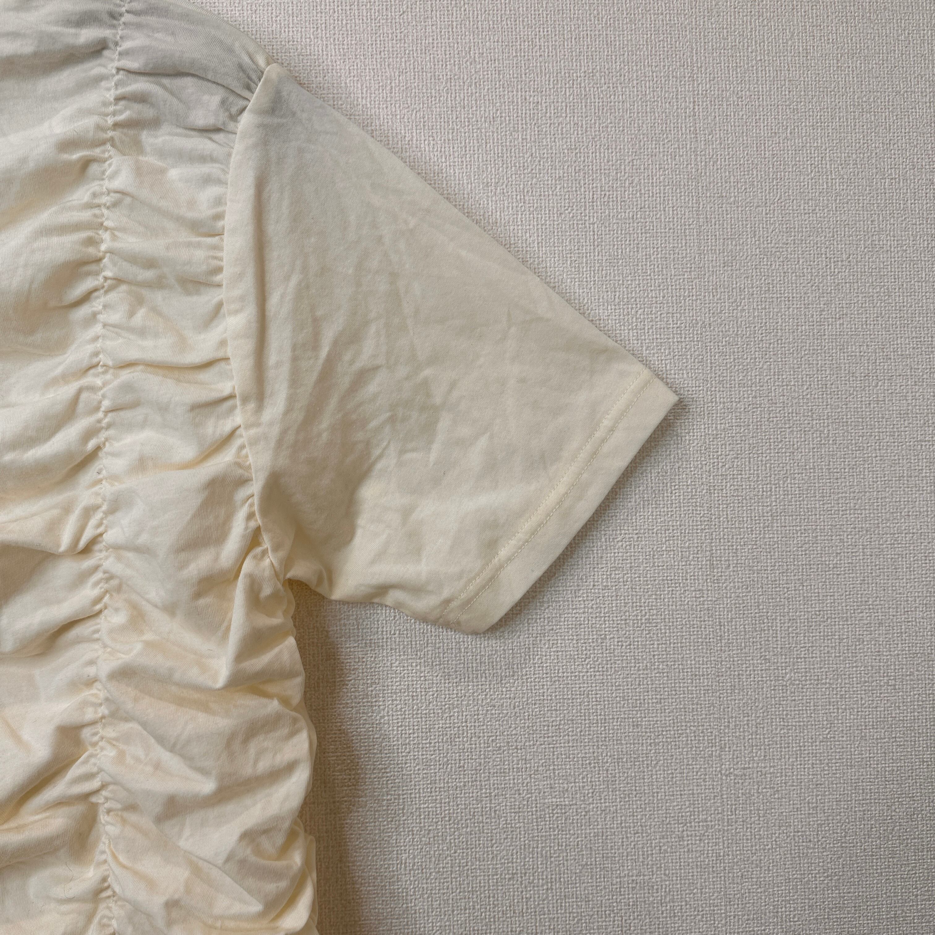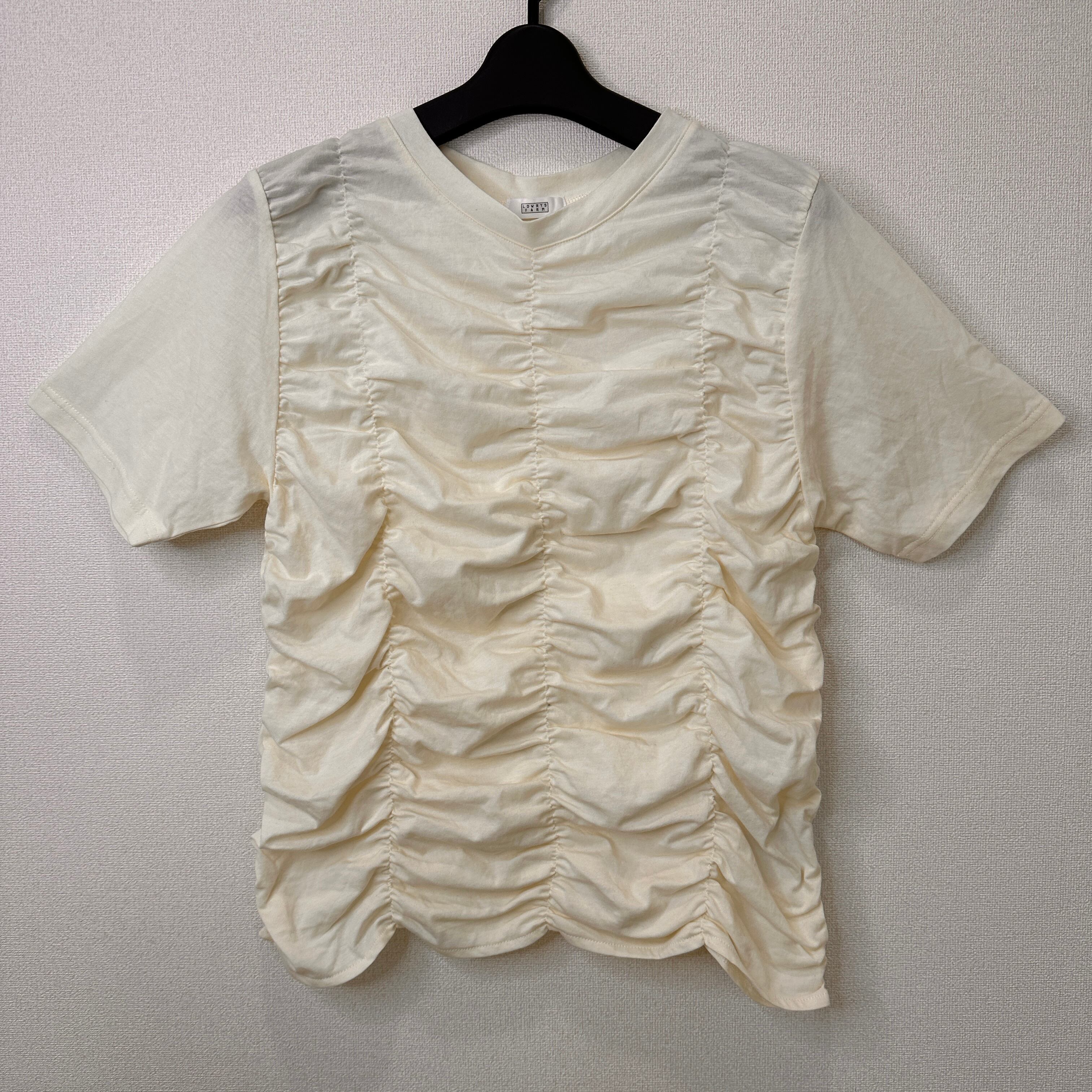 前面全体にシャーリング(ギャザー)加工が施された、デザイン性の高い半袖Tシャツです。