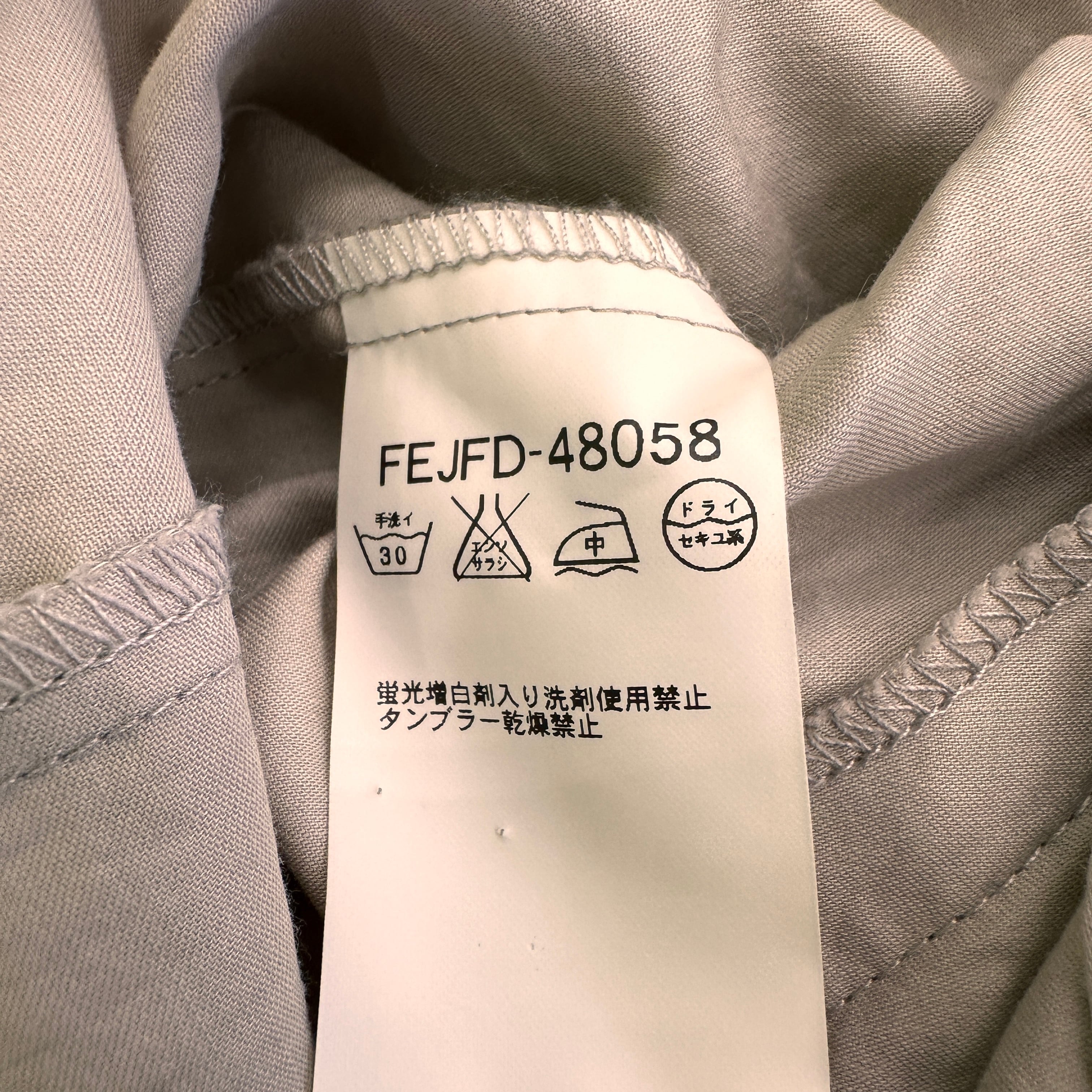 ノーカラー(襟なし)で、肩のエポーレット風の飾りや、フラップポケットの金ボタンがアクセントになっています。