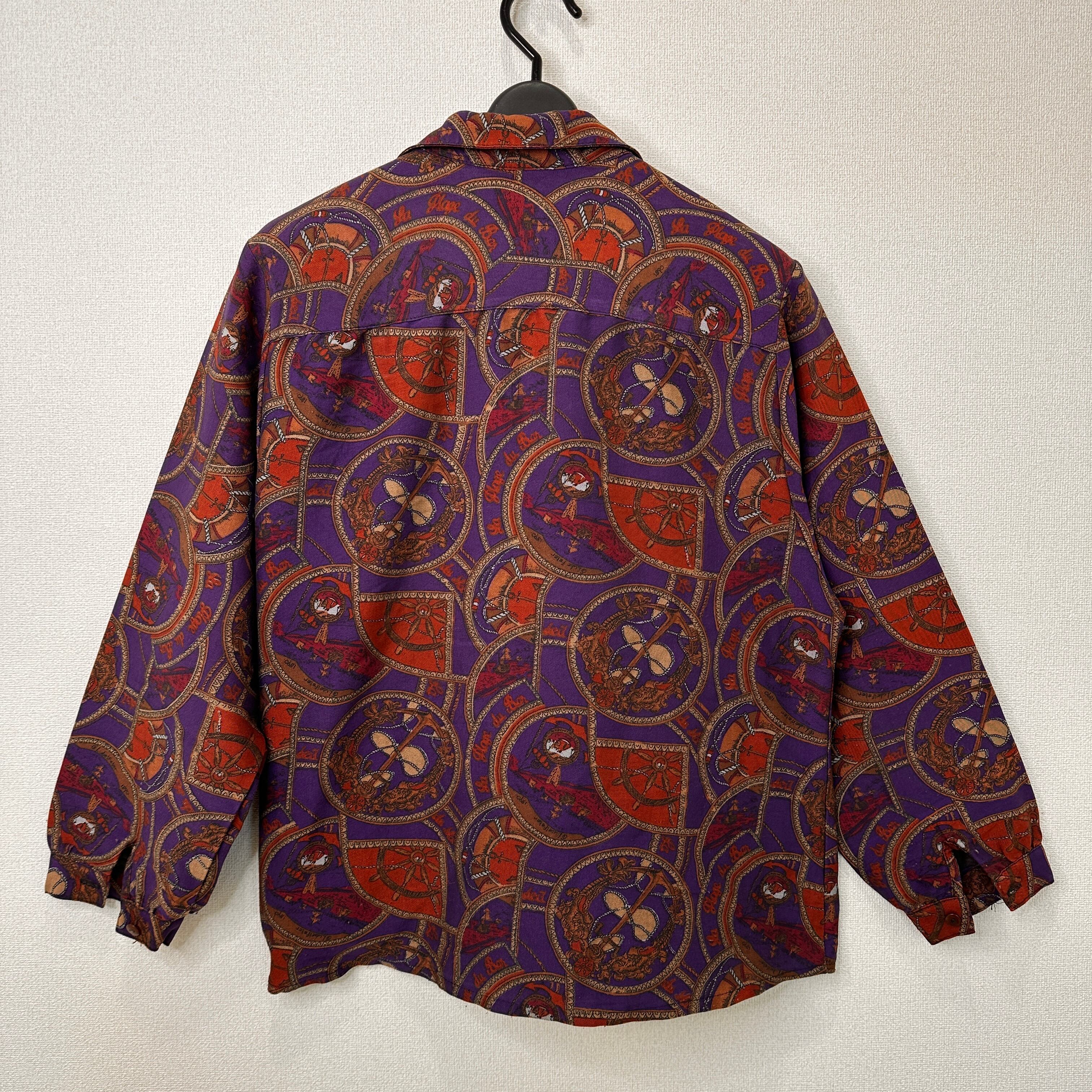 パープルとオレンジを基調とした、レトロで個性的な総柄デザインの長袖シャツです。