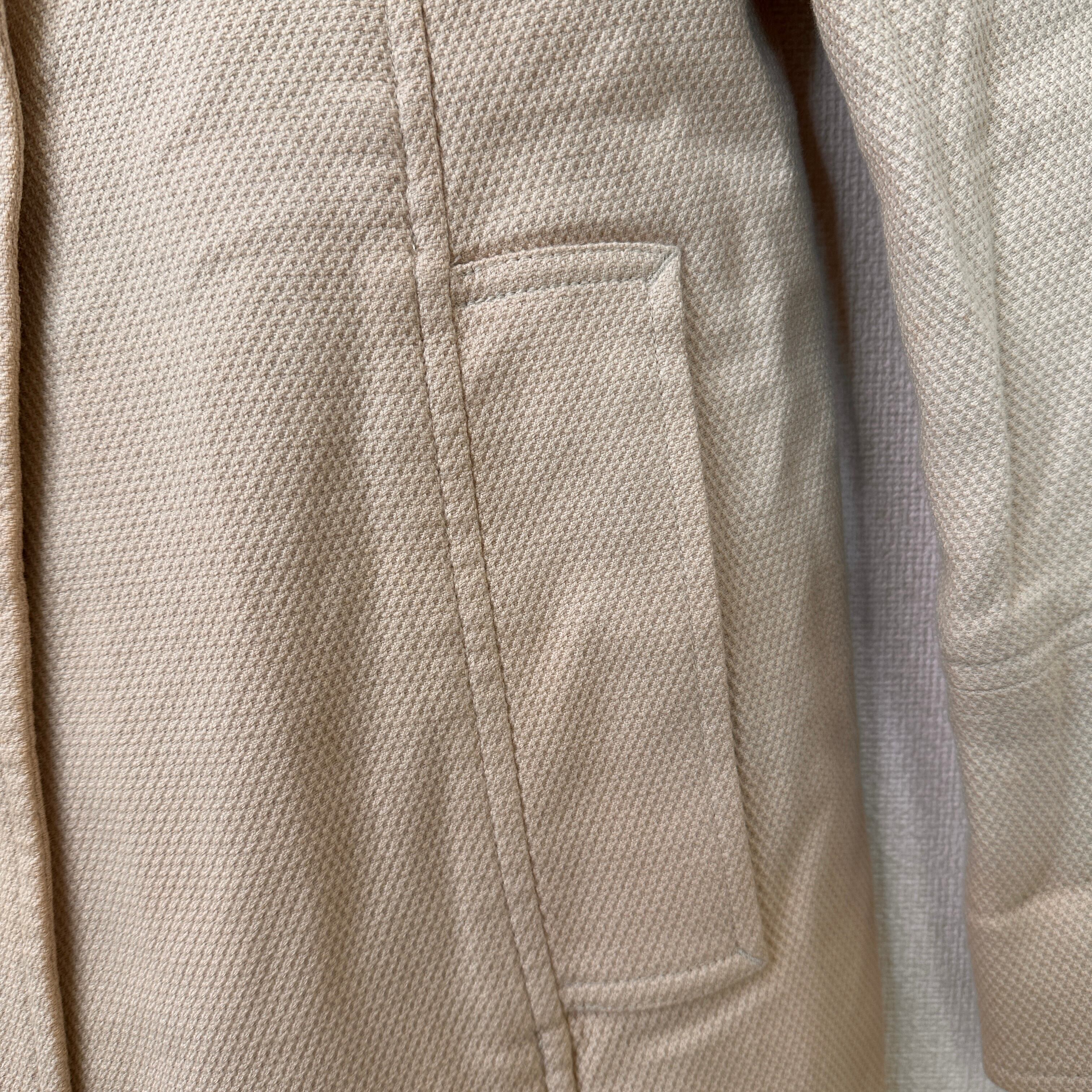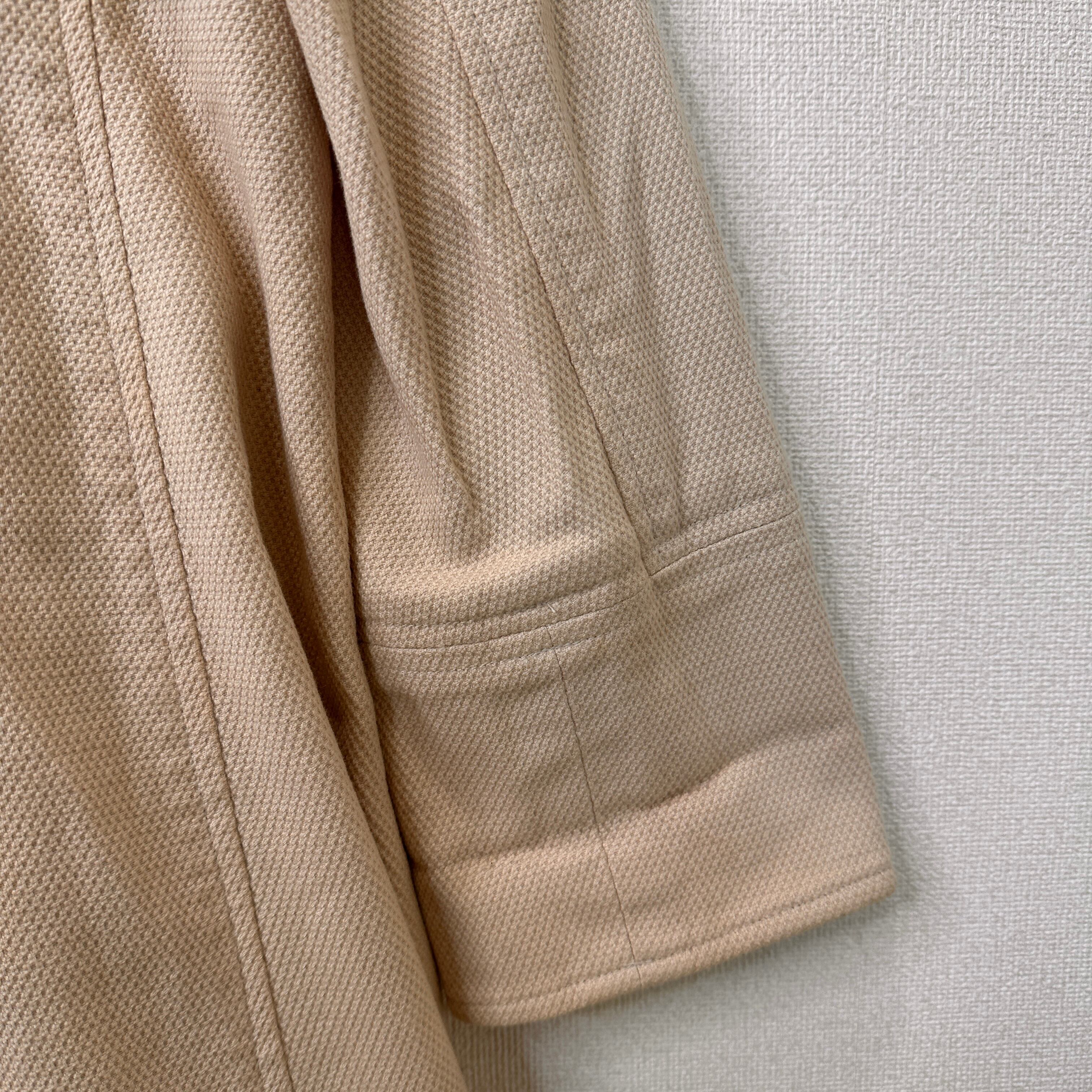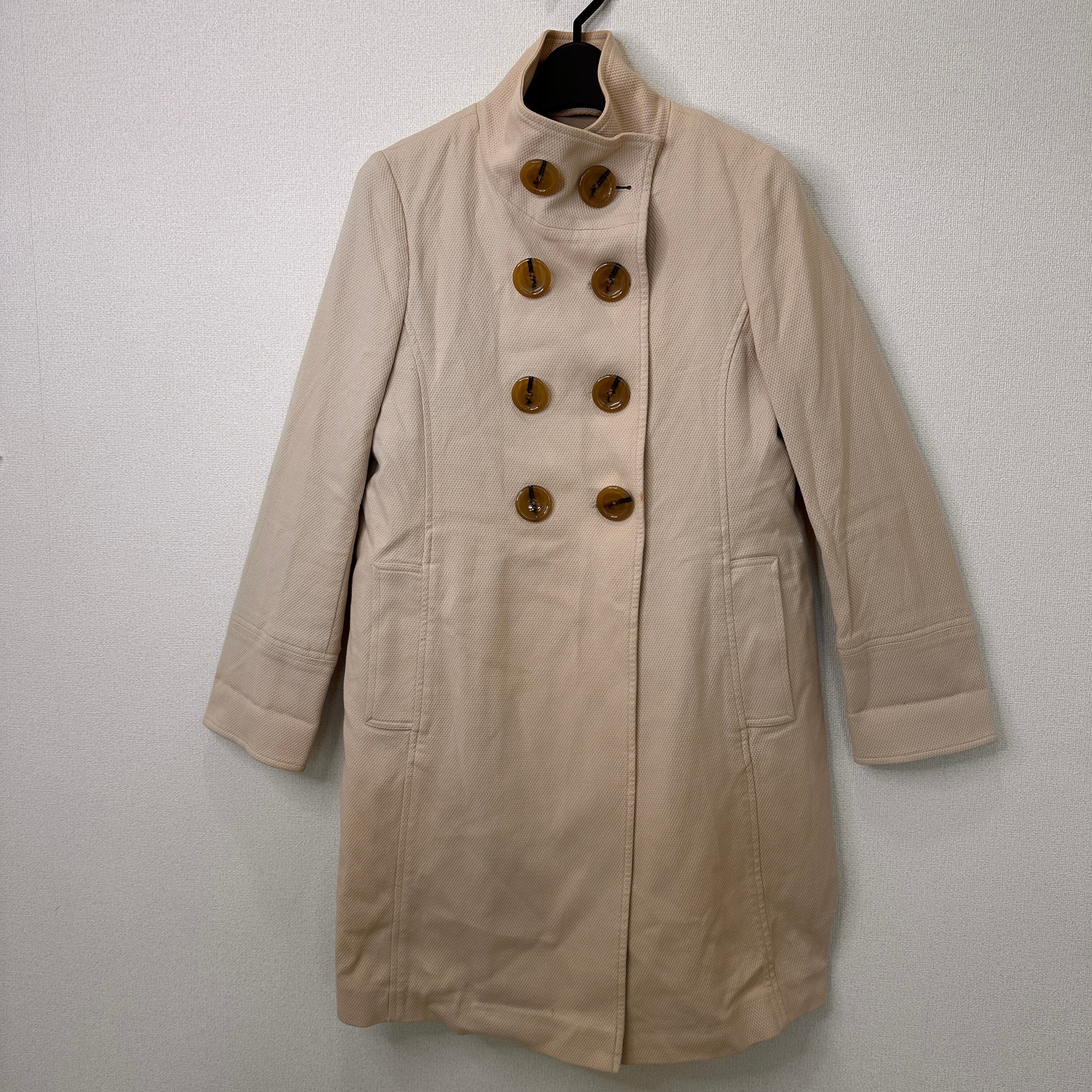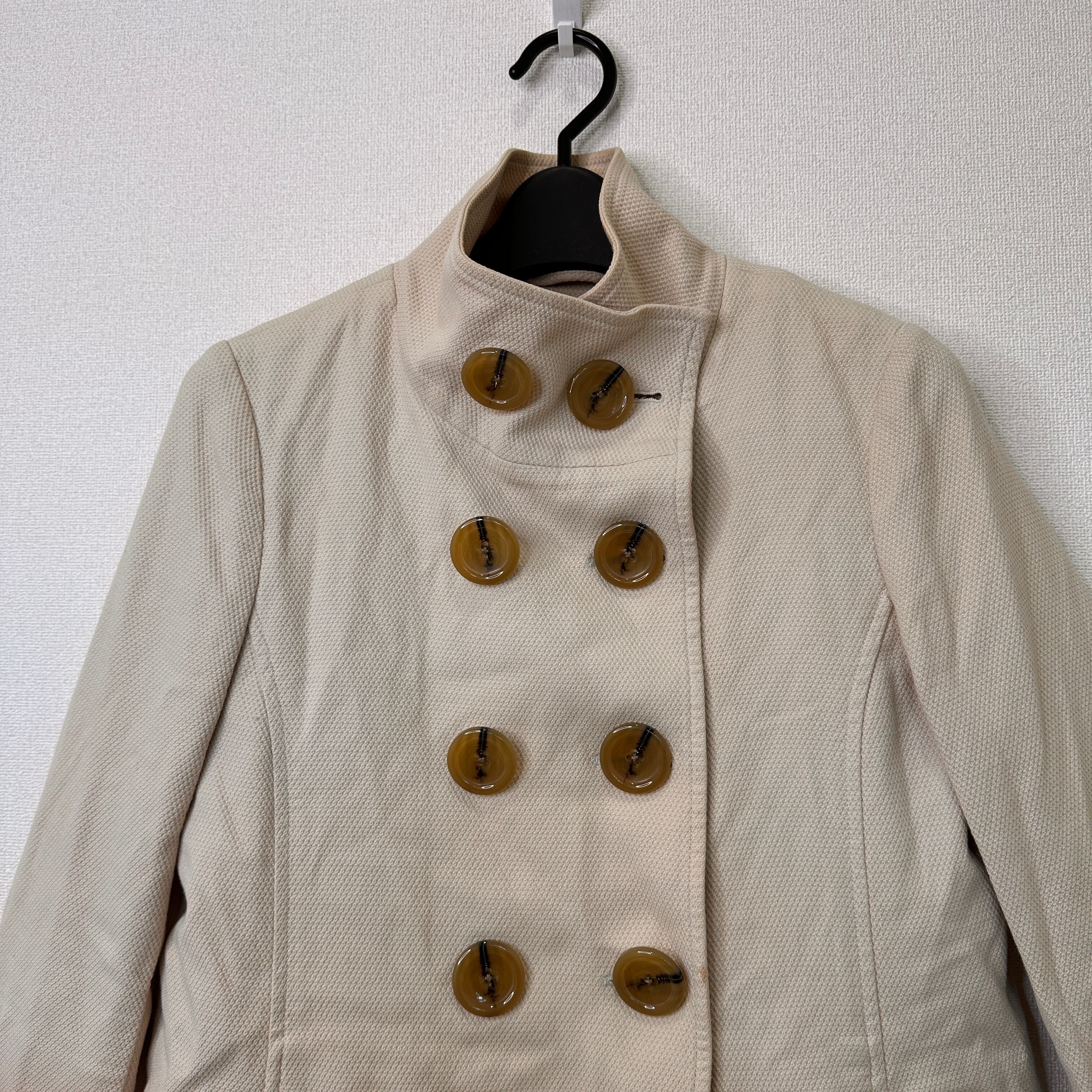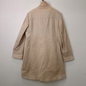 落ち着いたベージュ/キャメル系の色味と、大きなブラウンのボタンが特徴的で、カジュアルからきれいめまで幅広いスタイルに合わせやすいデザインです。
