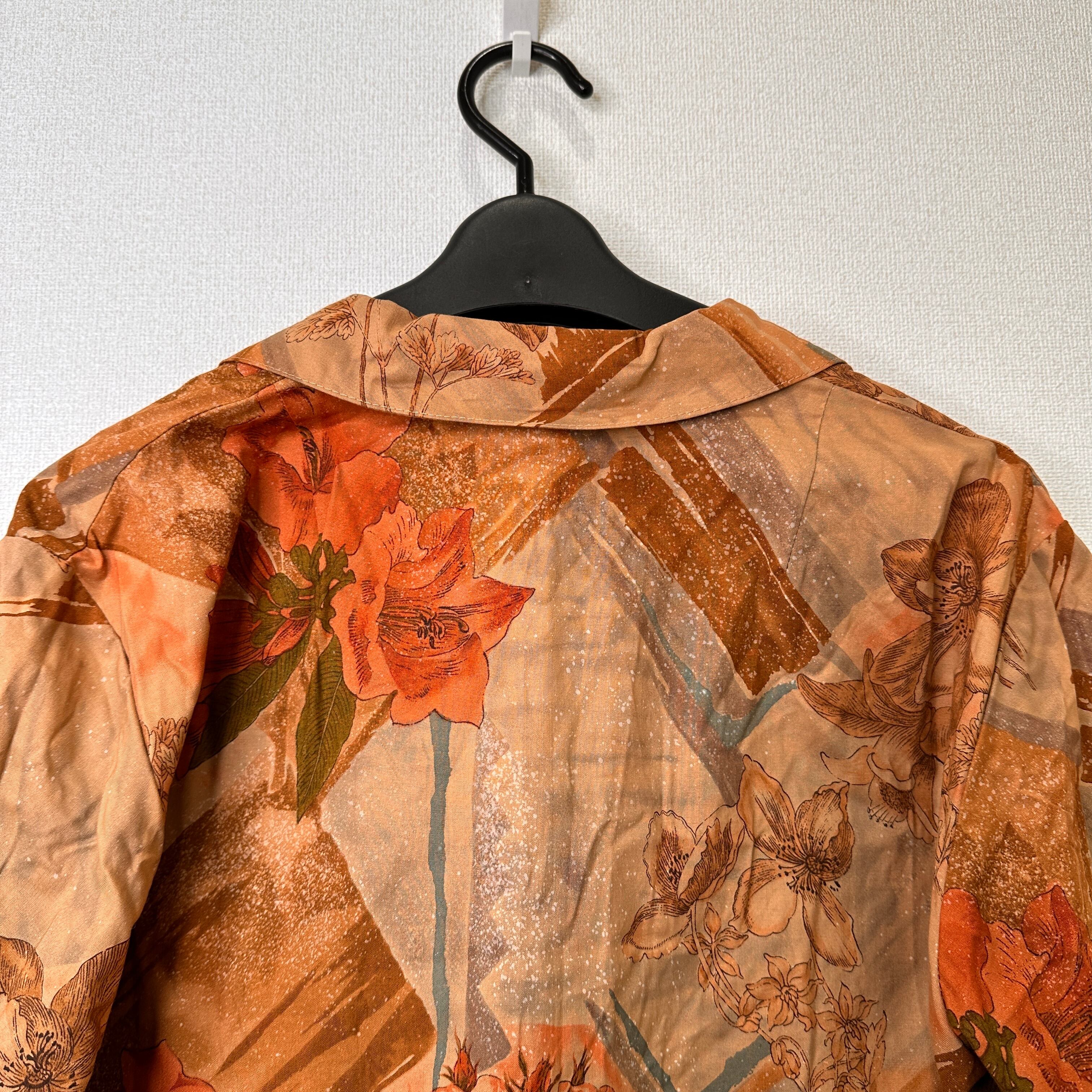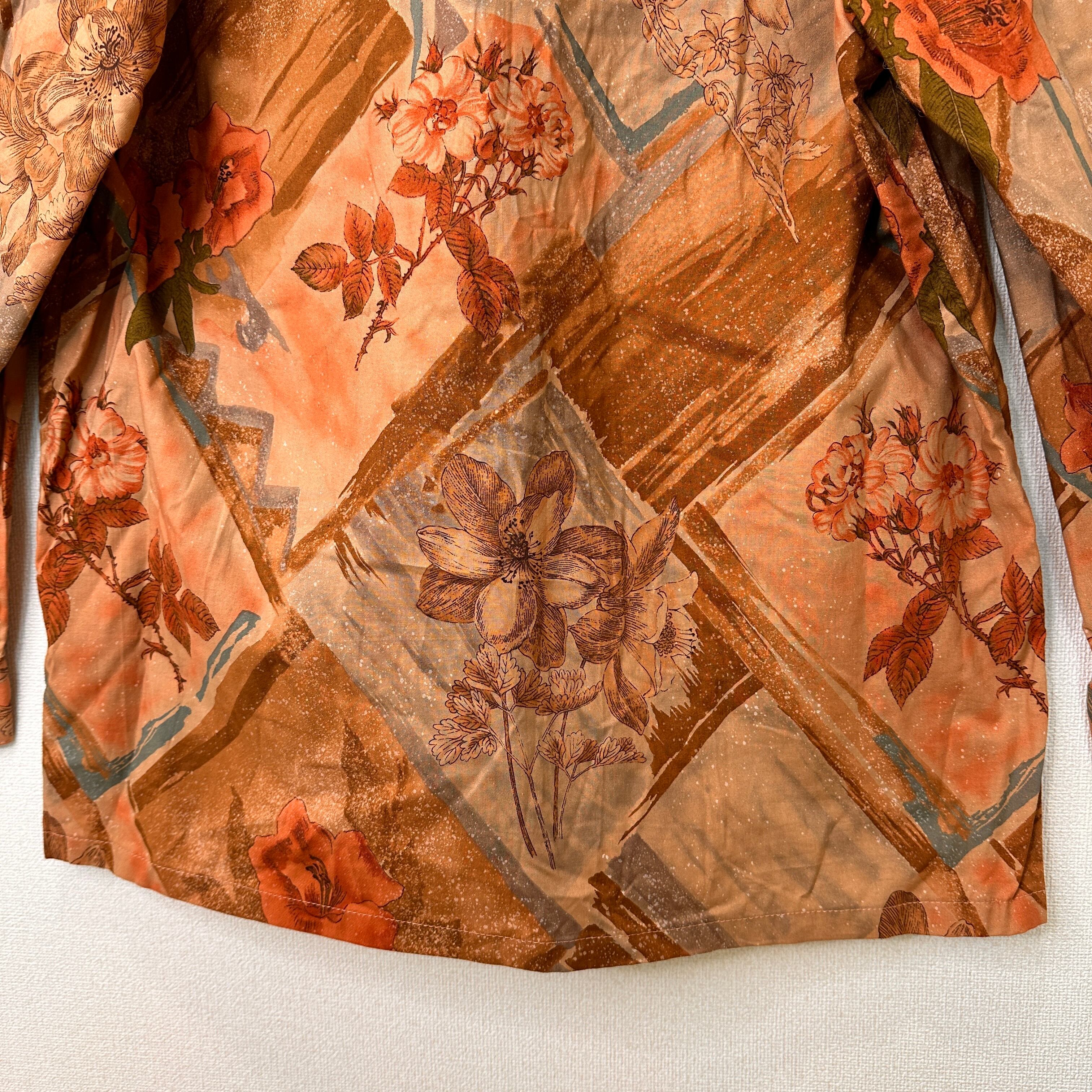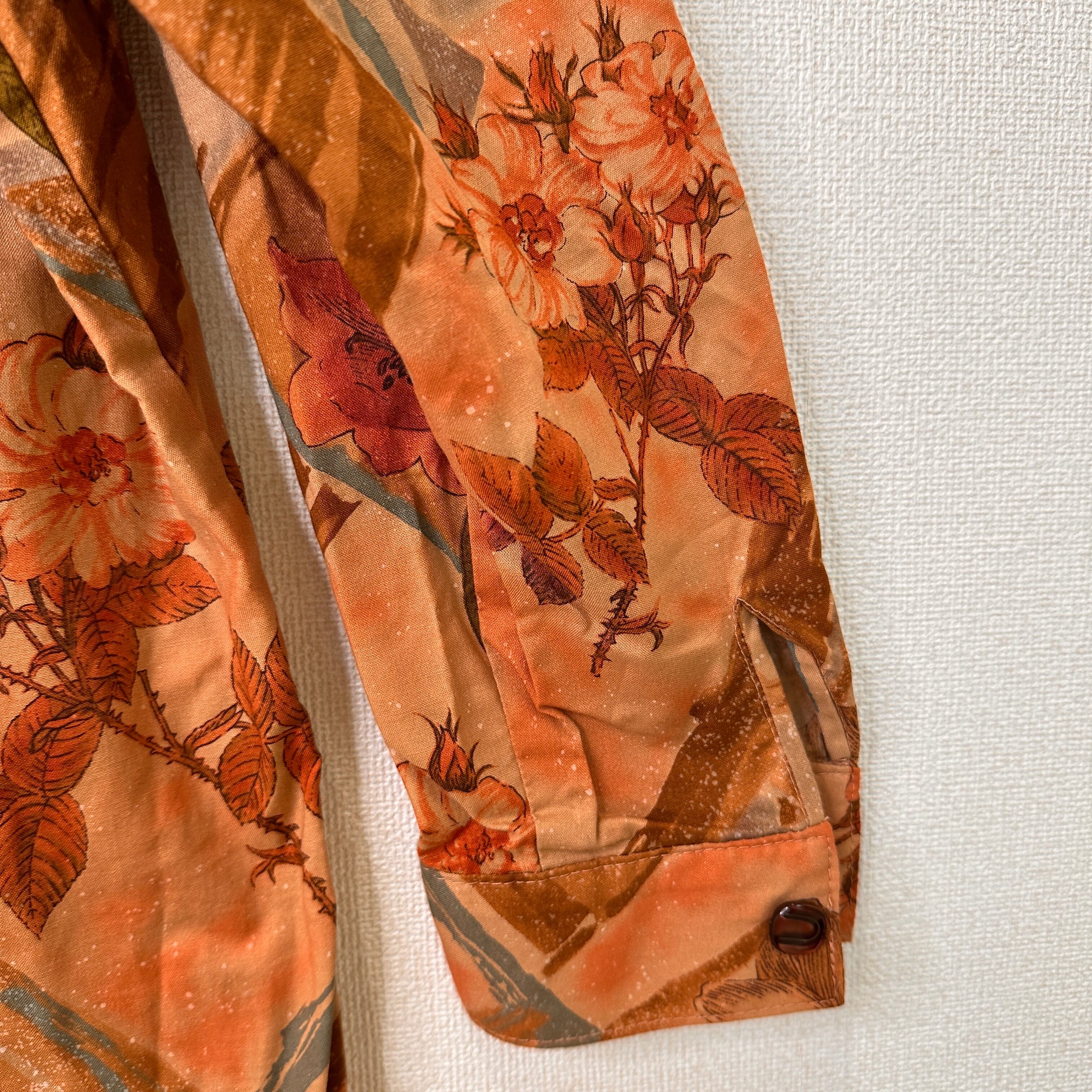 レトロ総柄 花柄 幾何学模様 長袖シャツ ブラウス ヴィンテージ風 オレンジ系 サイズ : M