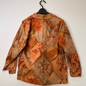 オレンジやブラウン系を基調としたレトロな総柄の長袖シャツ(ブラウス)です。