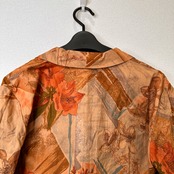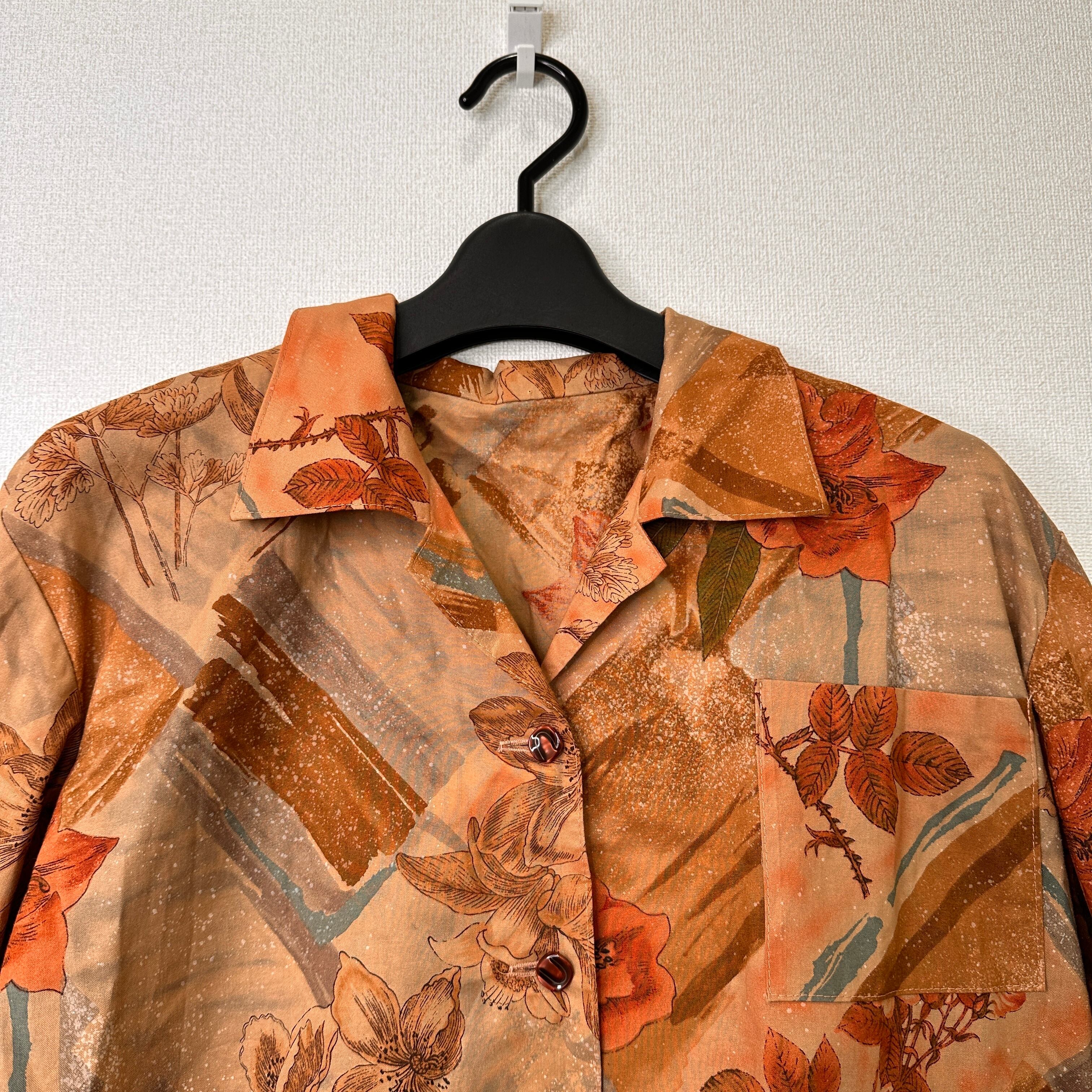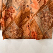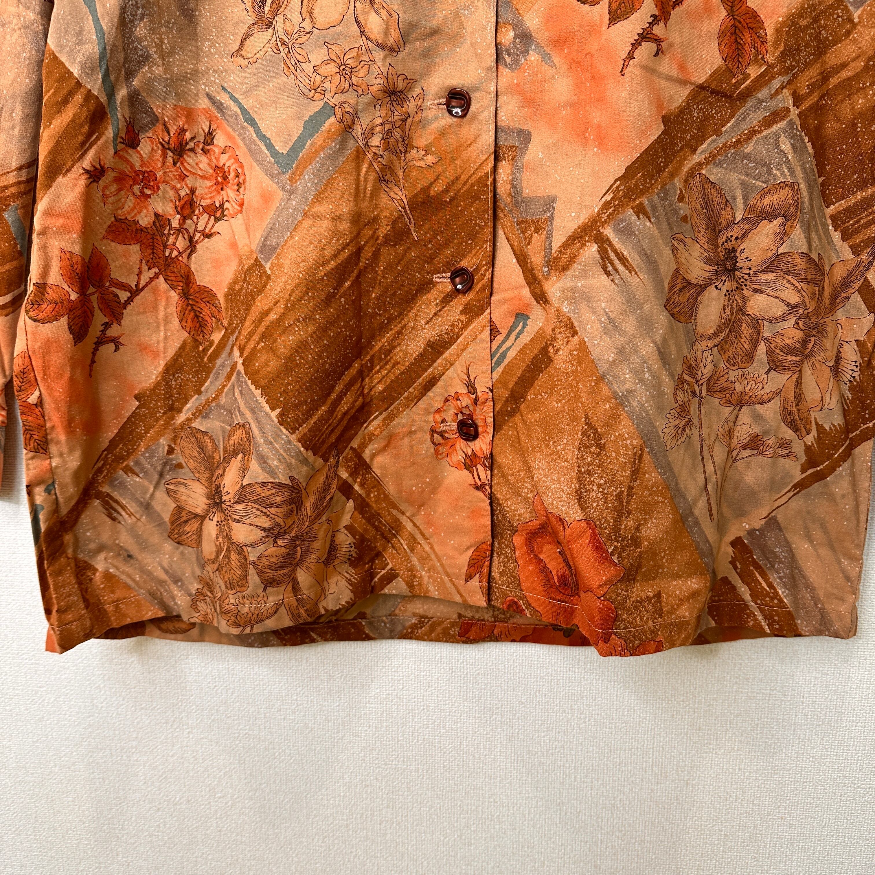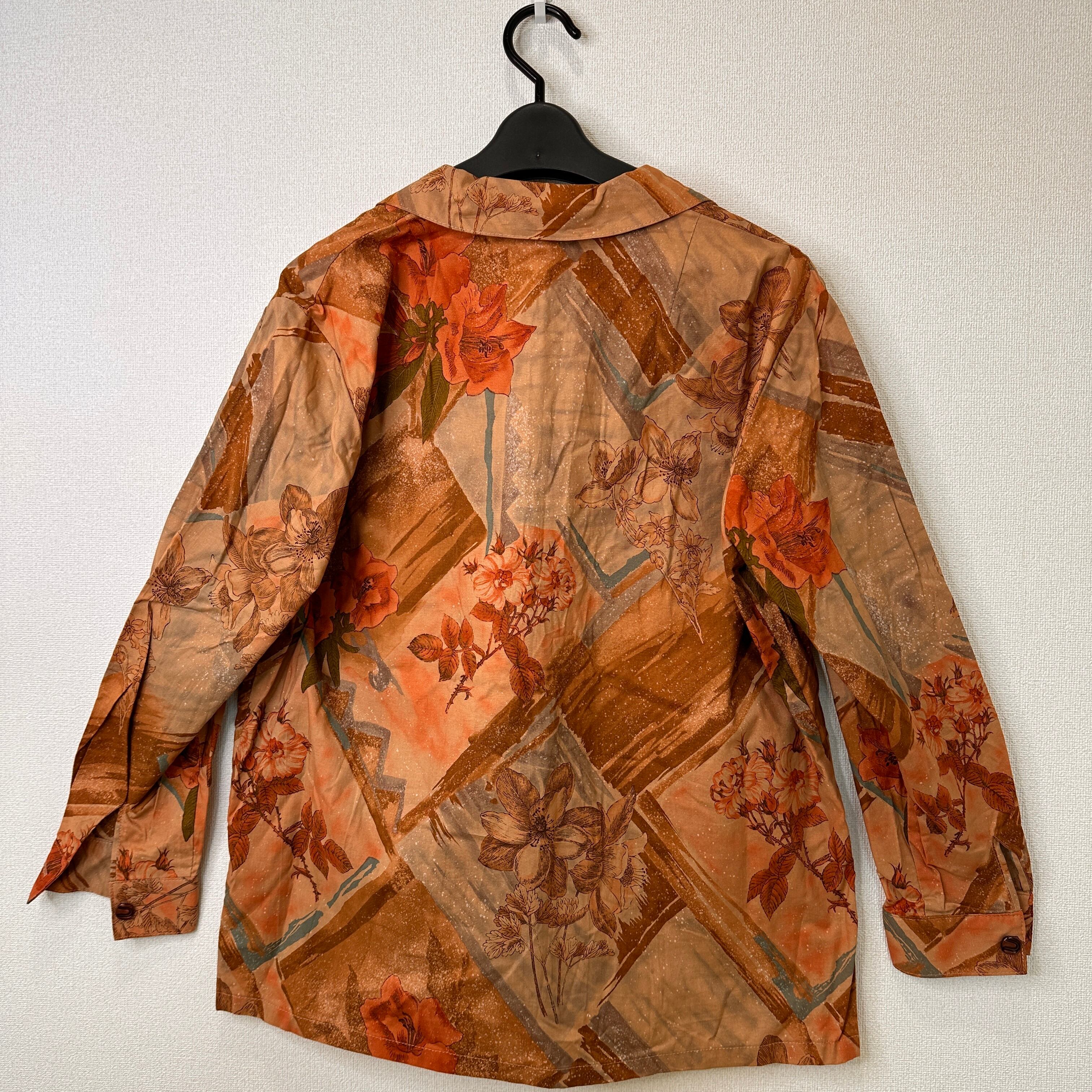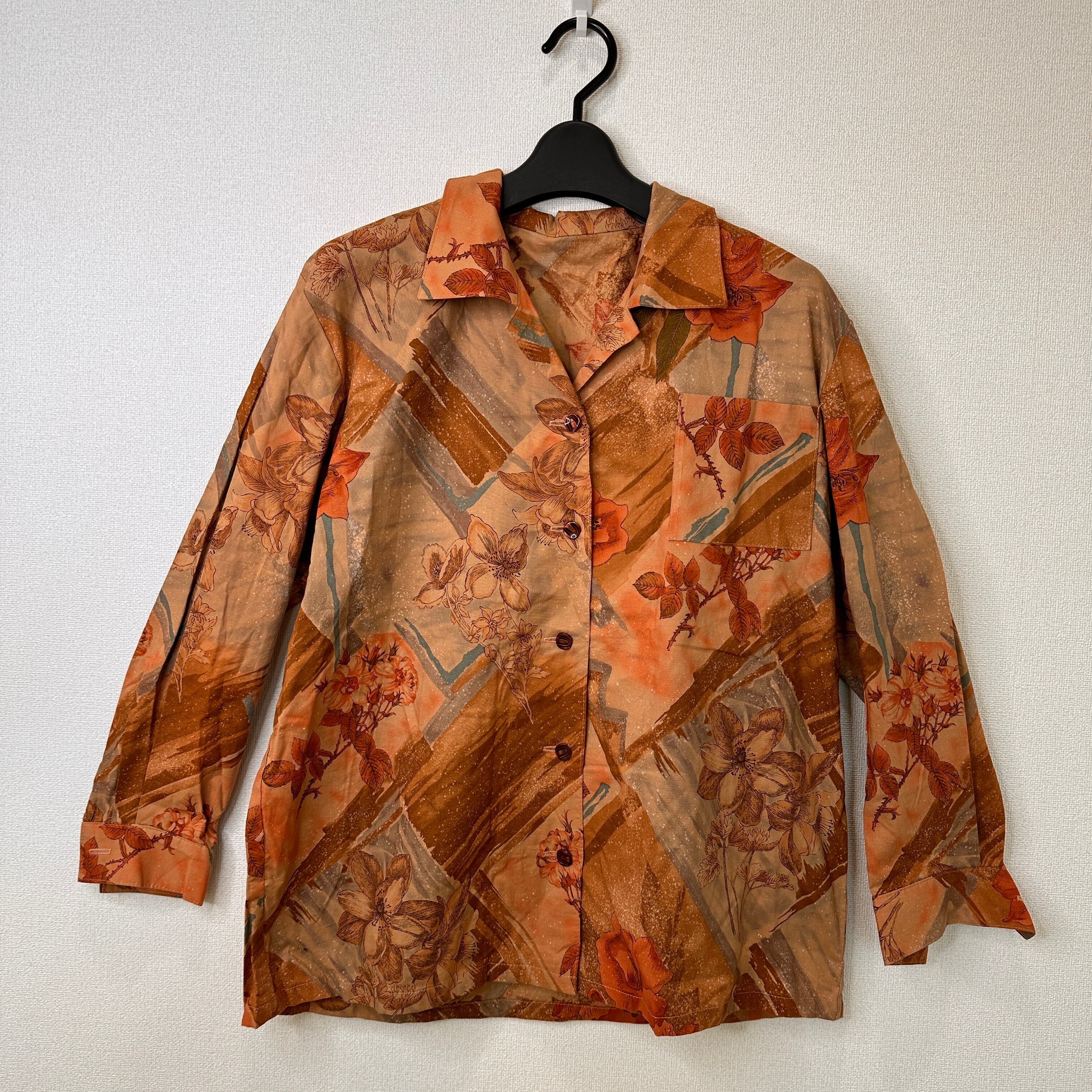 レトロ 総柄 長袖シャツ ブラウス 花柄 幾何学模様 オレンジ/ブラウン系