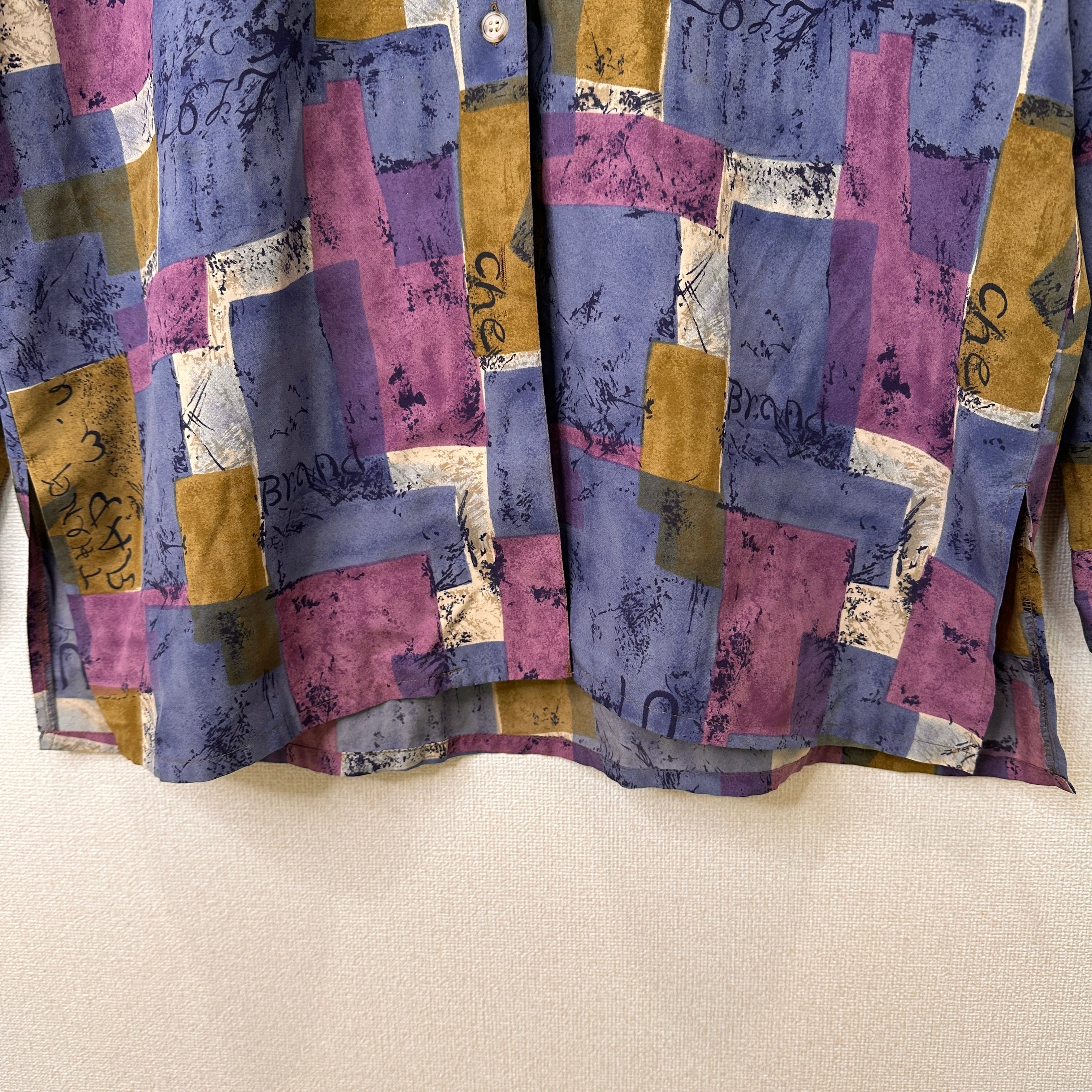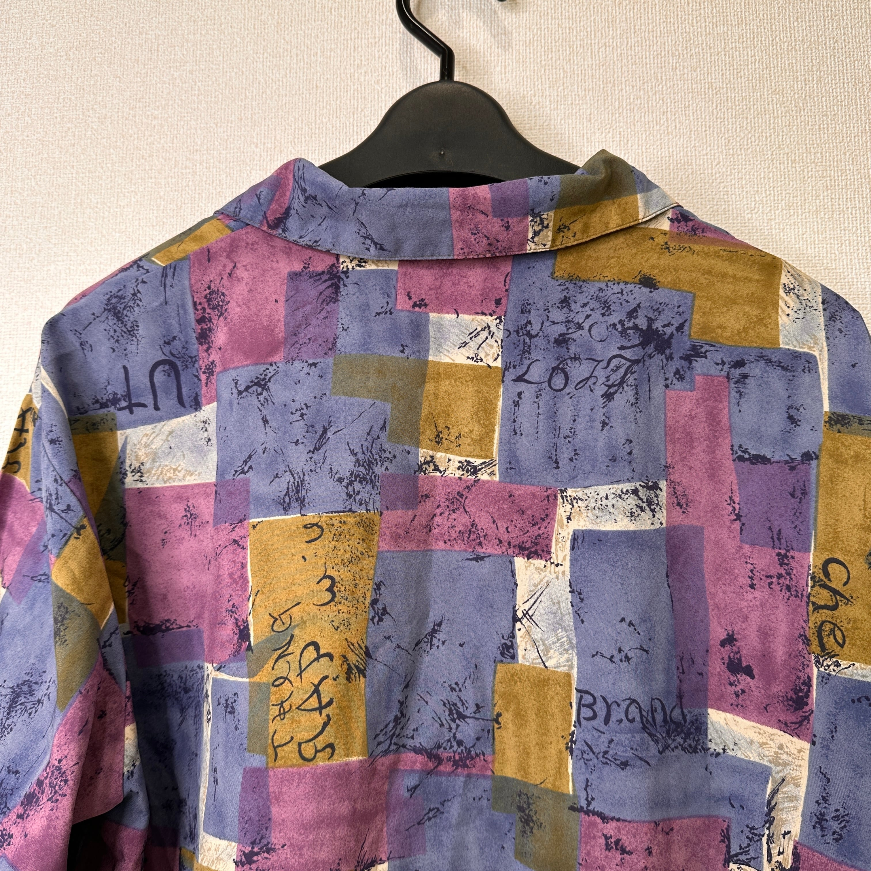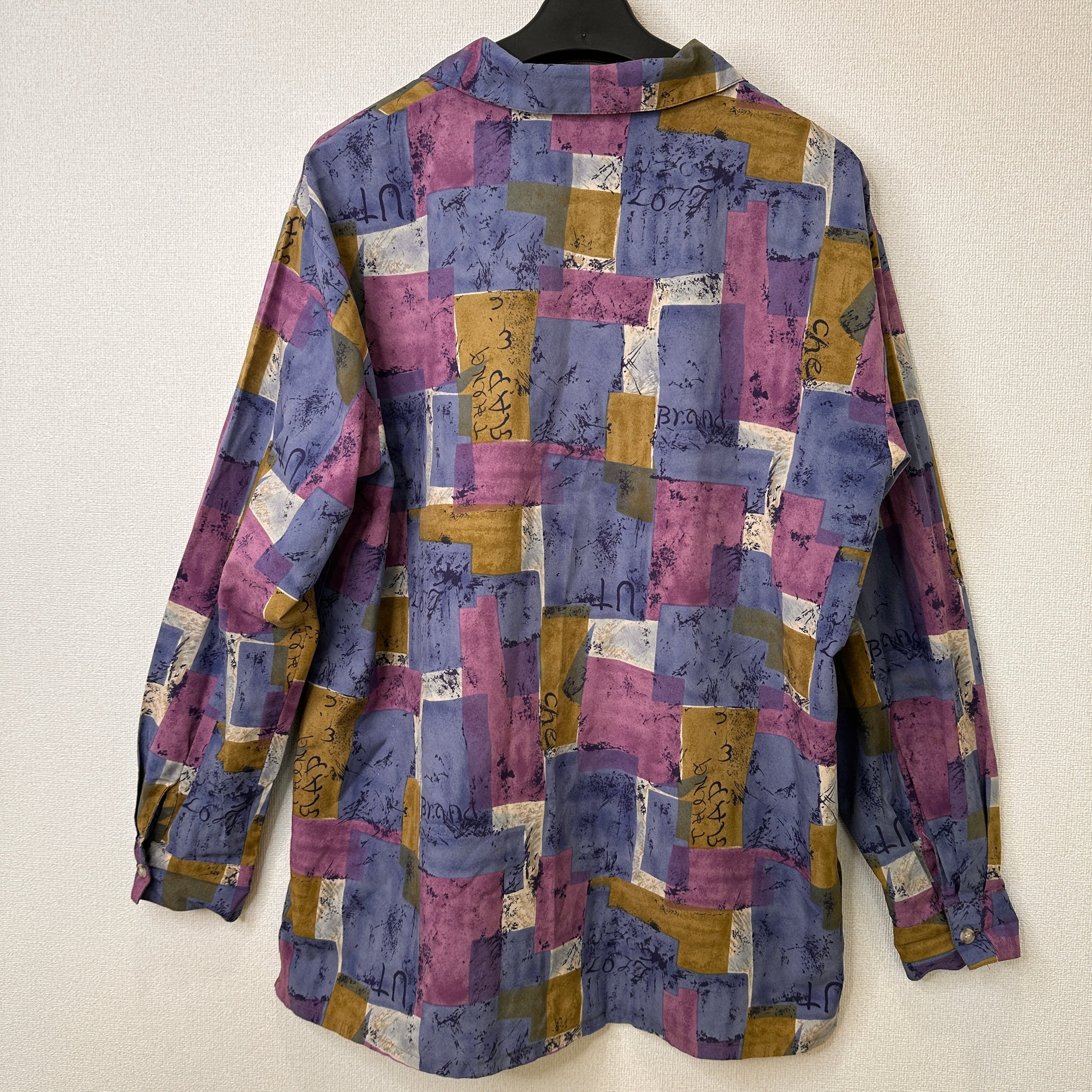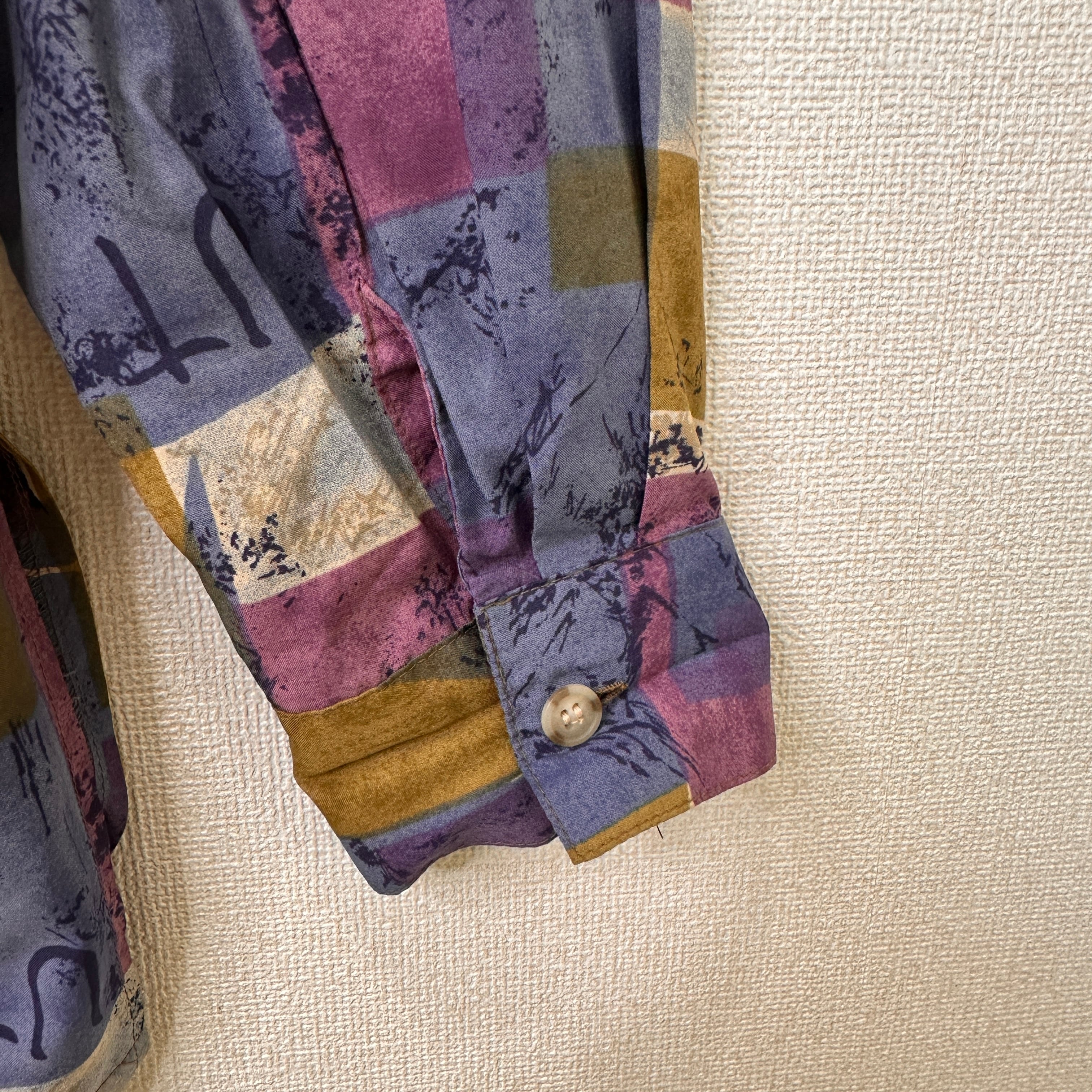 パープル、ブルー、イエロー、ブラウンなど様々な色が組み合わされた、大胆なパッチワーク風の総柄長袖シャツです。
