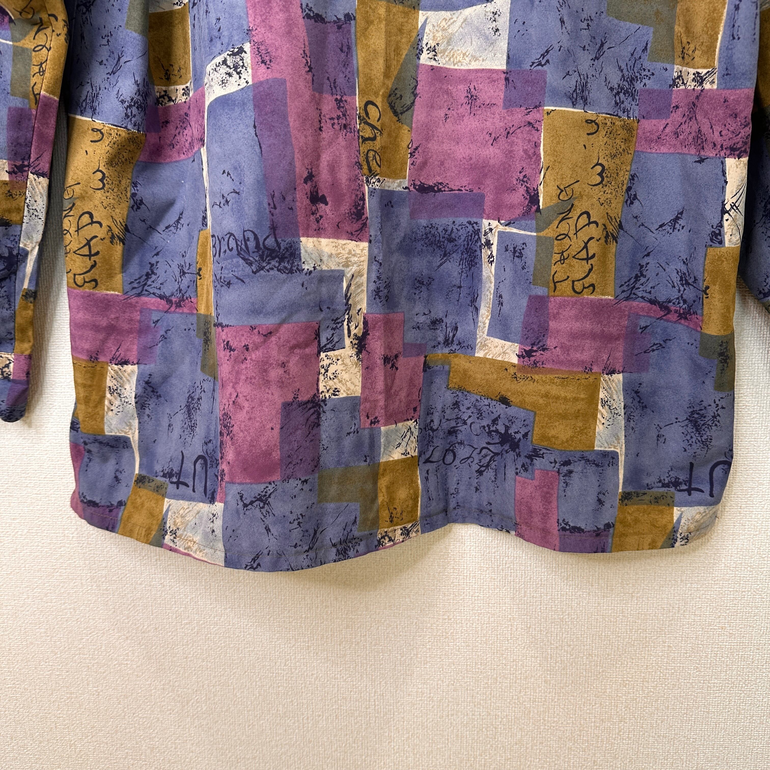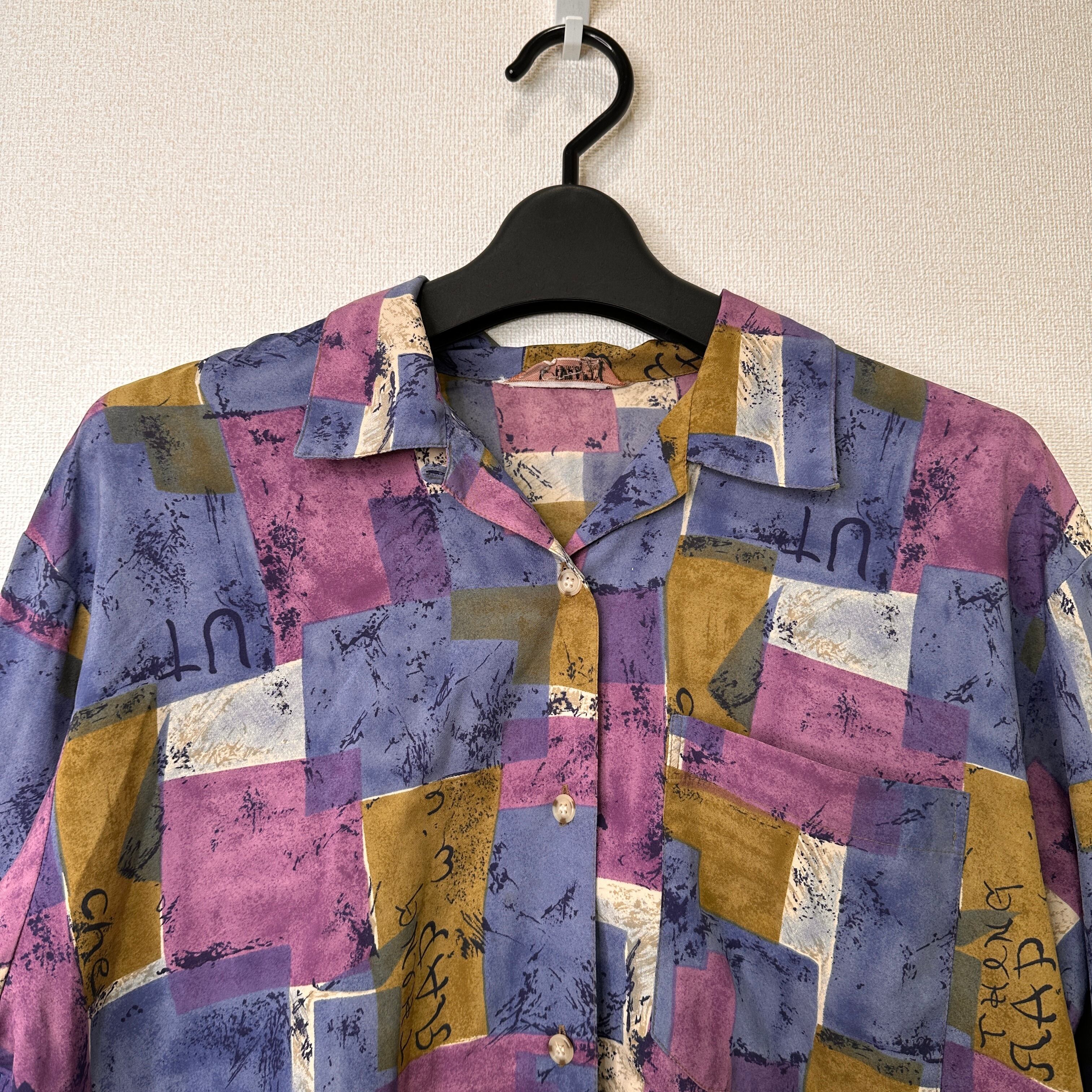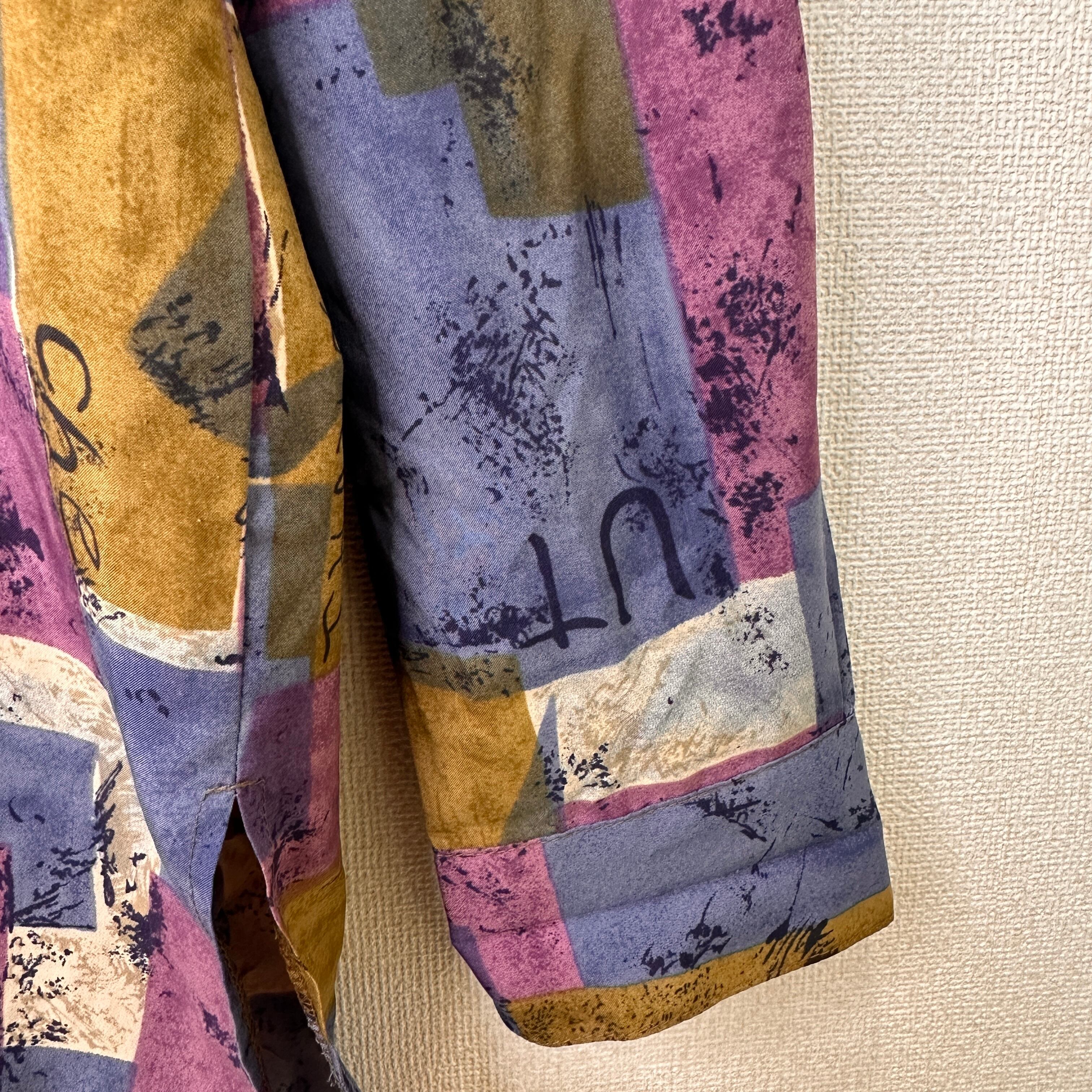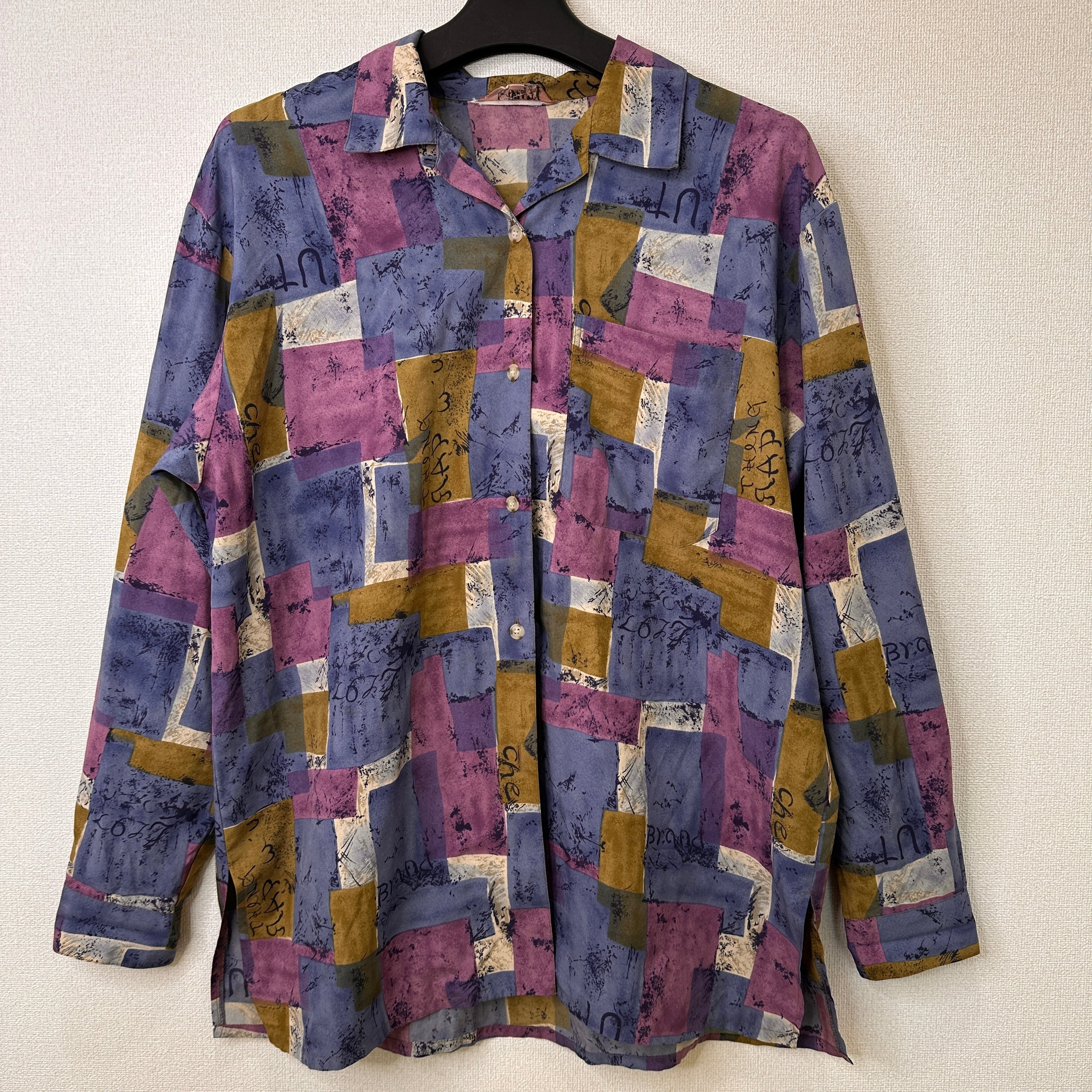 マルチカラー 総柄 長袖シャツ ブラウス パープル/ブルー/イエロー系 レトロ