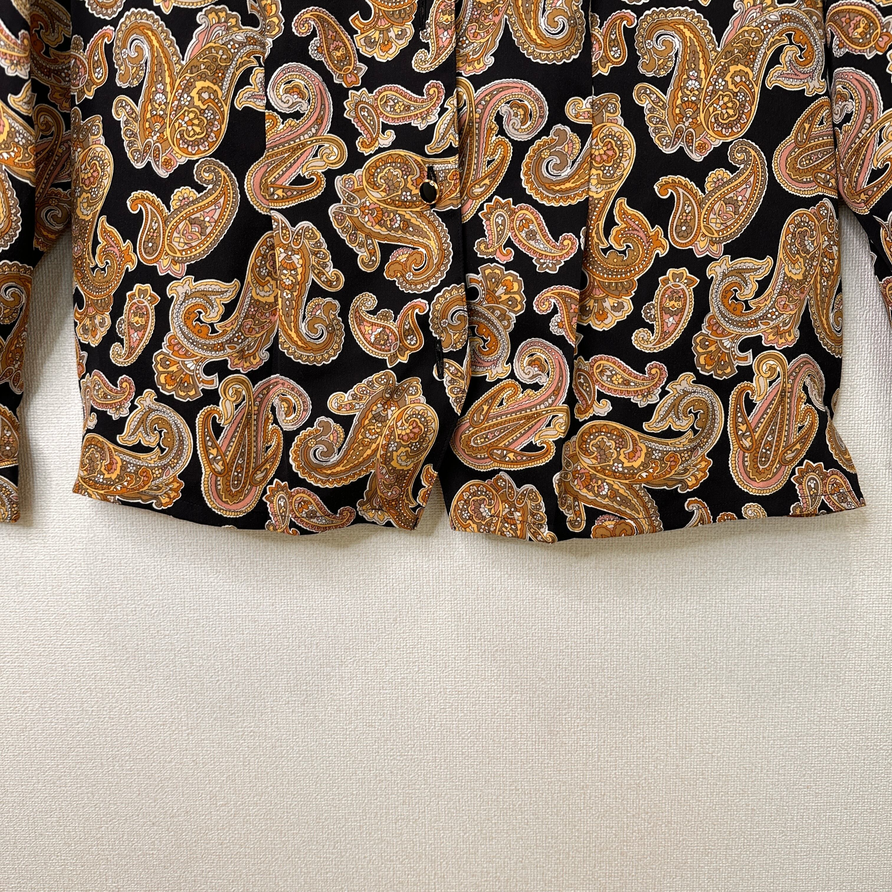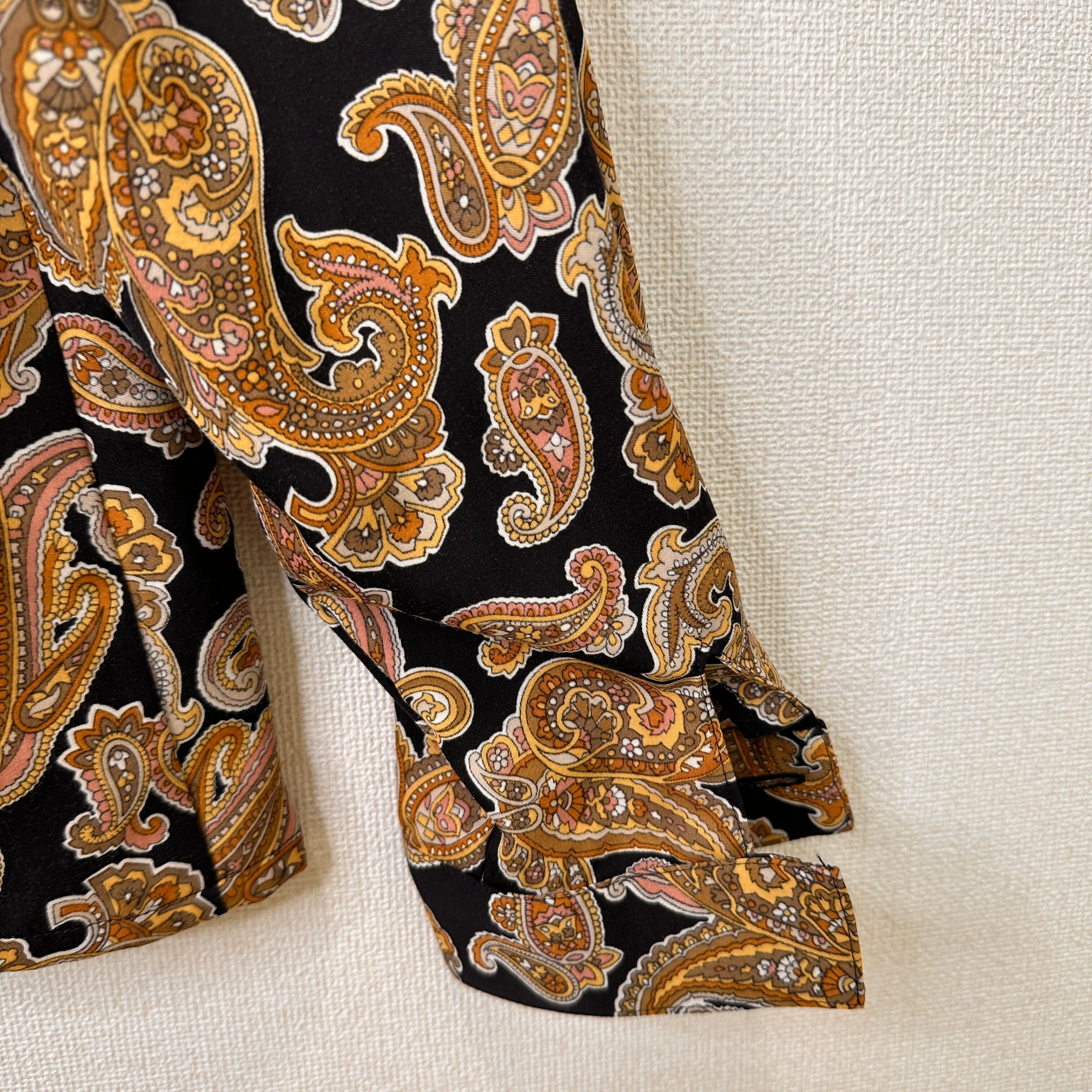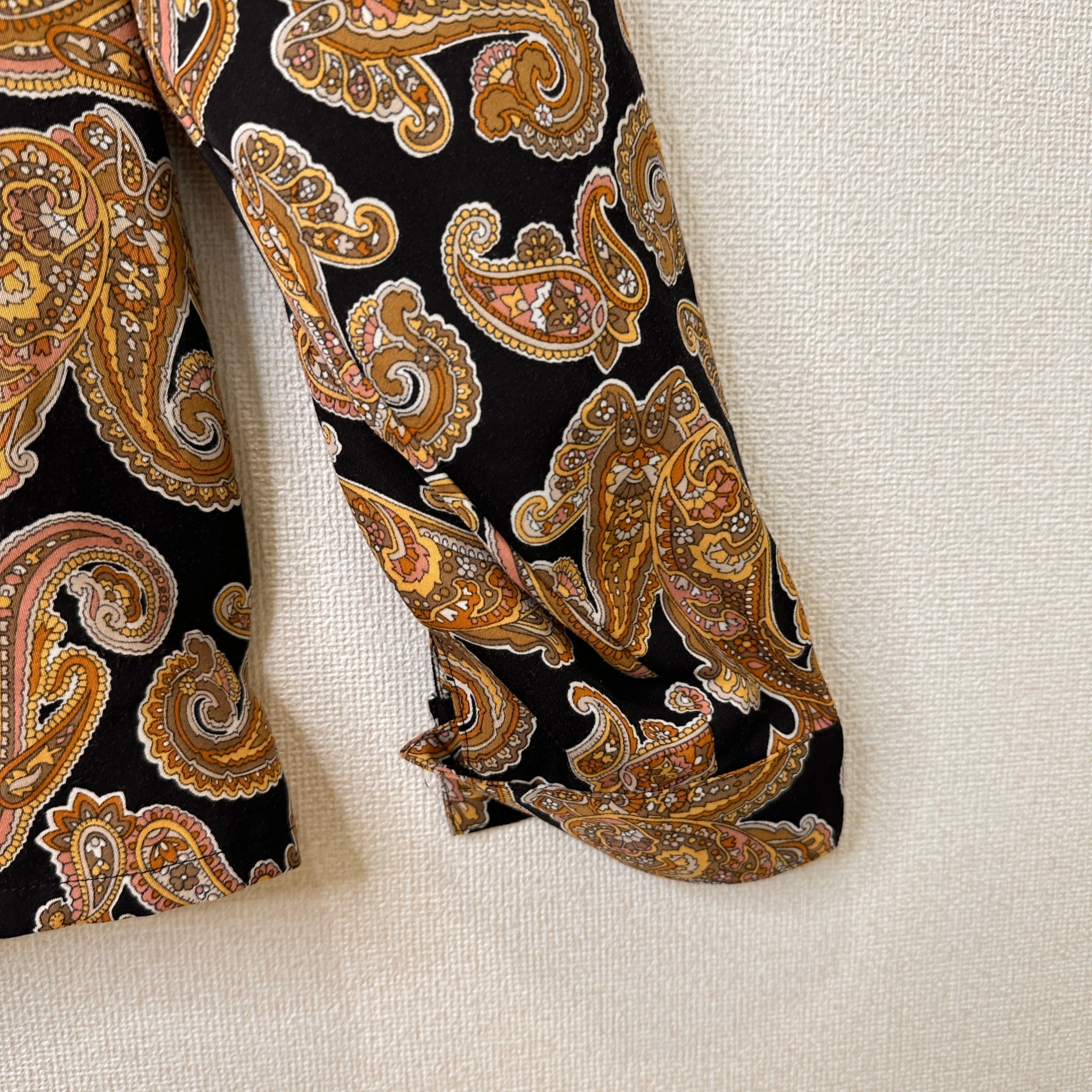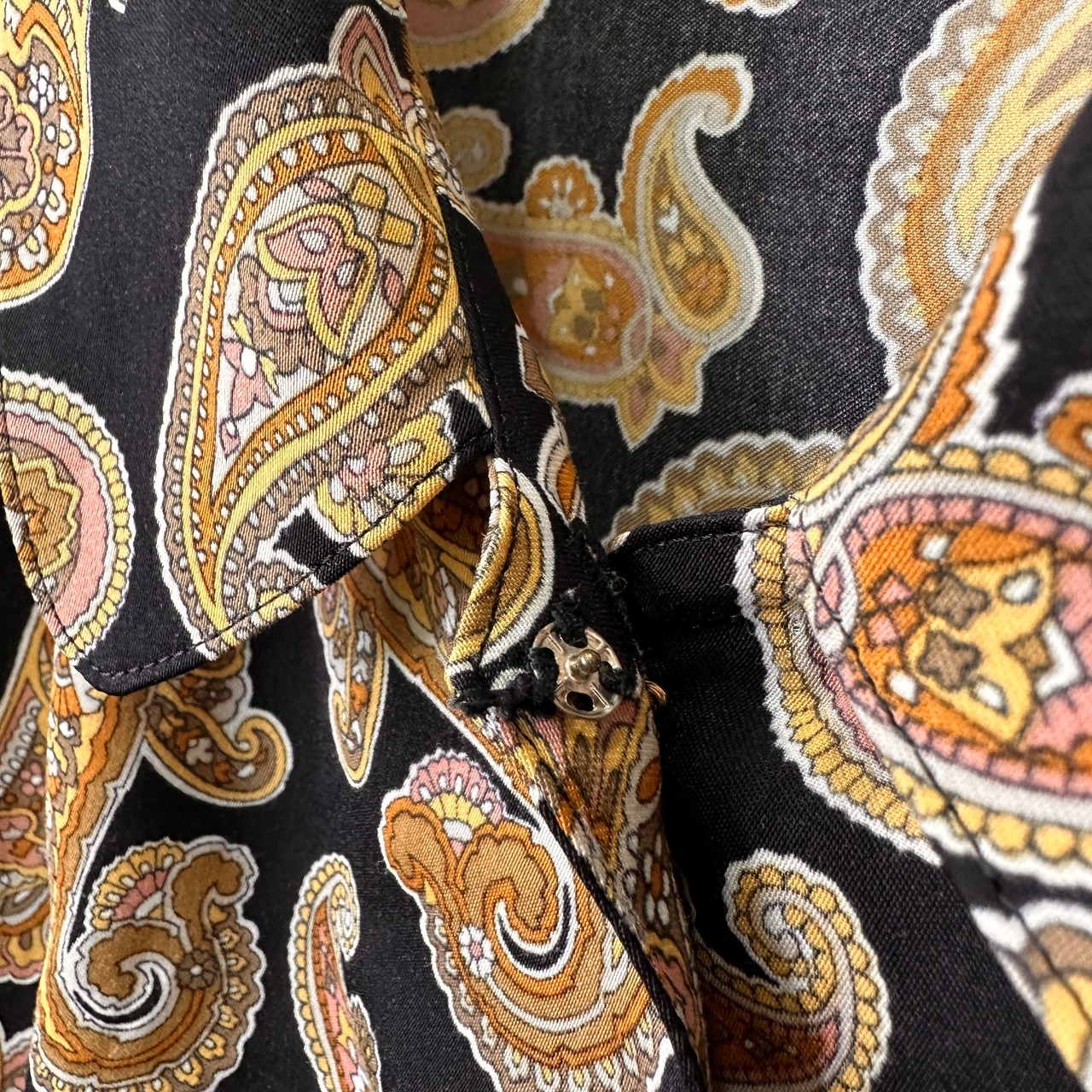 ブラックをベースに、イエロー、ブラウン、ピンクの華やかなペイズリー柄が全面にプリントされたレトロでエレガントなデザインです。