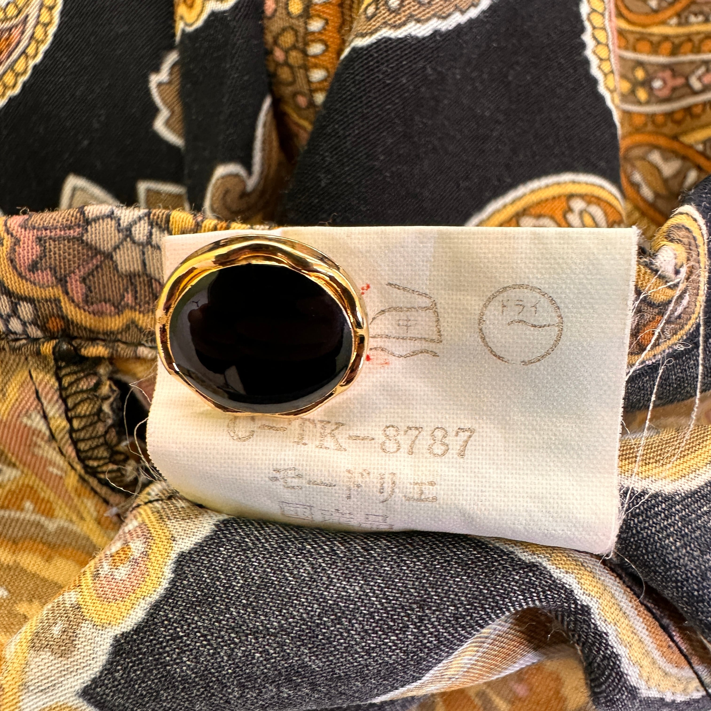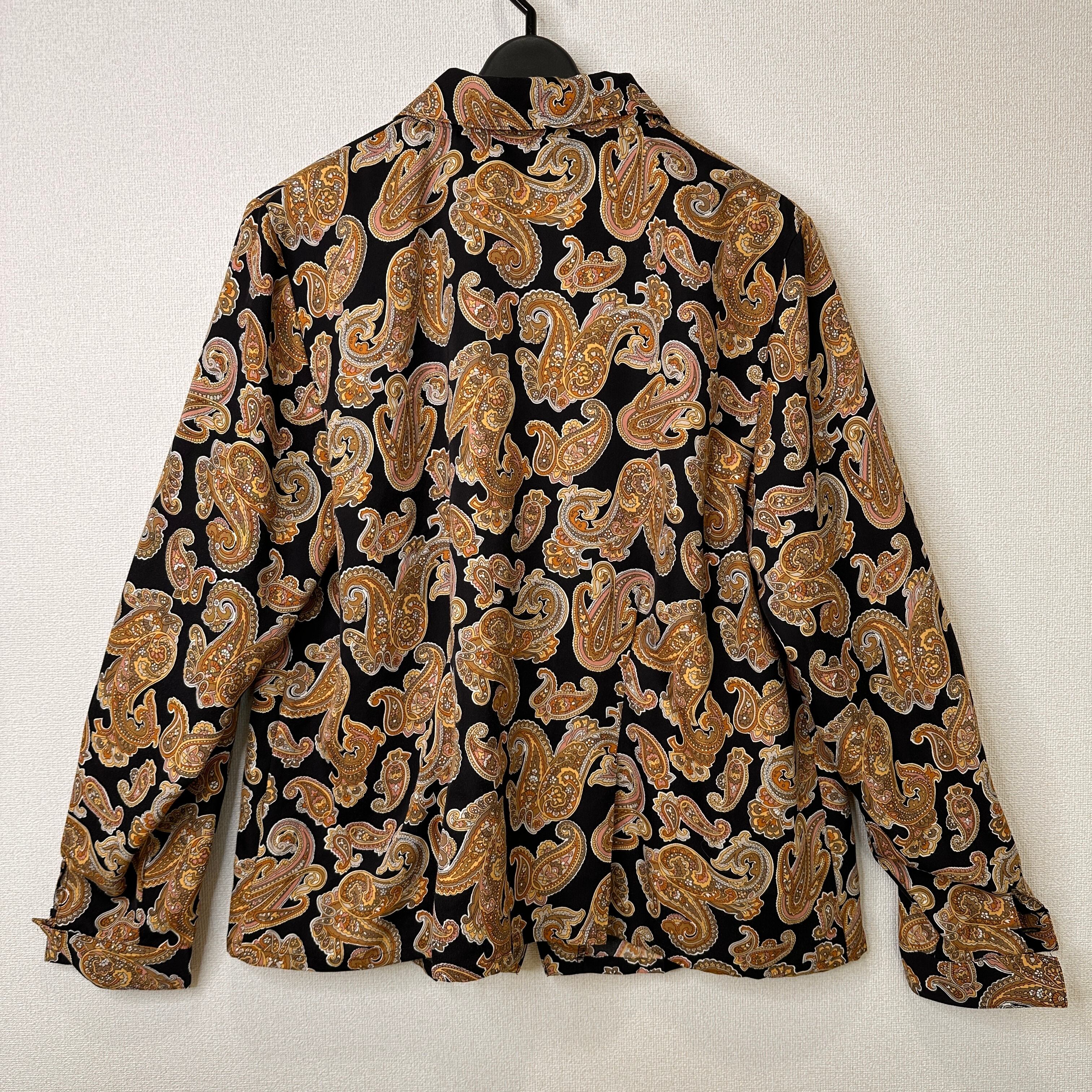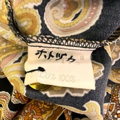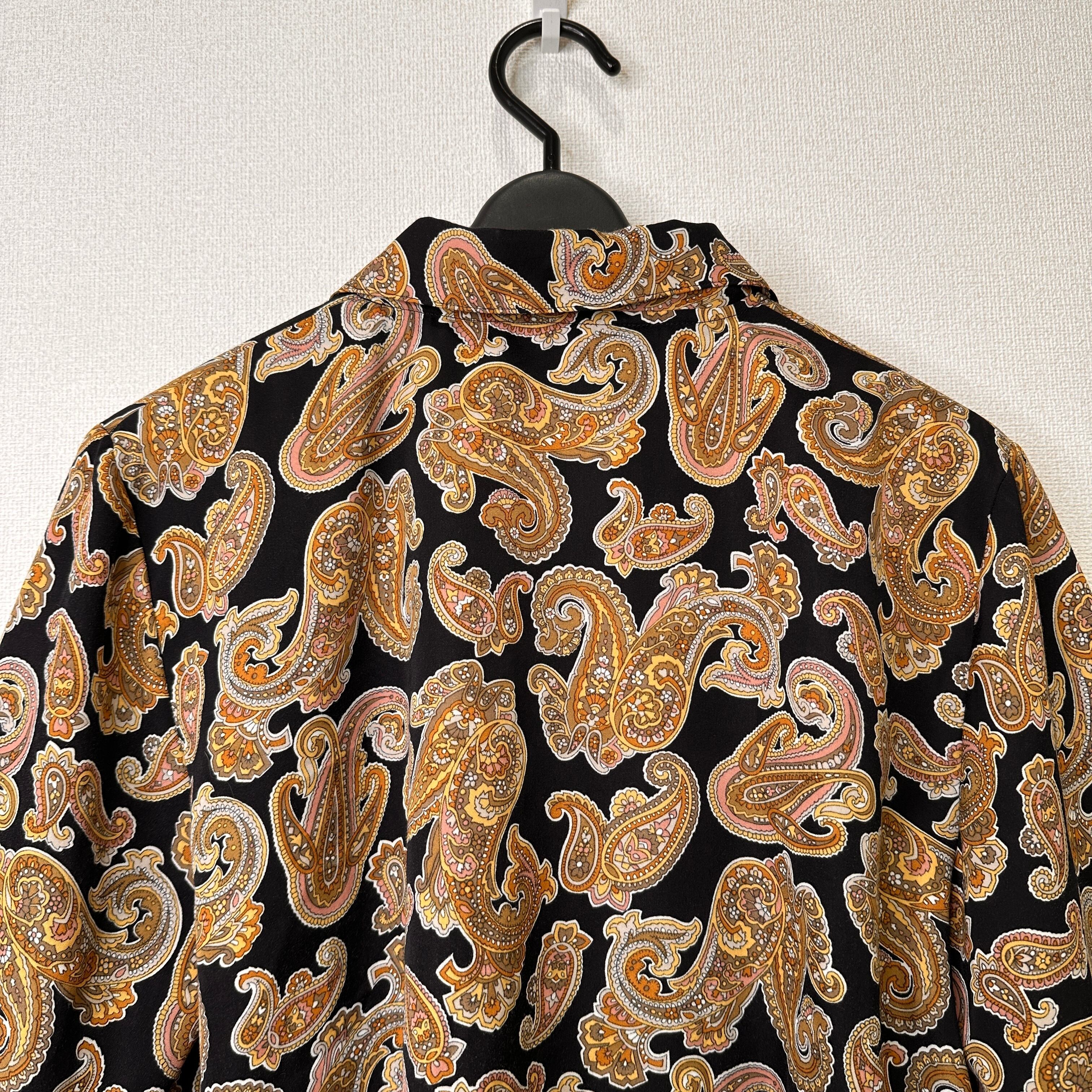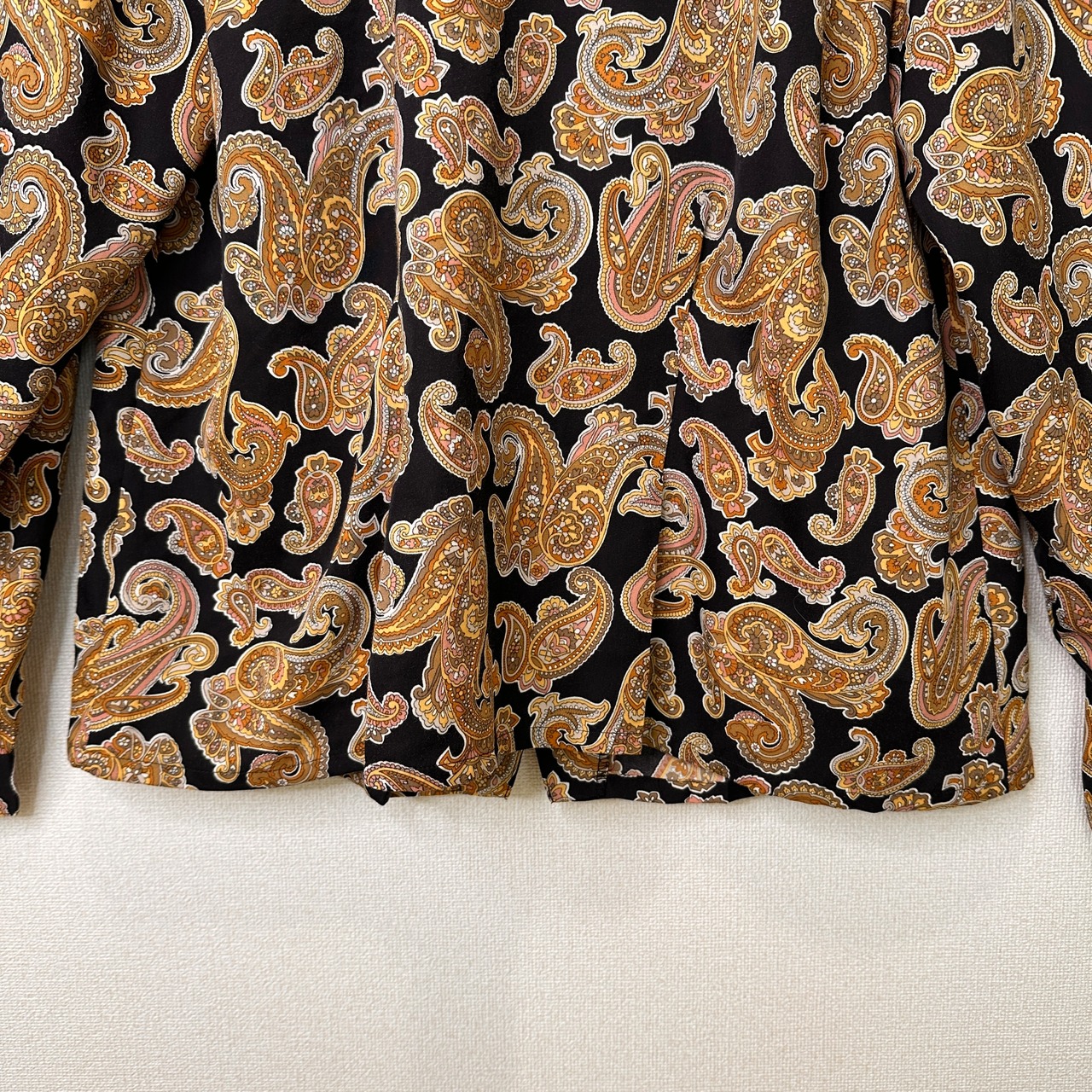 ブラックをベースに、イエロー、ブラウン、ピンクの華やかなペイズリー柄が全面にプリントされたレトロでエレガントなデザインです。