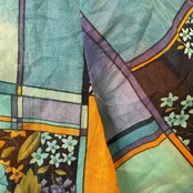 チェック柄、ストライプ、花柄が組み合わされたパッチワークのようなデザインが特徴です。