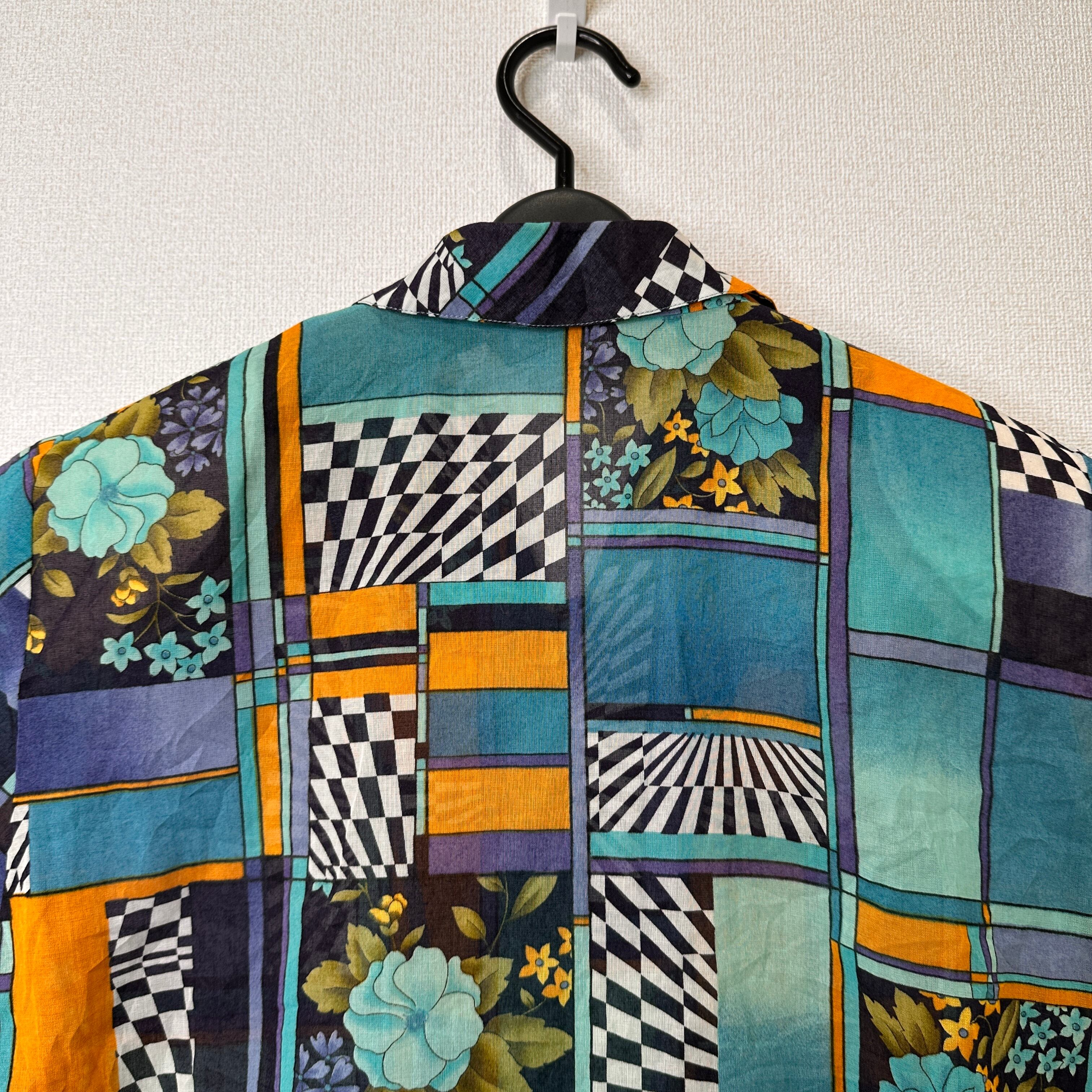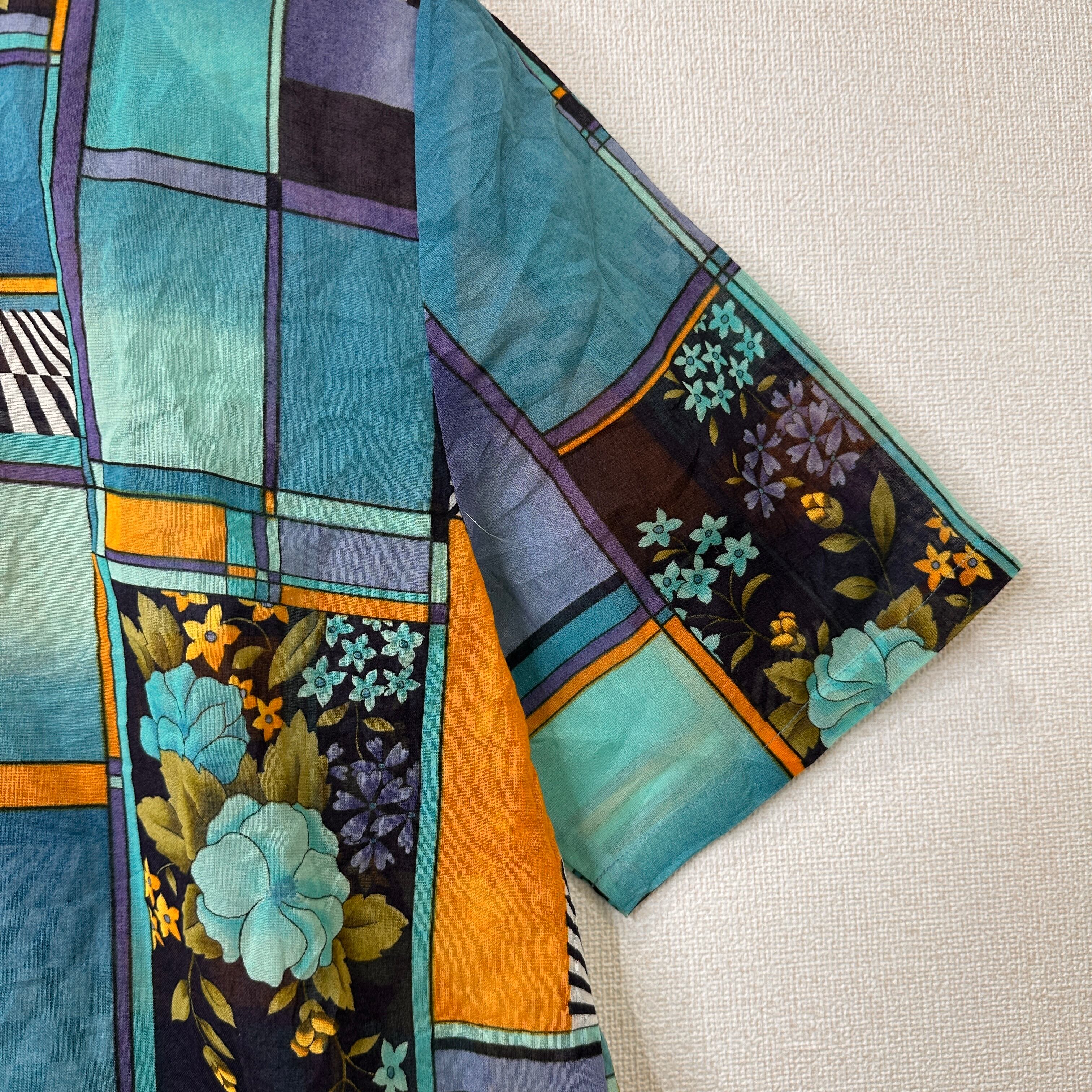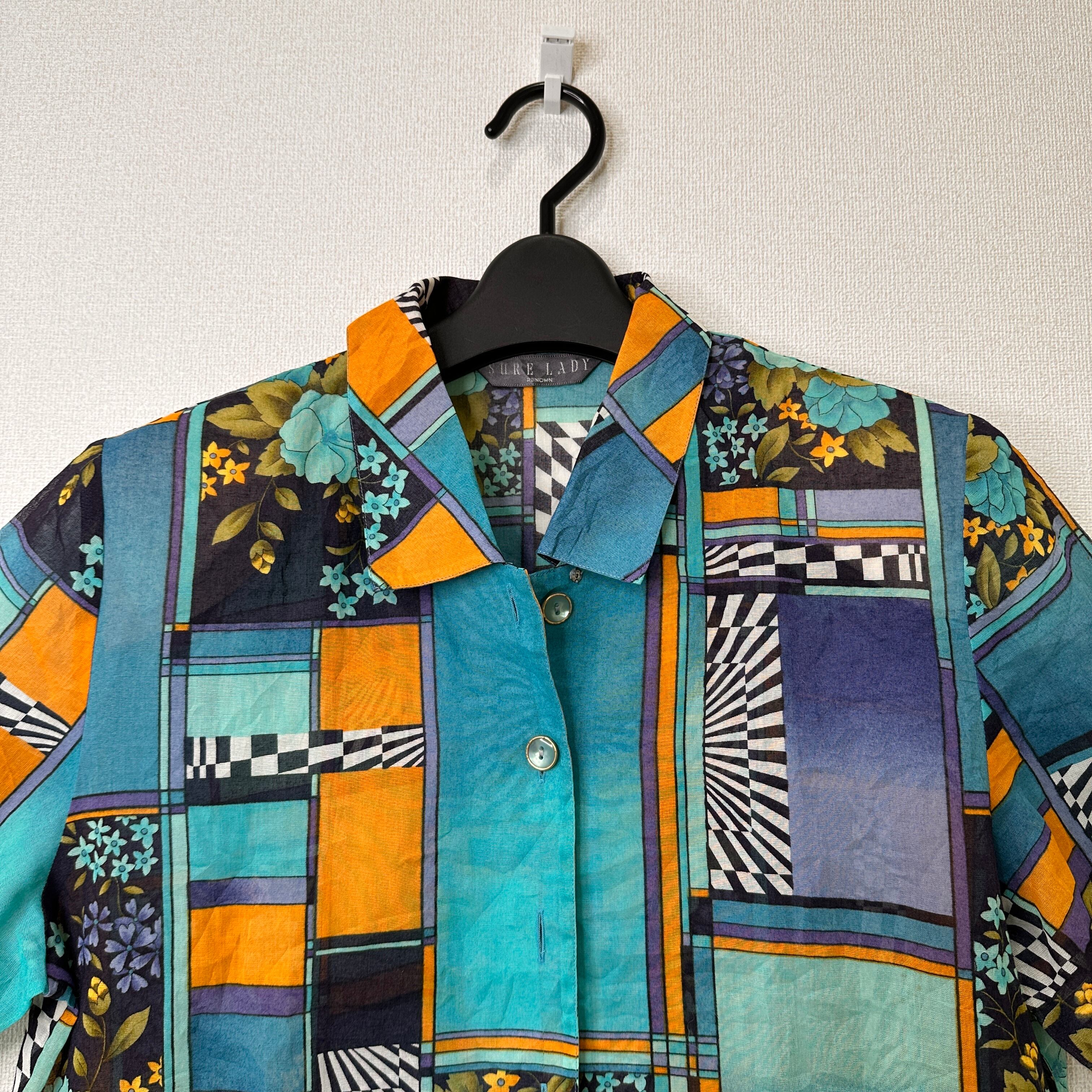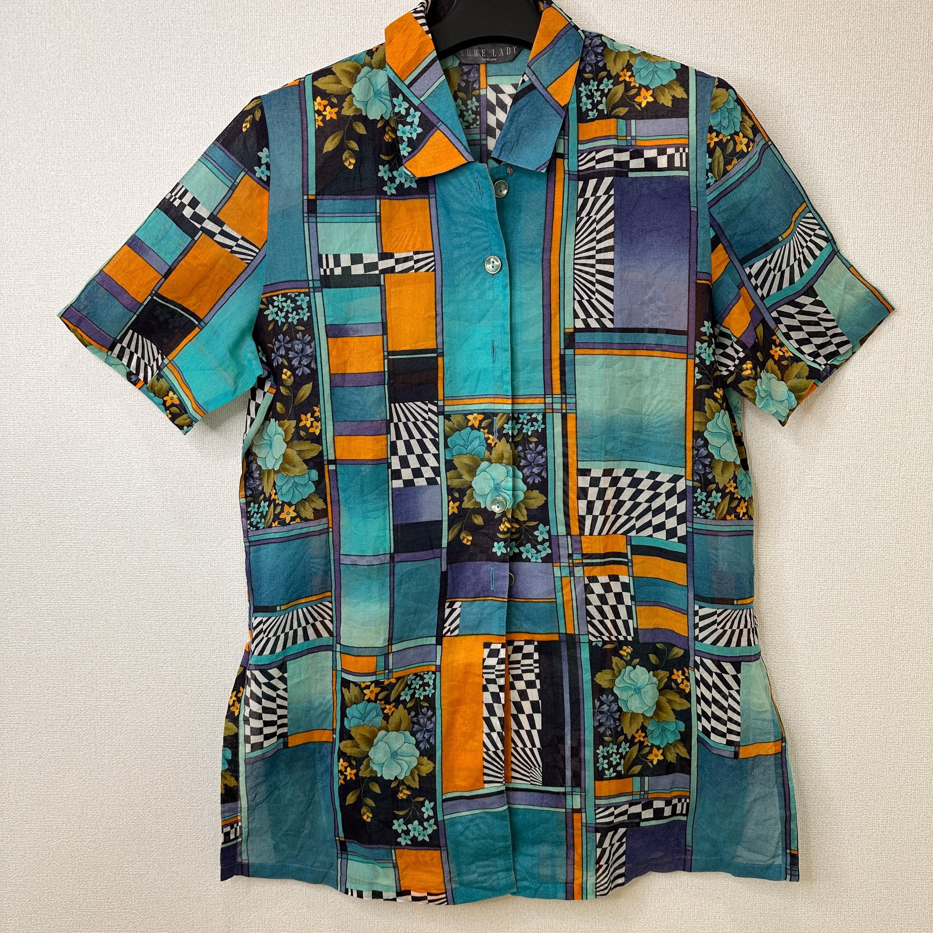 ブルー、ターコイズ、オレンジ、パープルなどを基調としたレトロで個性的なアート柄の半袖シャツ/ブラウスです。