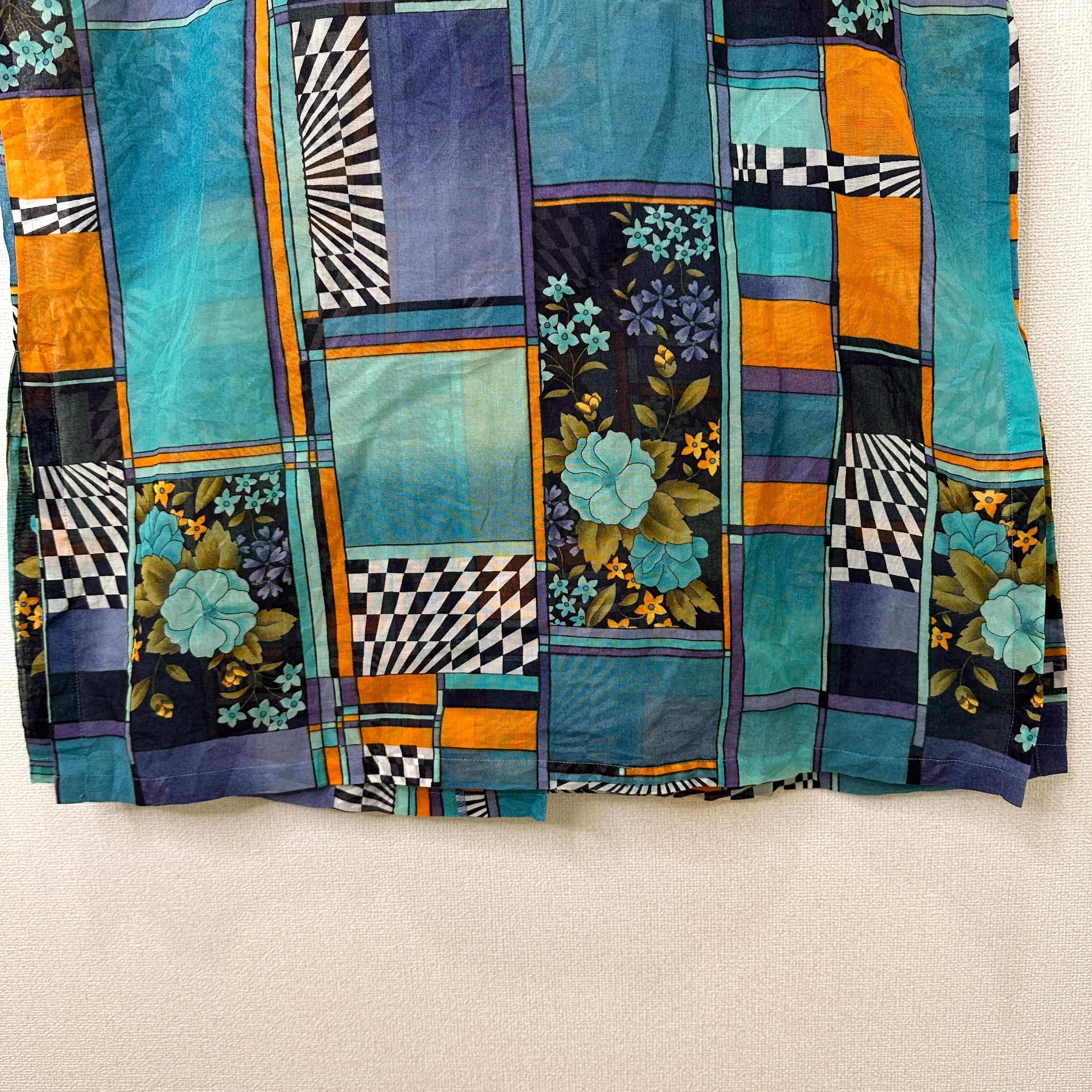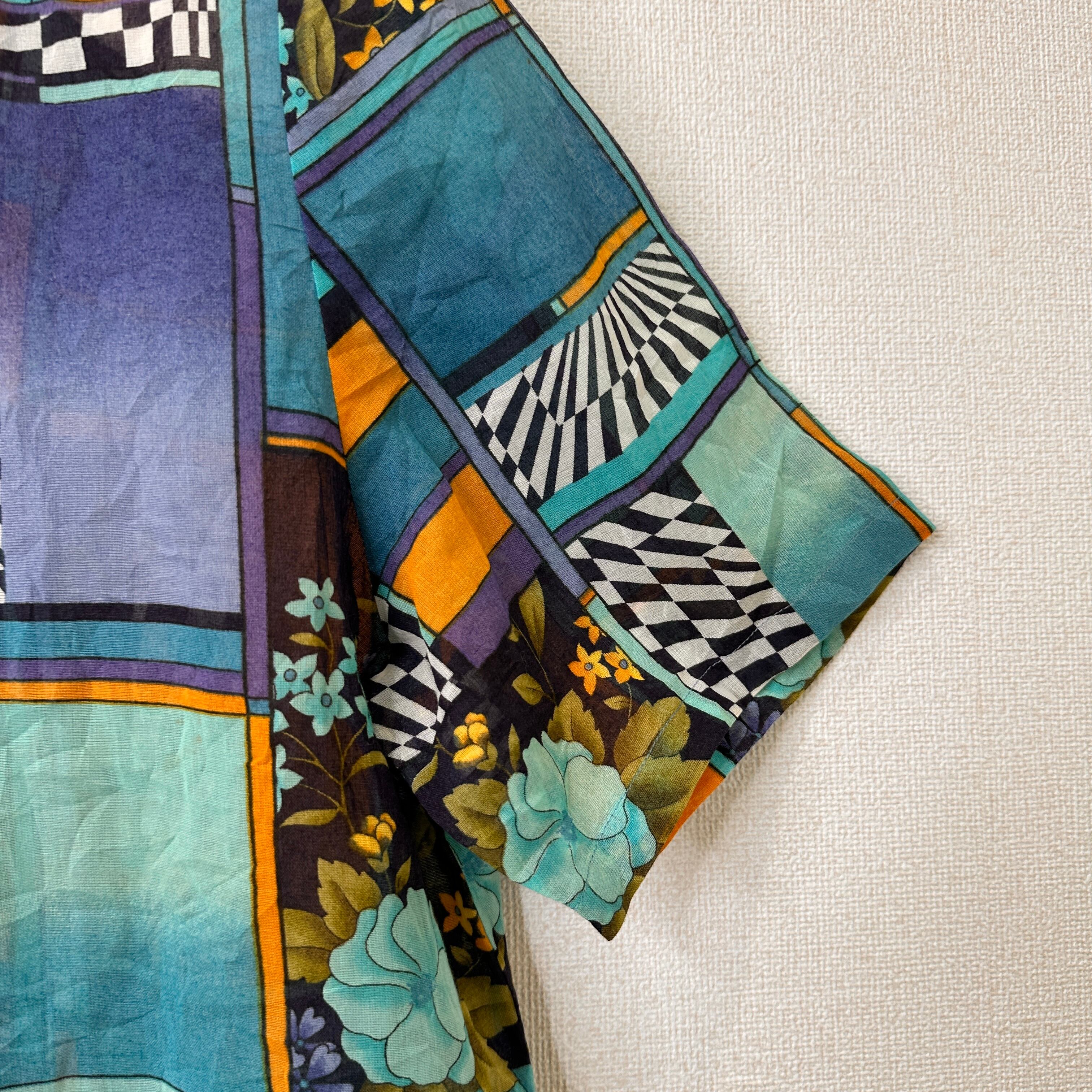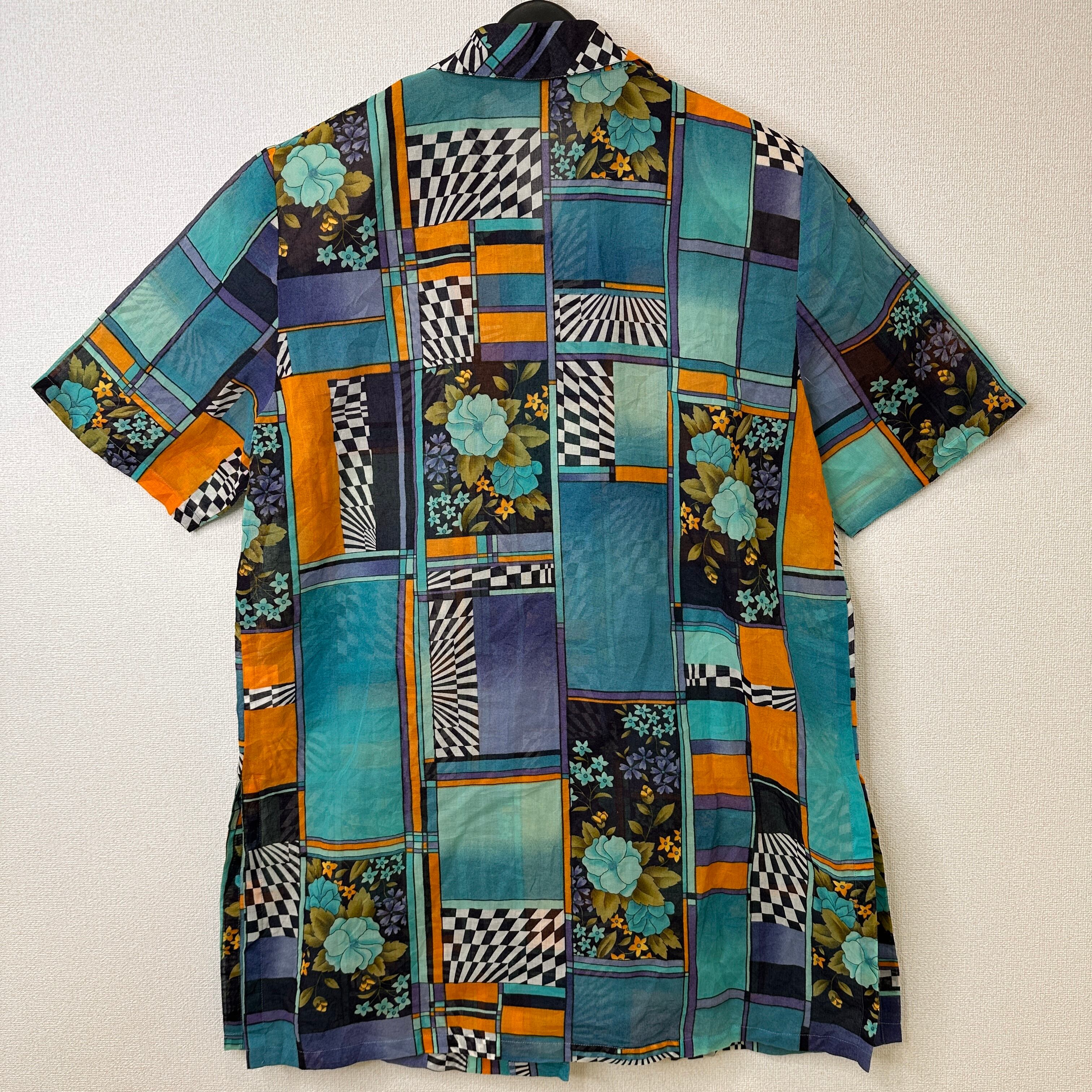 ブルー、ターコイズ、オレンジ、パープルなどを基調としたレトロで個性的なアート柄の半袖シャツ/ブラウスです。
