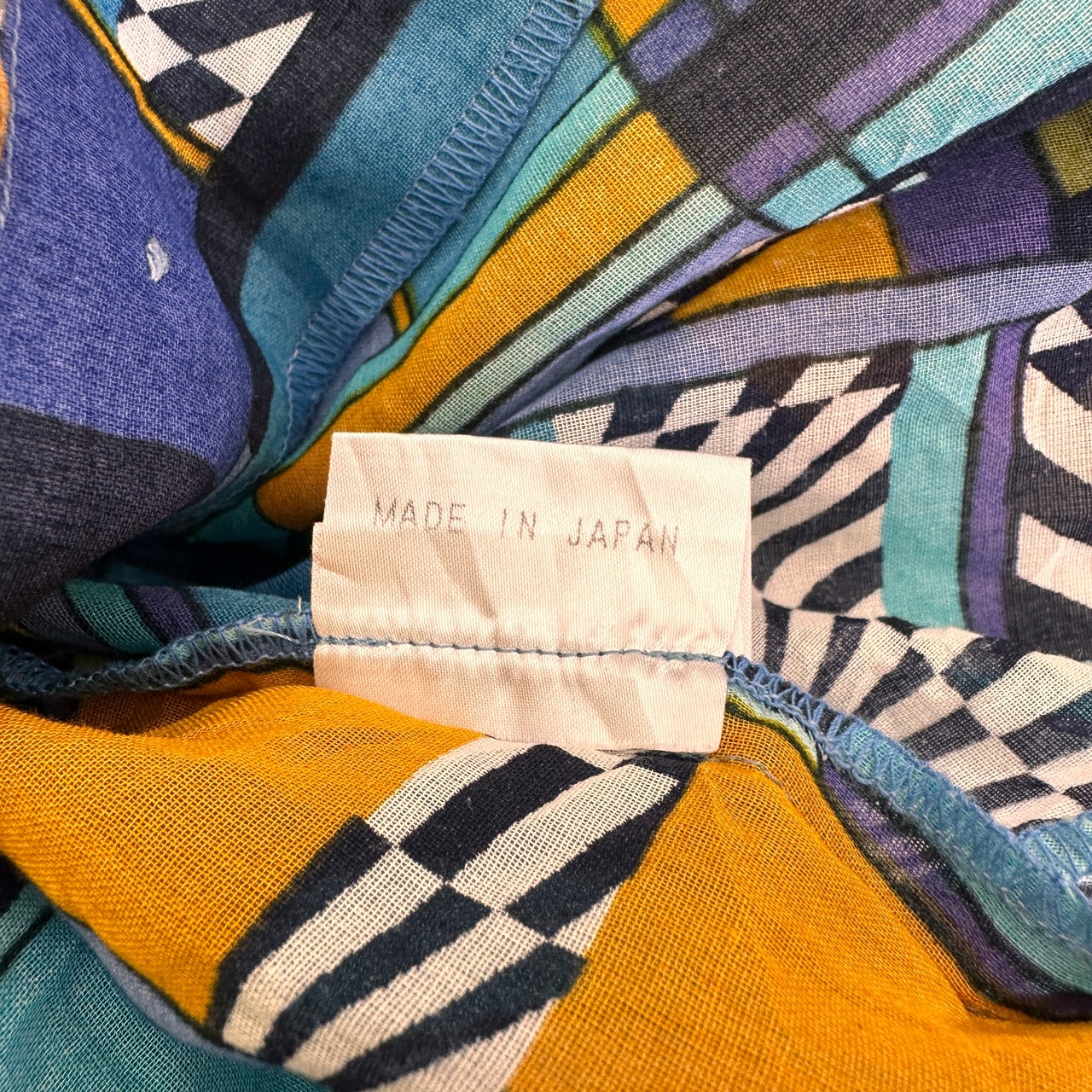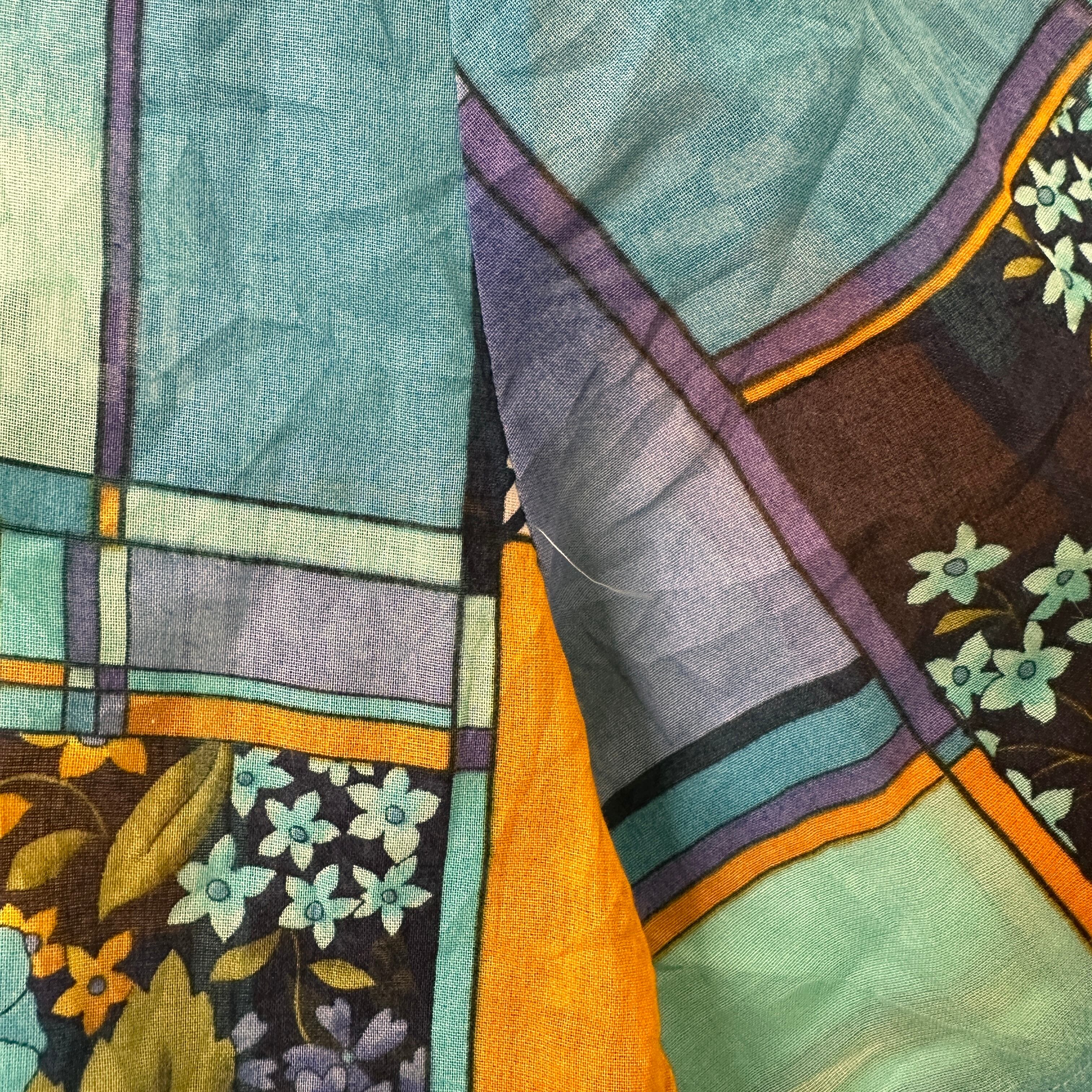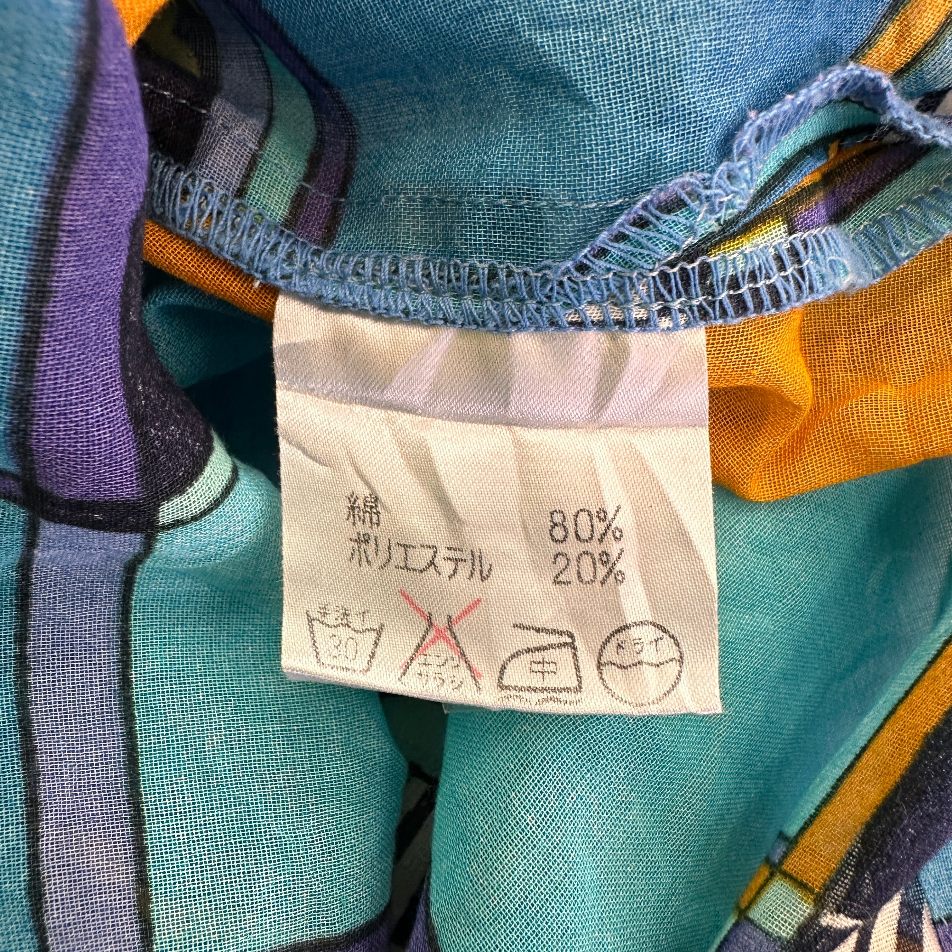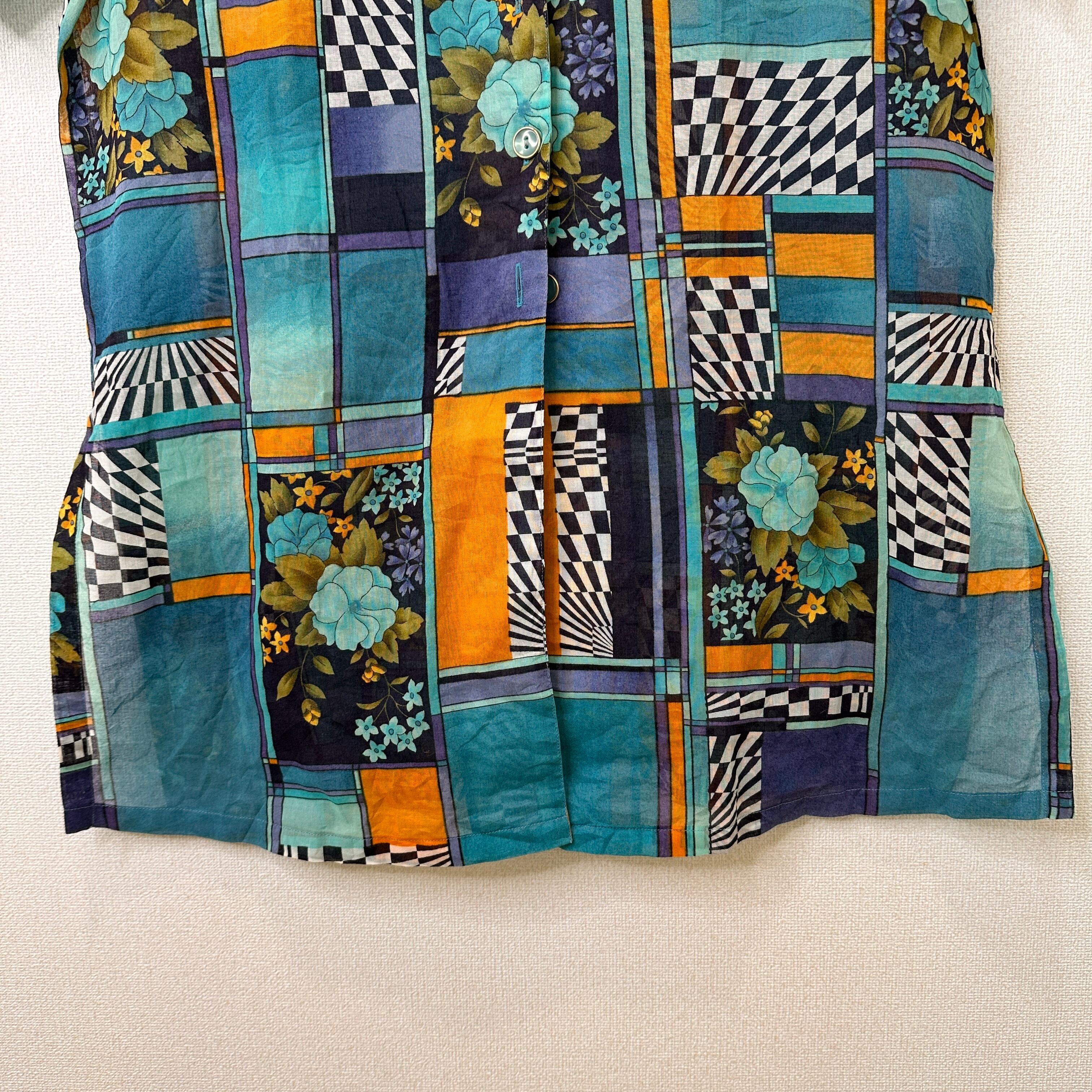 ブルー、ターコイズ、オレンジ、パープルなどを基調としたレトロで個性的なアート柄の半袖シャツ/ブラウスです。