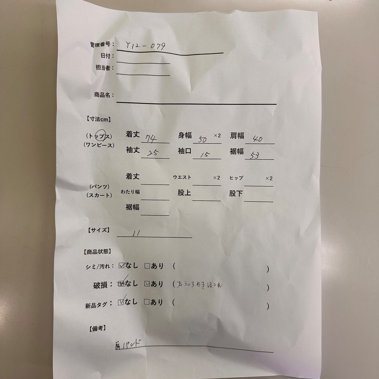 破損: あり (右後ろ脇ほつれあり)