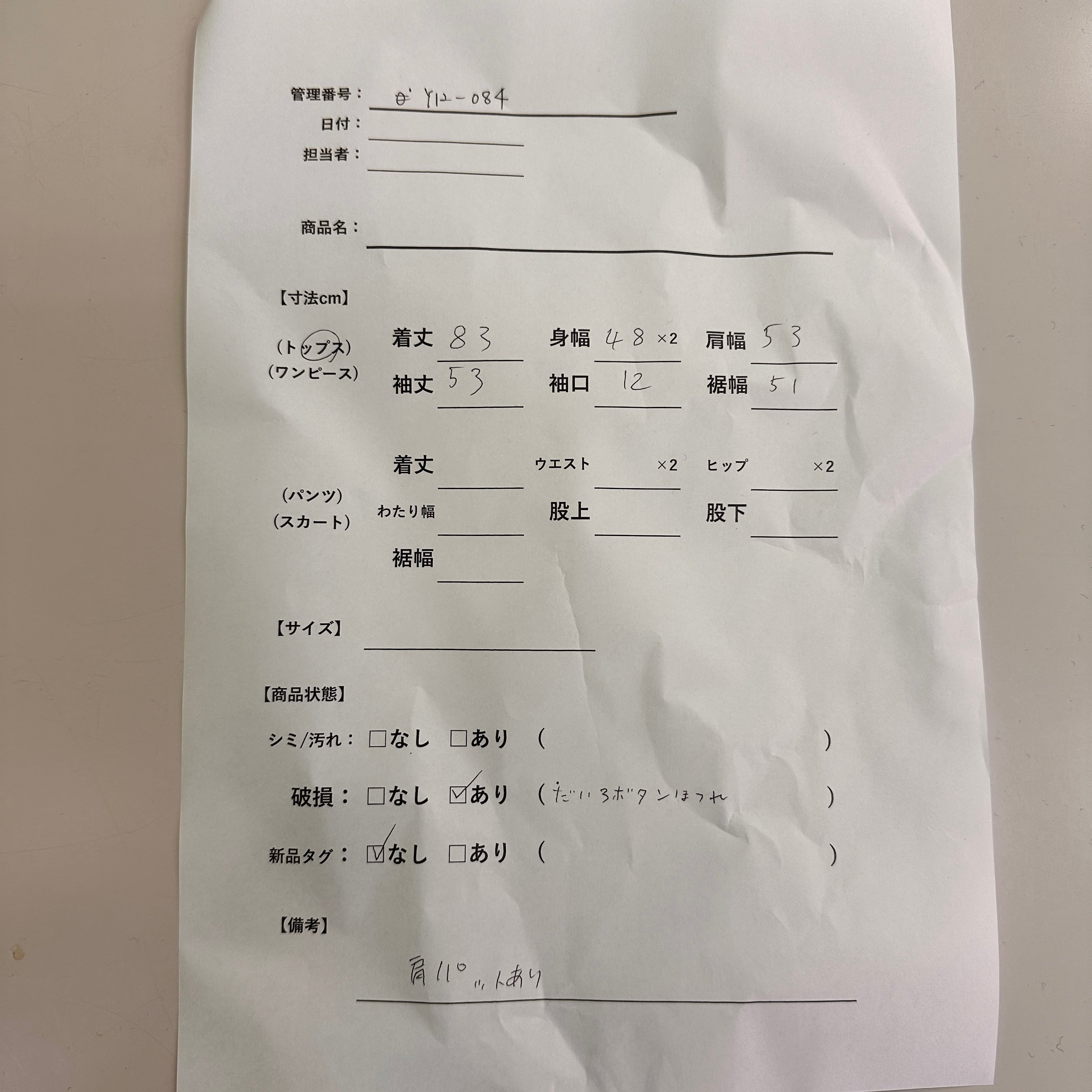 管理番号:Y12-084 #てまいらずアパレル商品一覧